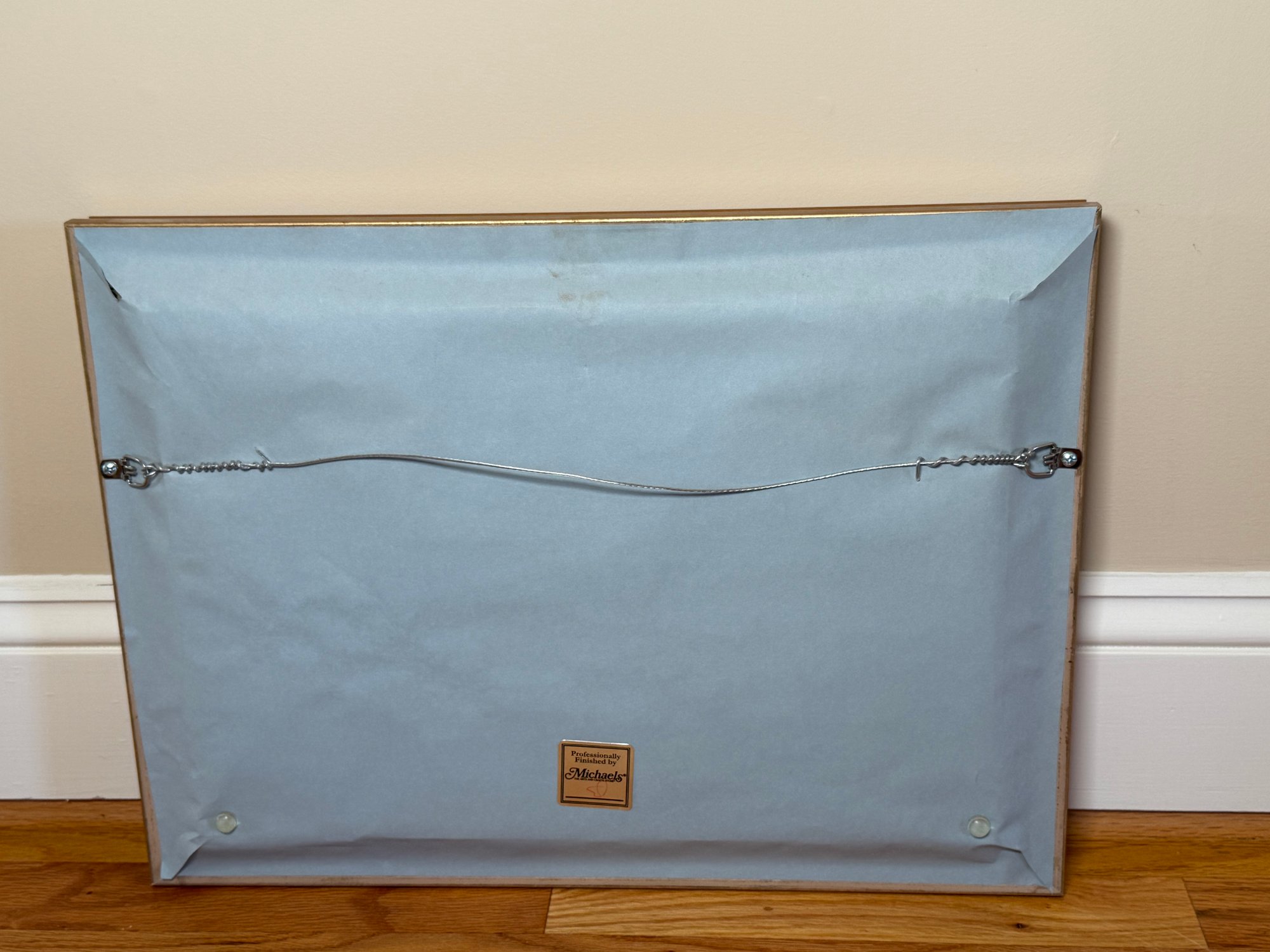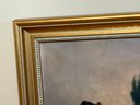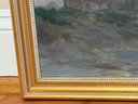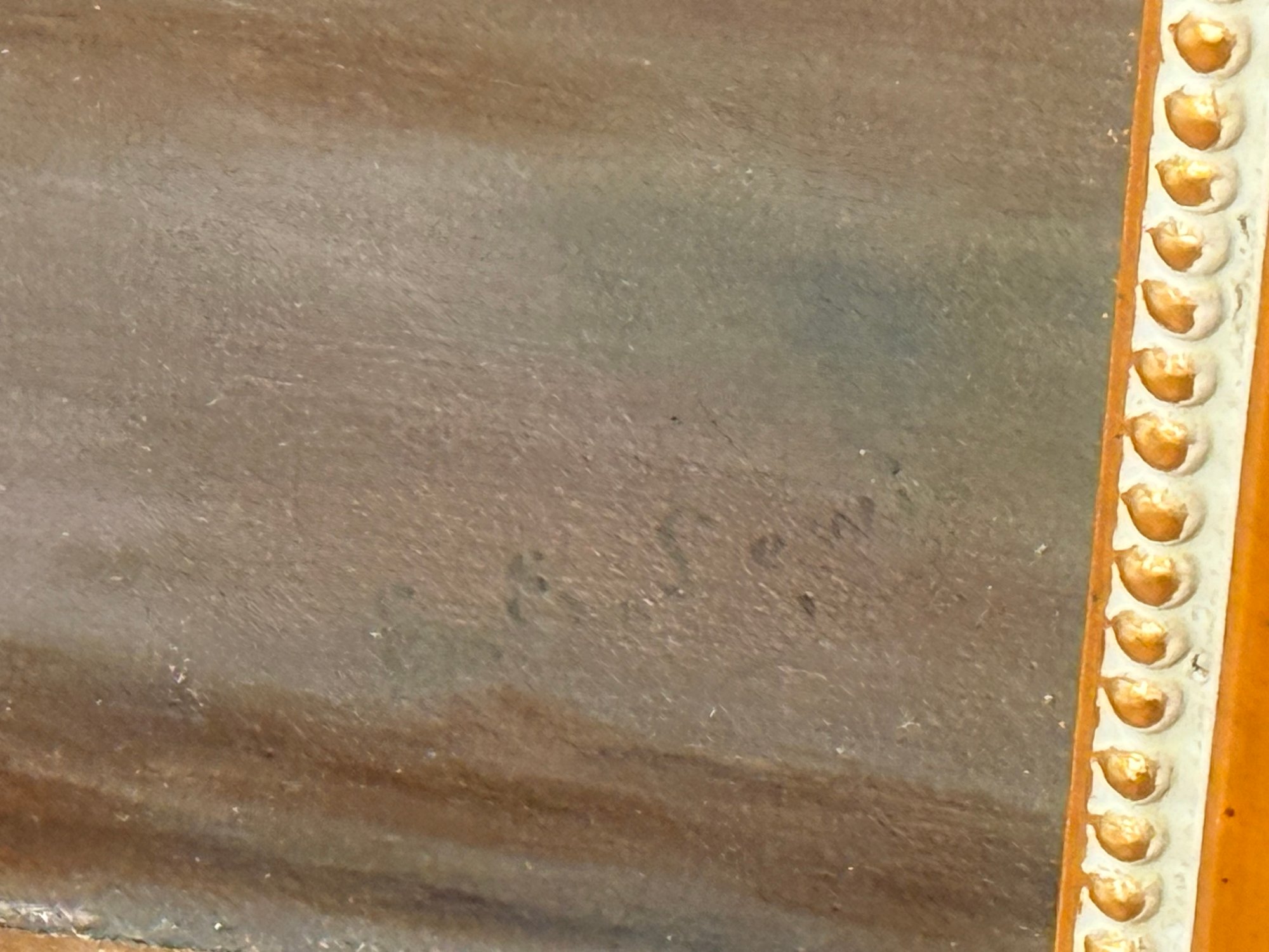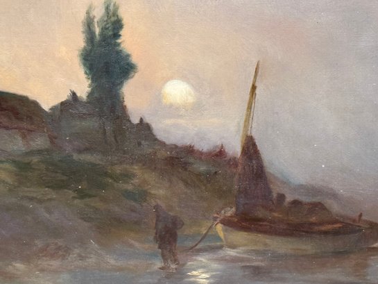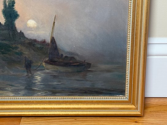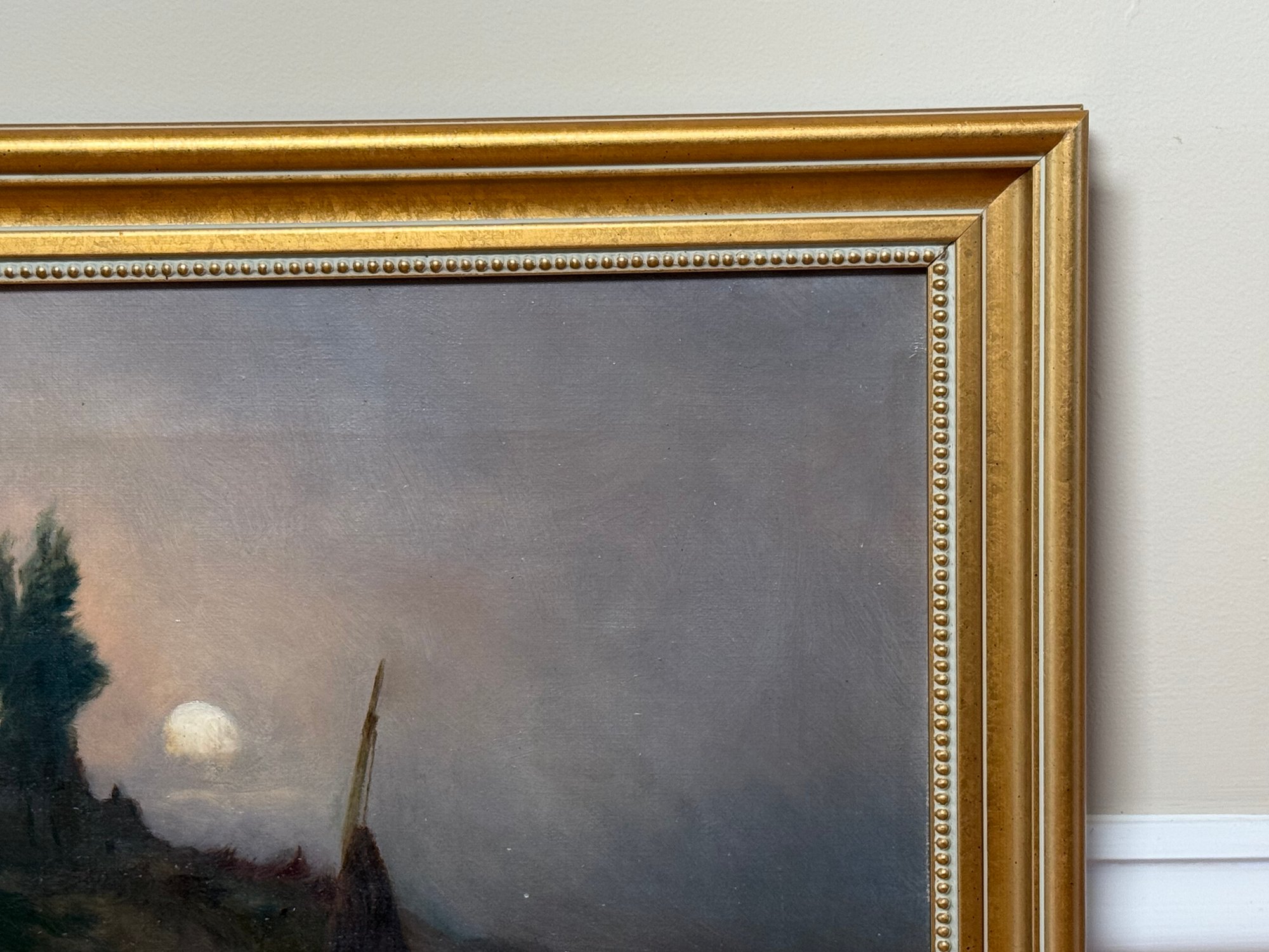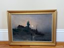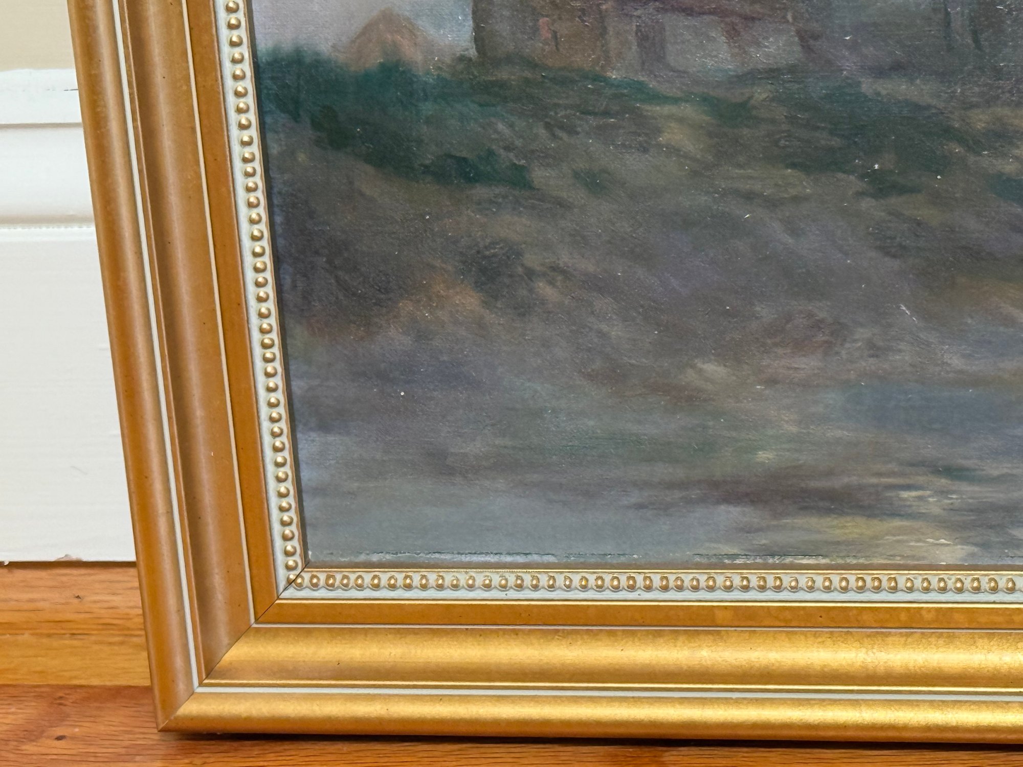 This oil painting depicts a landscape at dusk with a body of water, boat and homes in the background. It is signed bottom right hand corner. In a pretty gold toned frame.