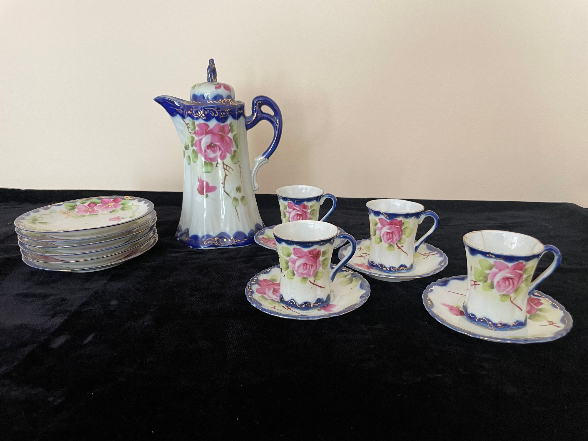 Fine China Coffee/Tea Set In Cobalt Blue And Roses Japan
