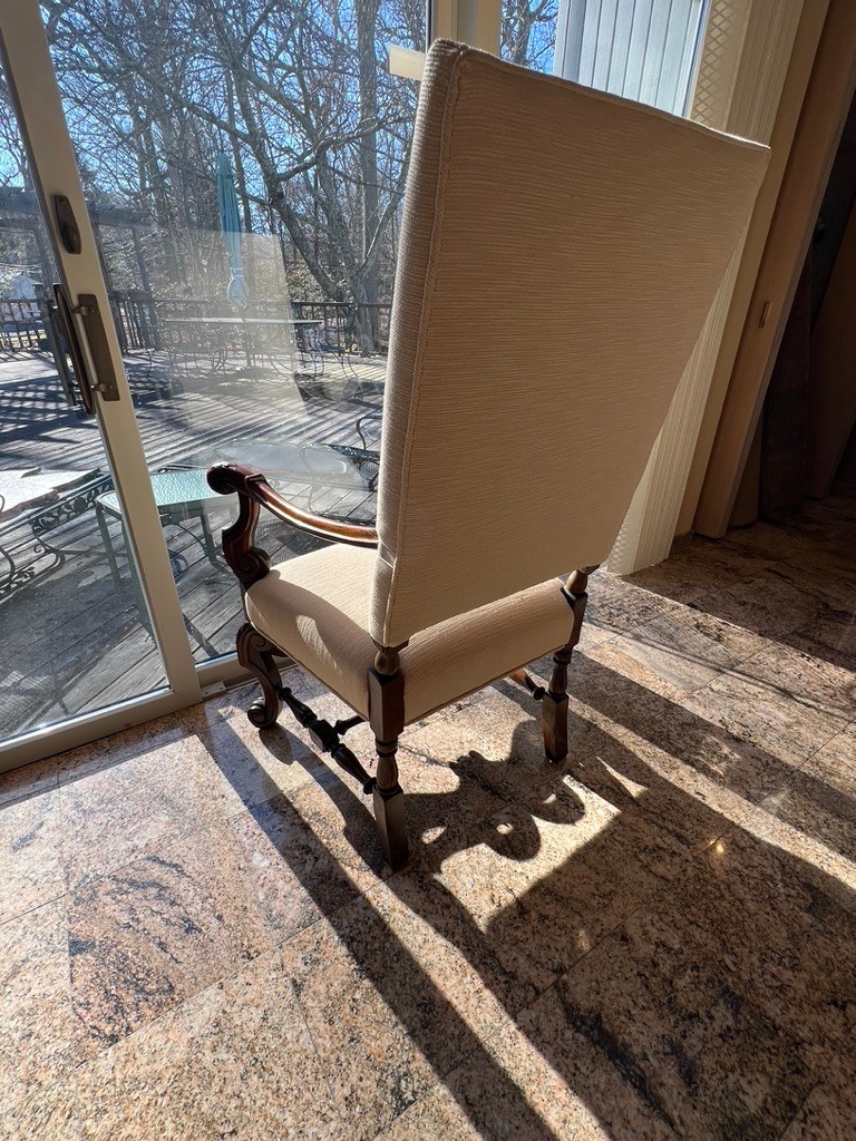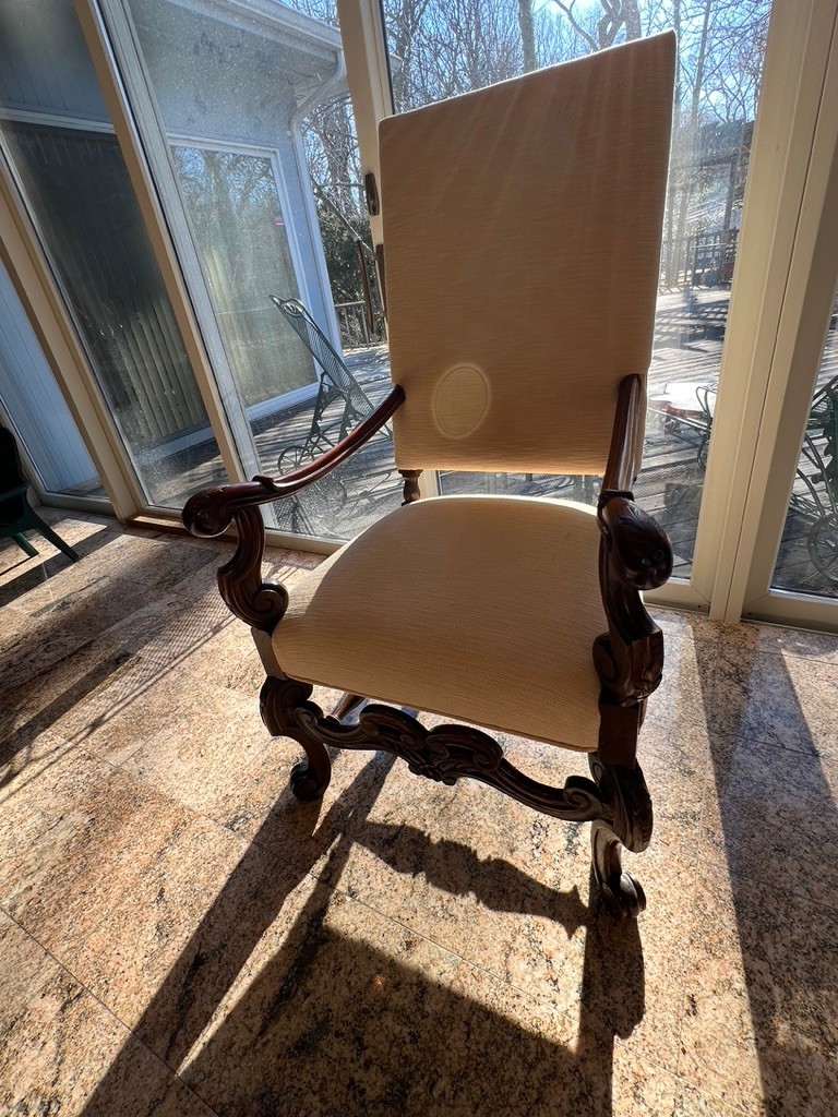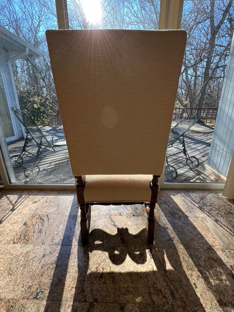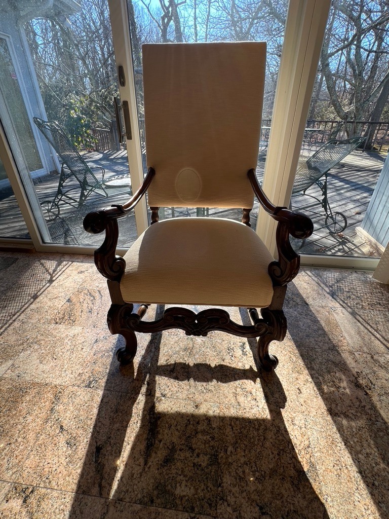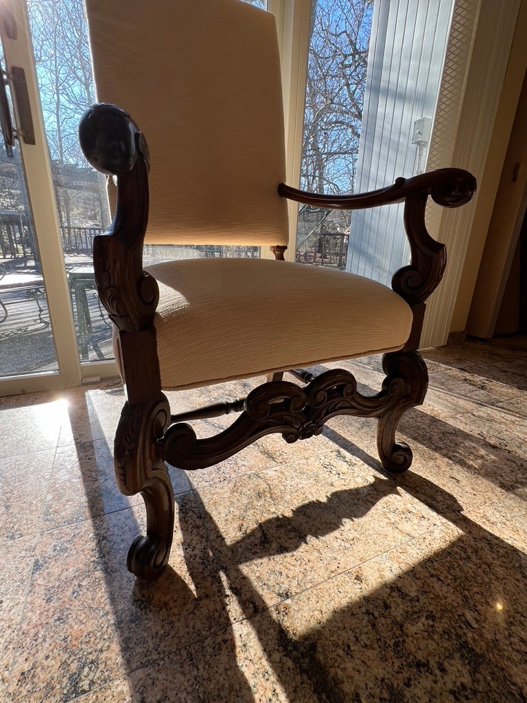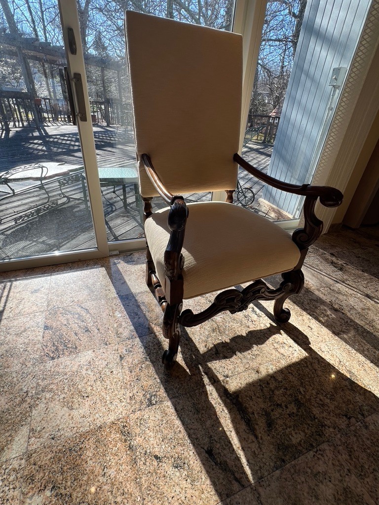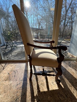 This is a Louis XIII-style "Os de Mouton" armchair, typically crafted from walnut with a high upholstered back and seat. Cream colored upholstery, in beautiful condition, a wonderful addition, for any king or queen of any home!
