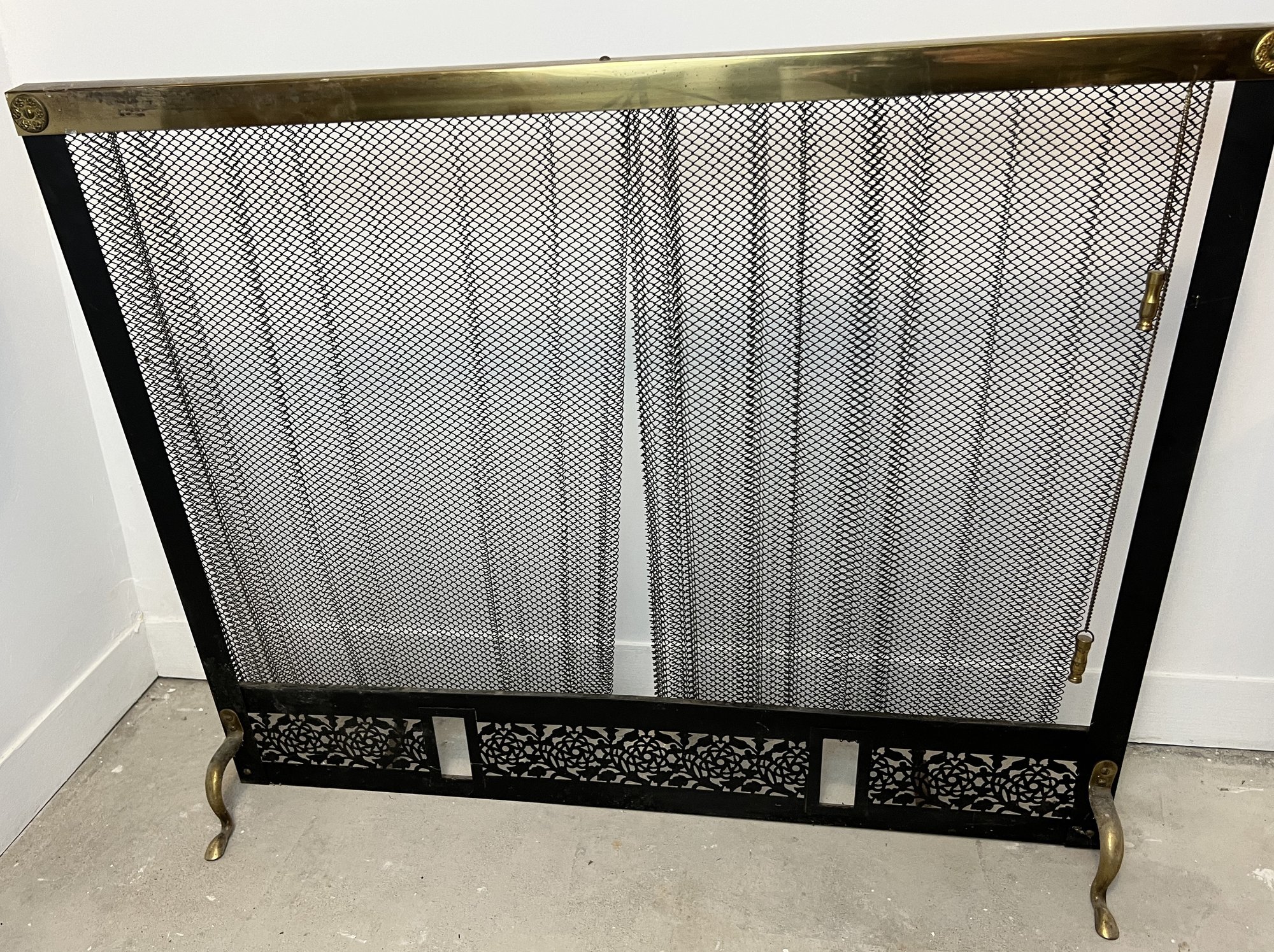Classic fireplace screen in black finish metal with polished brass accents.