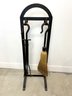Partial fireplace tool set including log tongs and broom on a stand in a hand-forged iron type style.