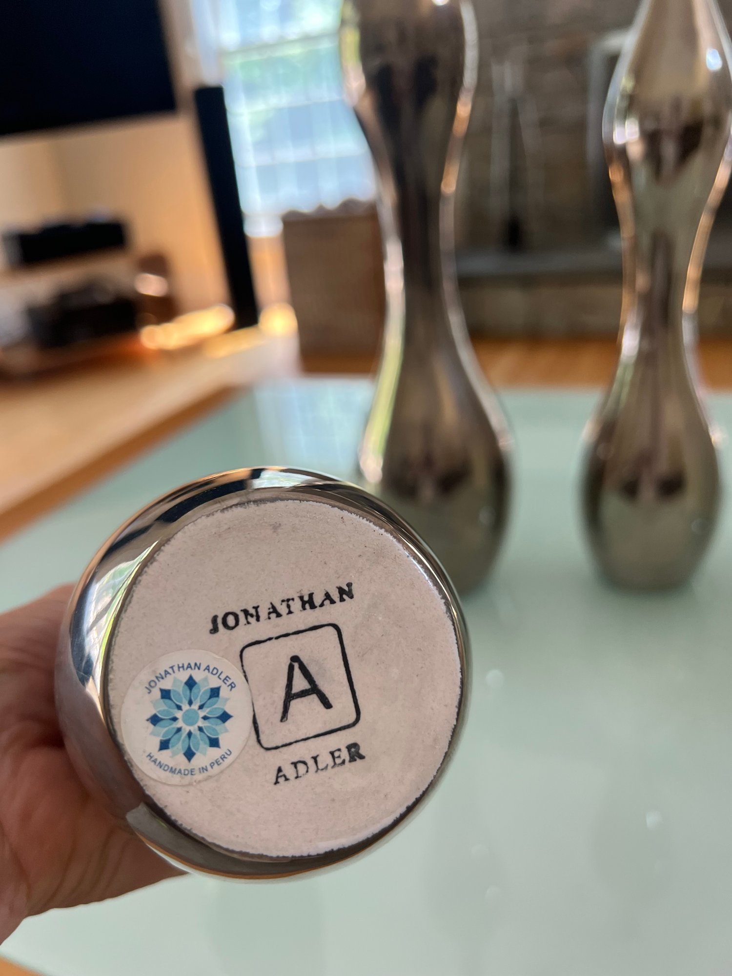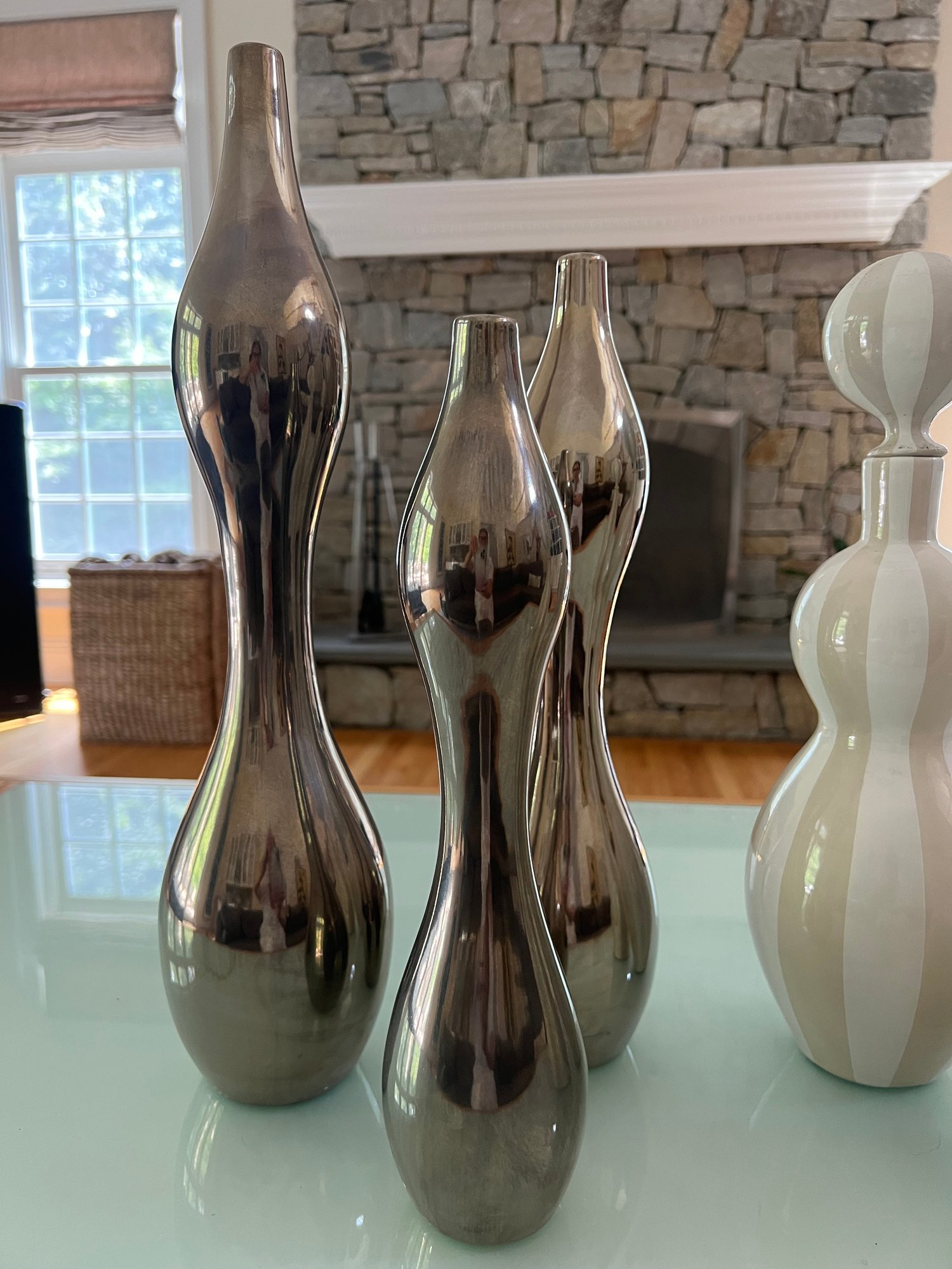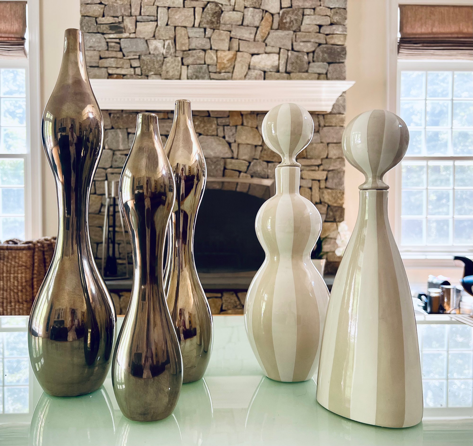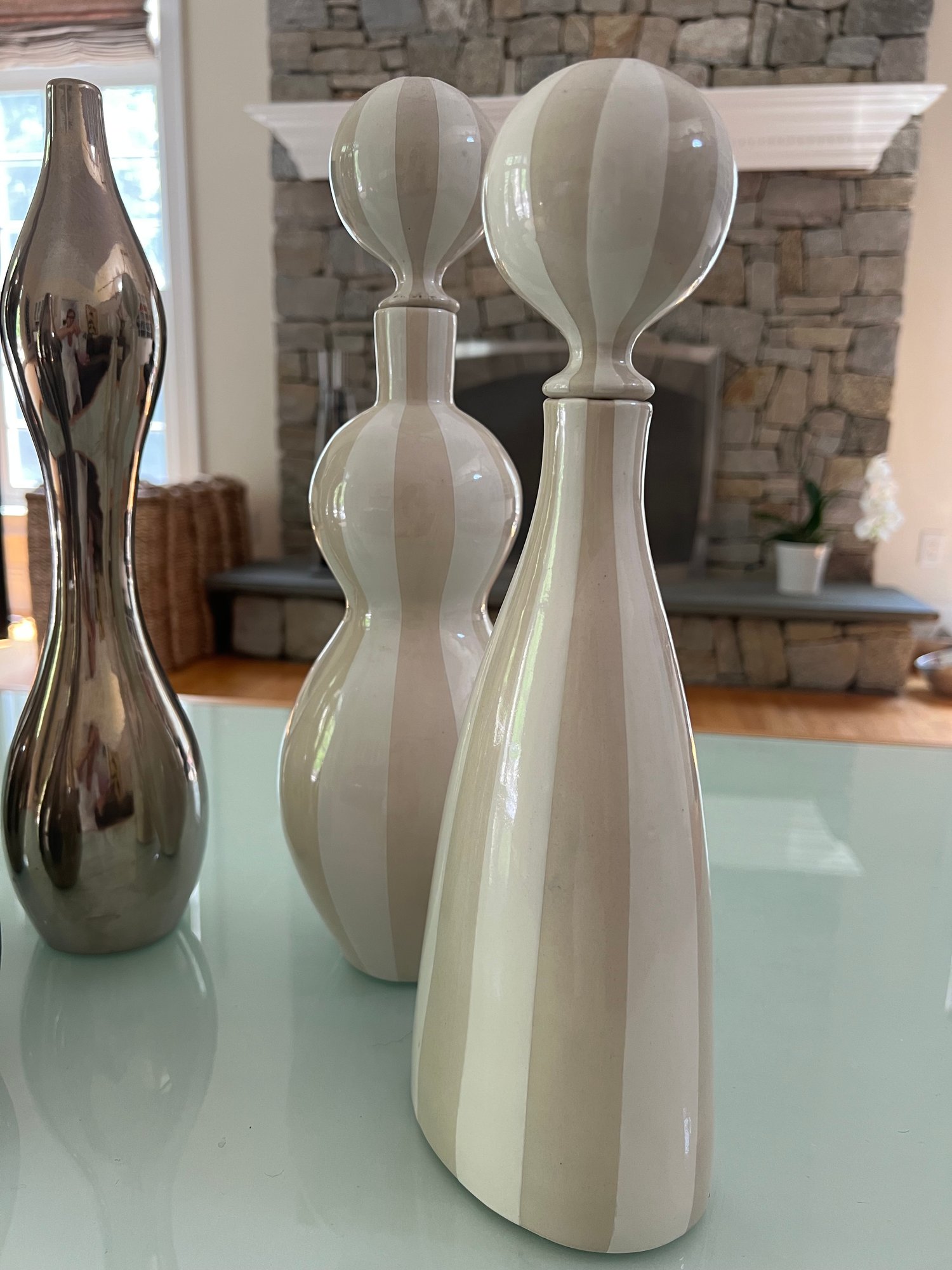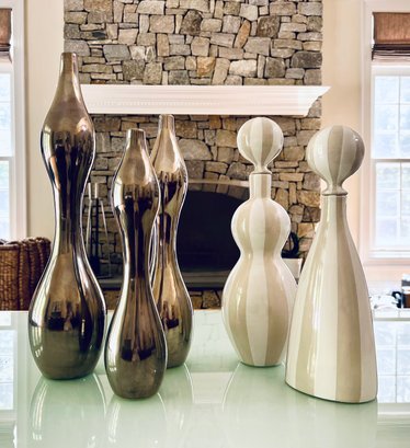 This beautiful grouping by Jonathan Adler includes two striped vessels that can be used as a decanter with top or as base without too. Both are a soft beige and white high gloss glaze. The three silver vase like shapes can be used decoratively as a grouping or as individual vases. In a high gloss silver glaze. All sculptural delightful decor! All in nice condition.*** Please note one ceramic white ball top is broken - needs lil glue repair