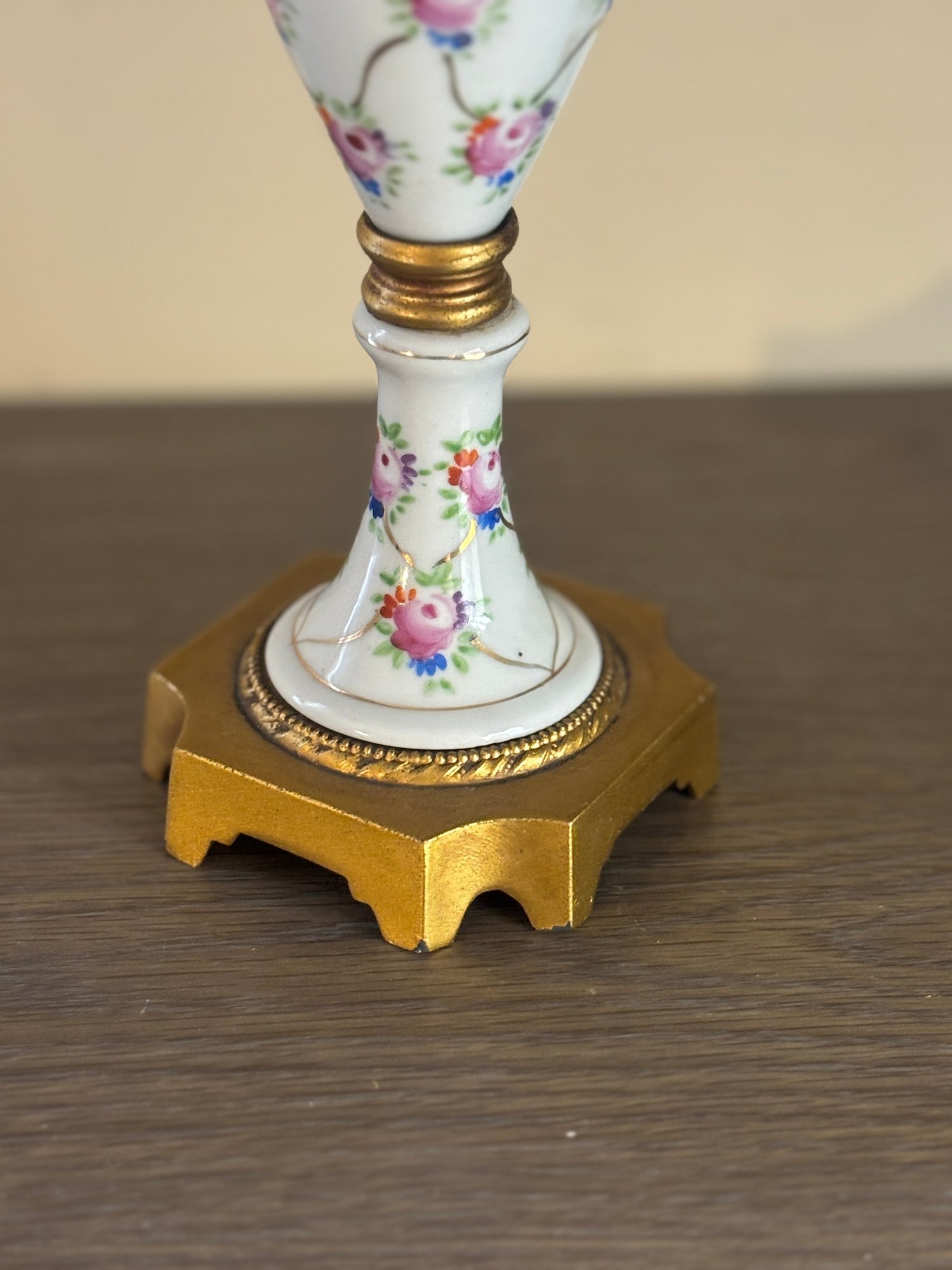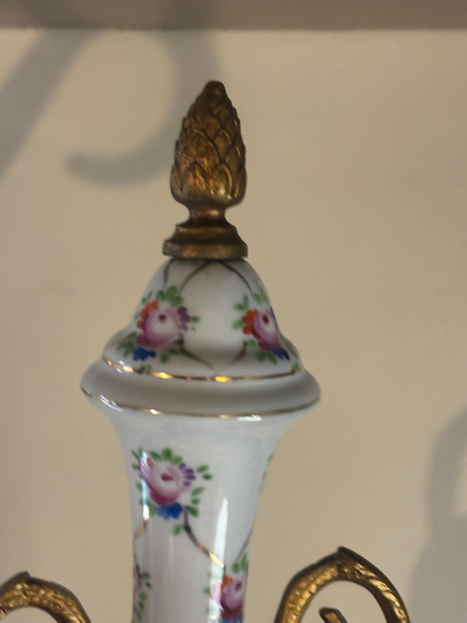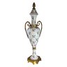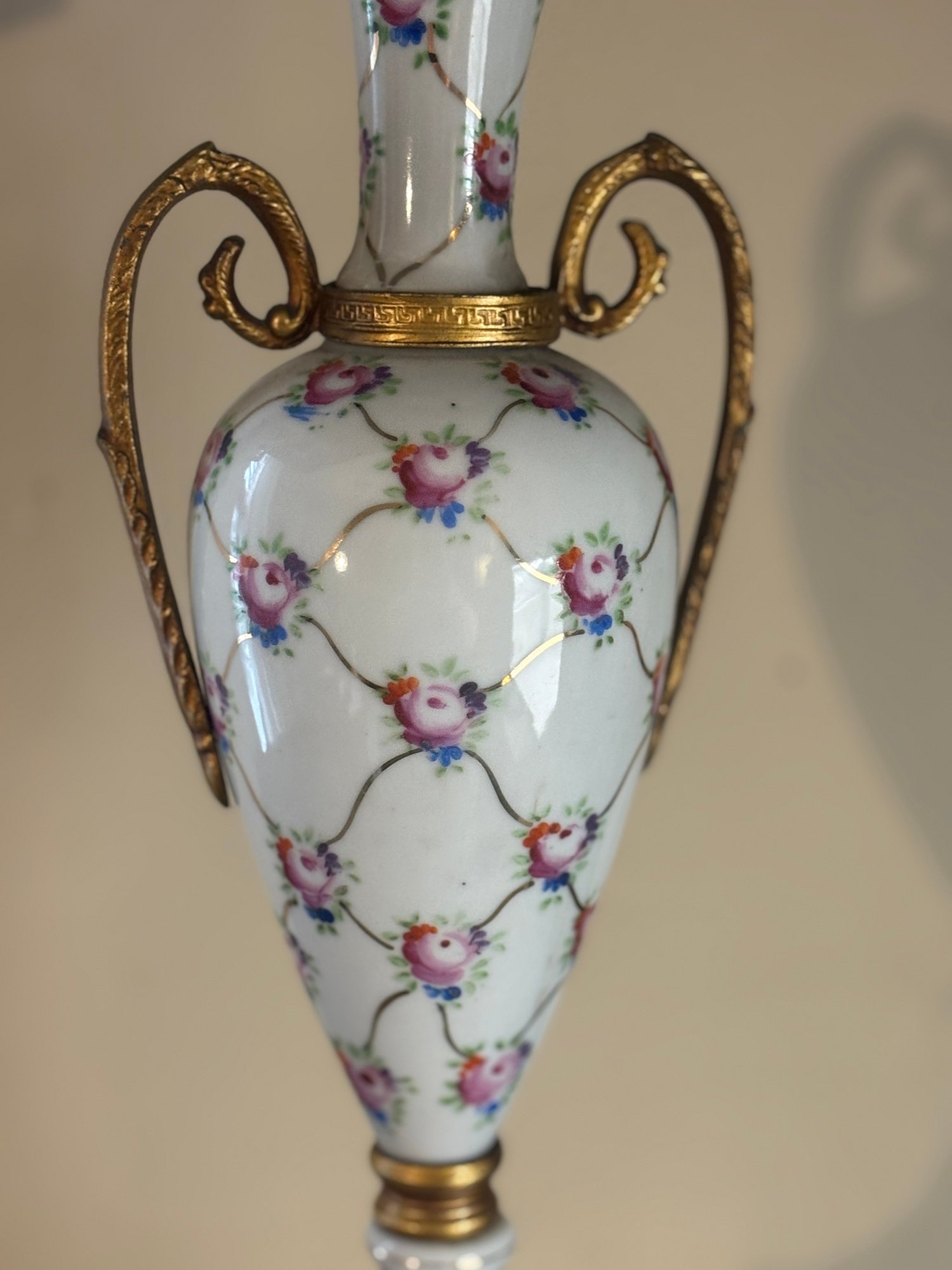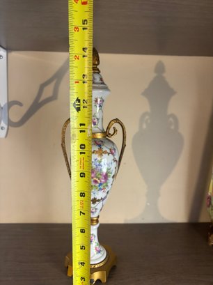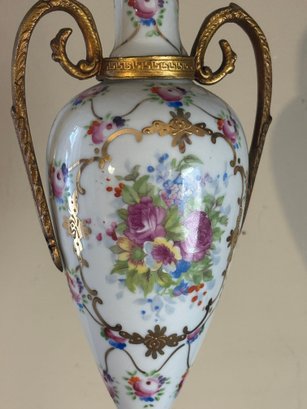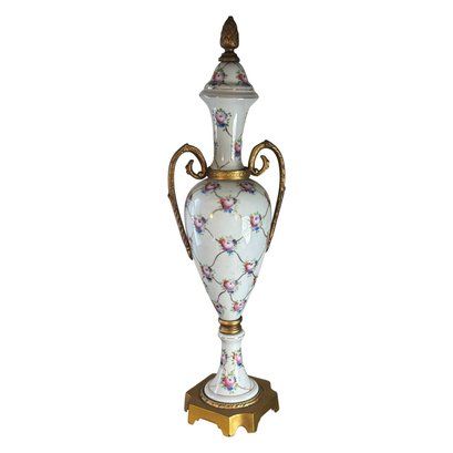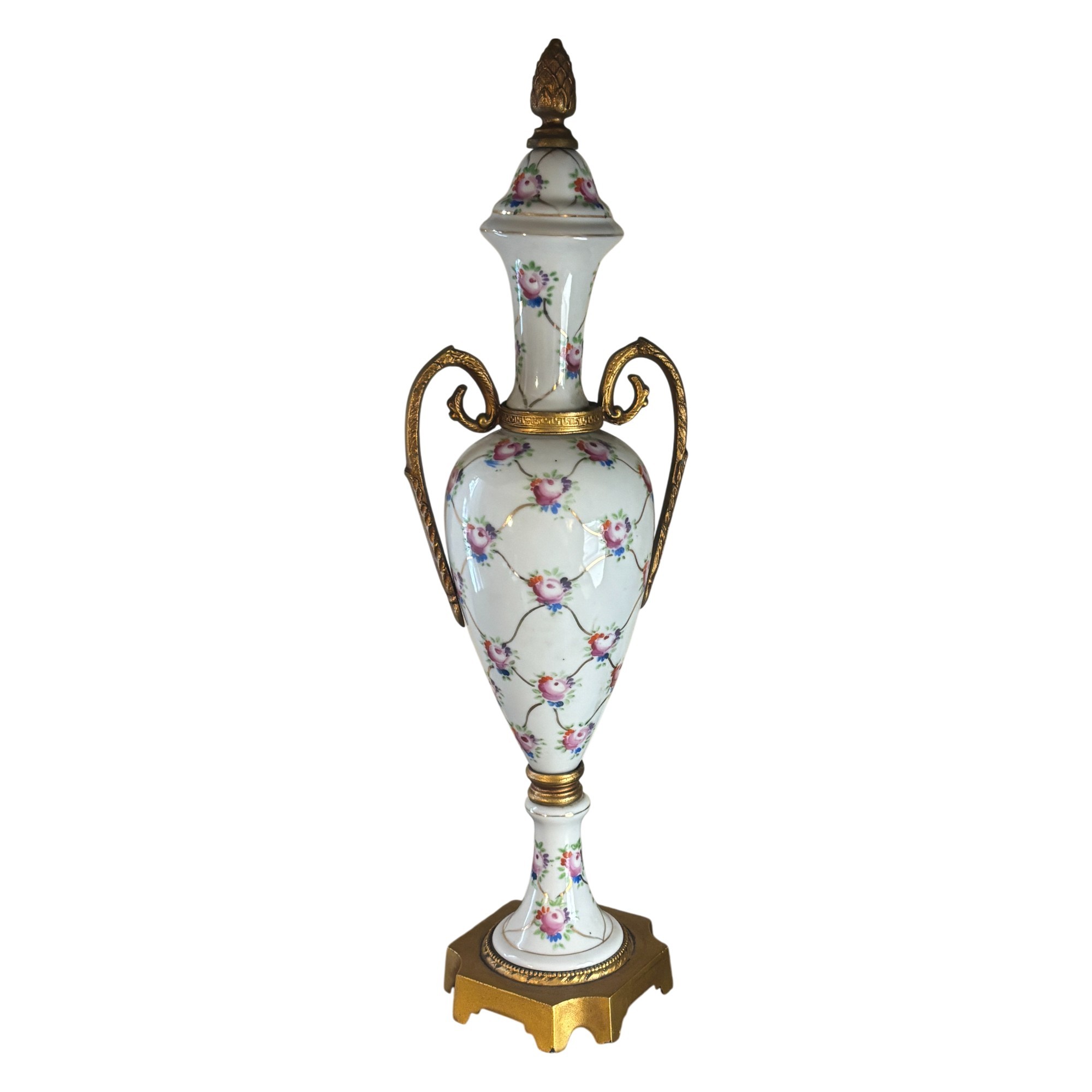 Elegant urn-form porcelain vase adorned with delicate hand-painted pink roses and trailing vine motifs over a glossy white ground. The form is classically inspired, featuring scrolling gilt metal handles, a fitted lid topped with an acorn-style finial, and a stepped base with warm gold-tone accents. The tall, slender silhouette gives this piece a formal presence—perfect for a mantel, entry console, or traditional vignette where a little old-world charm goes a long way. A lovely decorative accent that reads European in spirit and timeless in appeal.