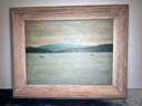 Naive style folk art painting depicting a lake with a few canoers fishing.