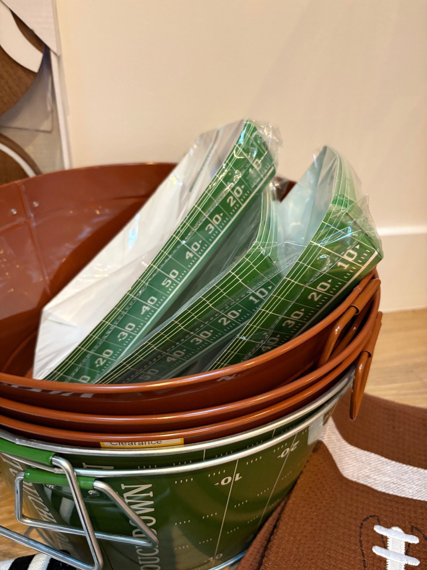 Cups, five beverage bins with handles, paper boat bowls, decorations, plastic cups with straws, 12 dish towels and more!