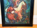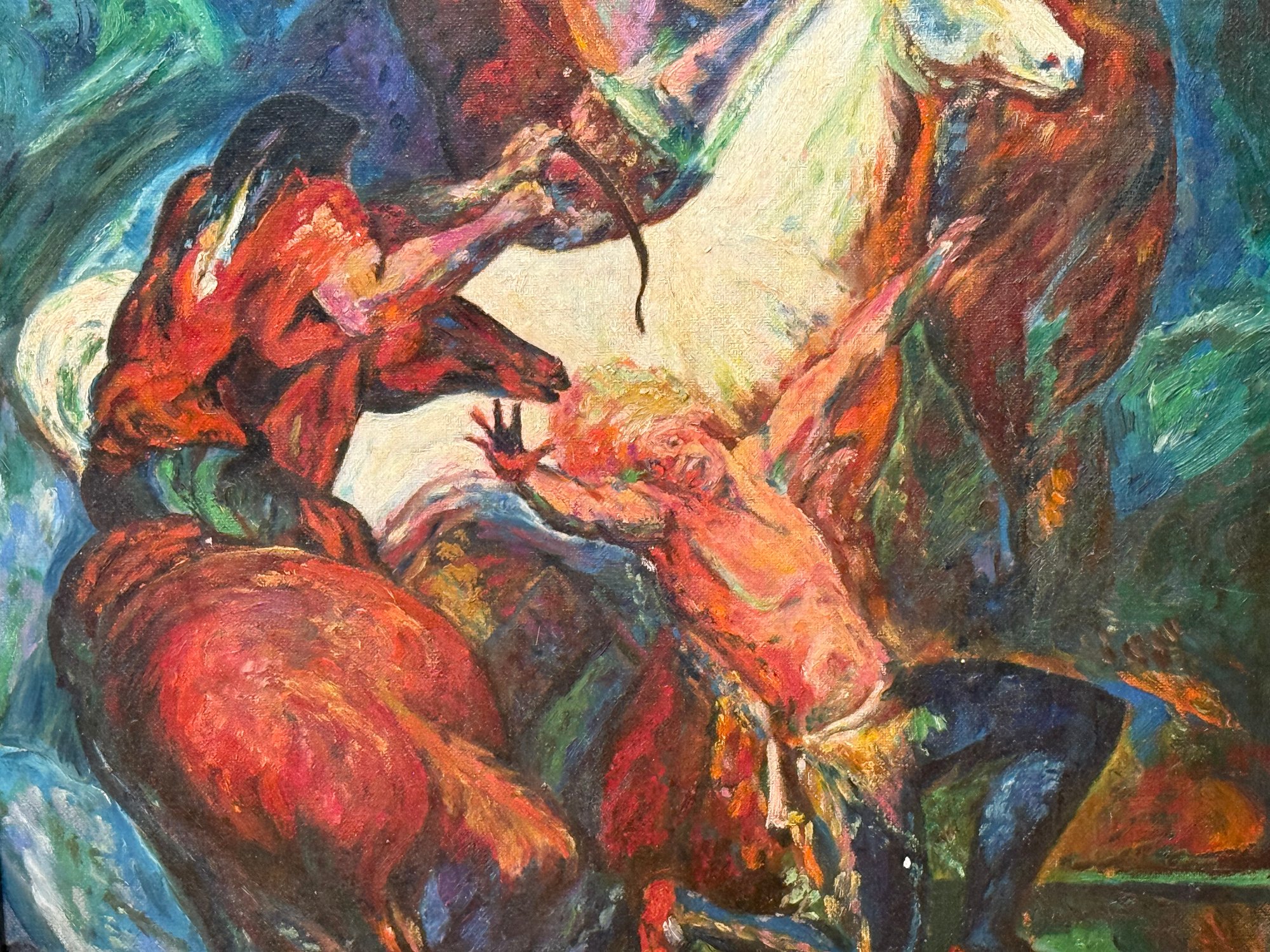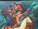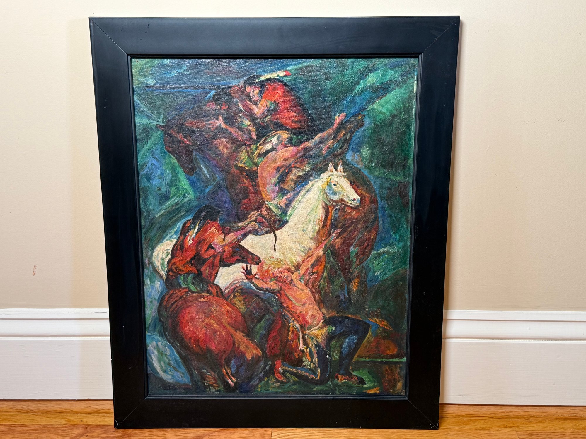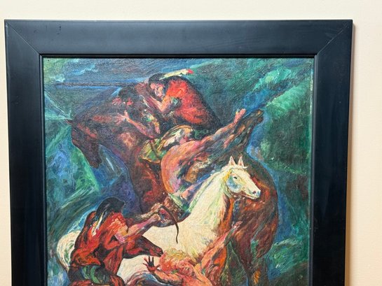 This oil painting depicts a dynamic scene of Native Americans on horseback during the Black Hawk War, engaged in conflict. There are several figures, shown in a vivid style. You get a real sense of movement and intensity characteristic of battle or chase scenes. We can see a faint signature in the bottom left hand corner.