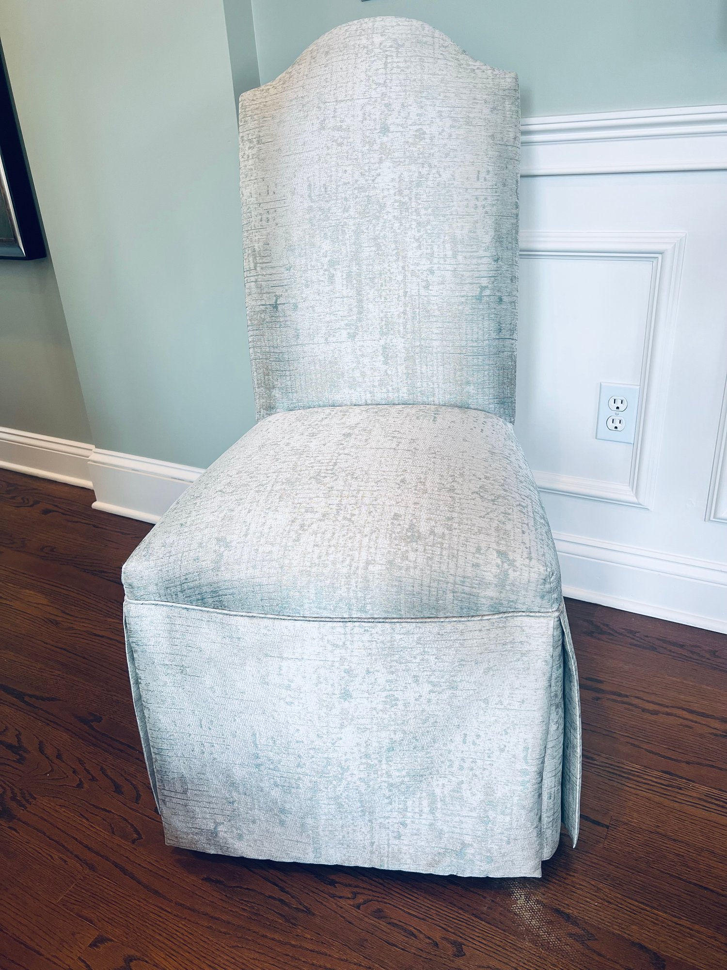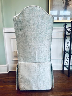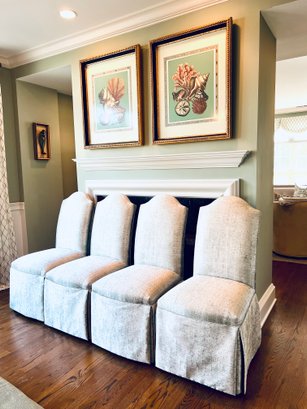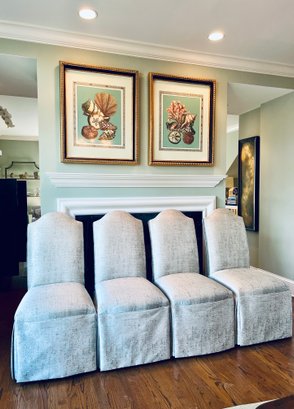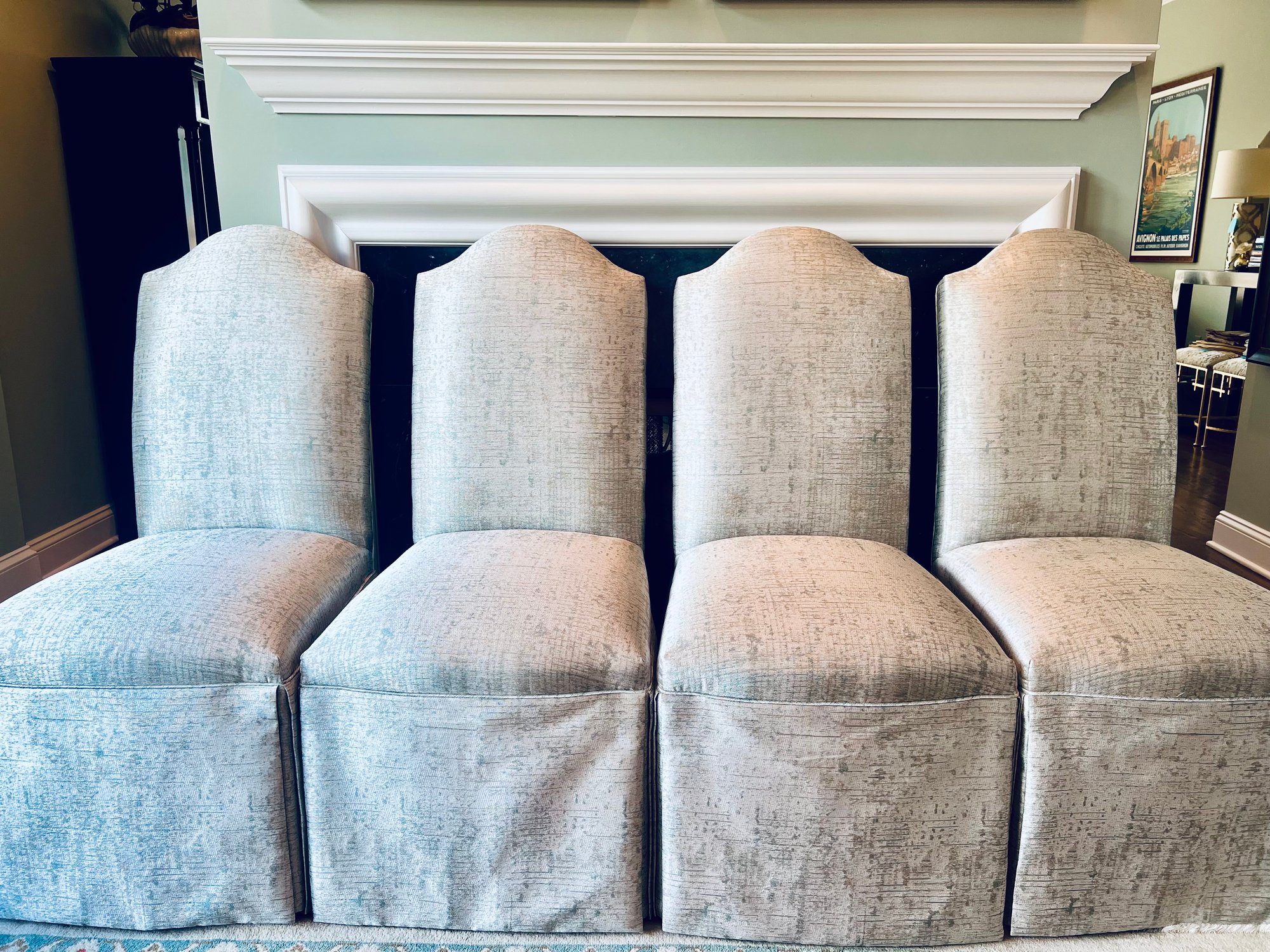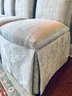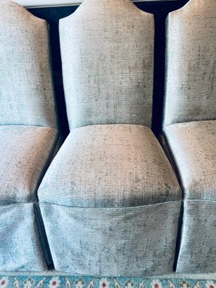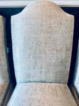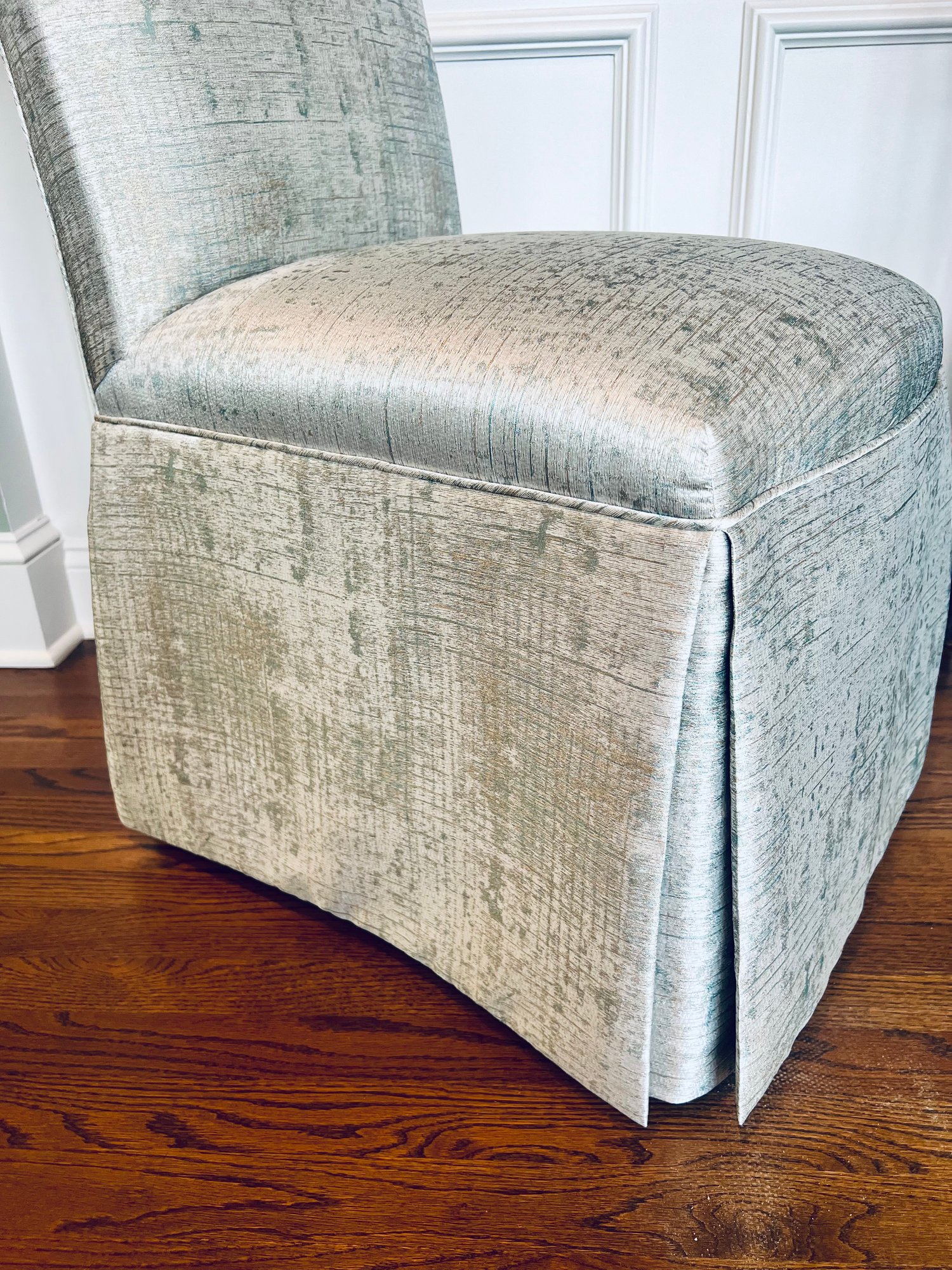 This set of four slipper chairs have been custom upholstered in a gorgeous silk melange Shantung style with subtle Ikat print. Absolutely elegant in silver overtone. Condition is very good and in appearance look almost new.