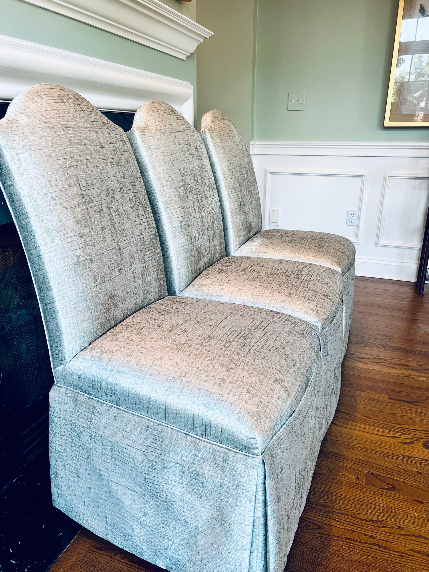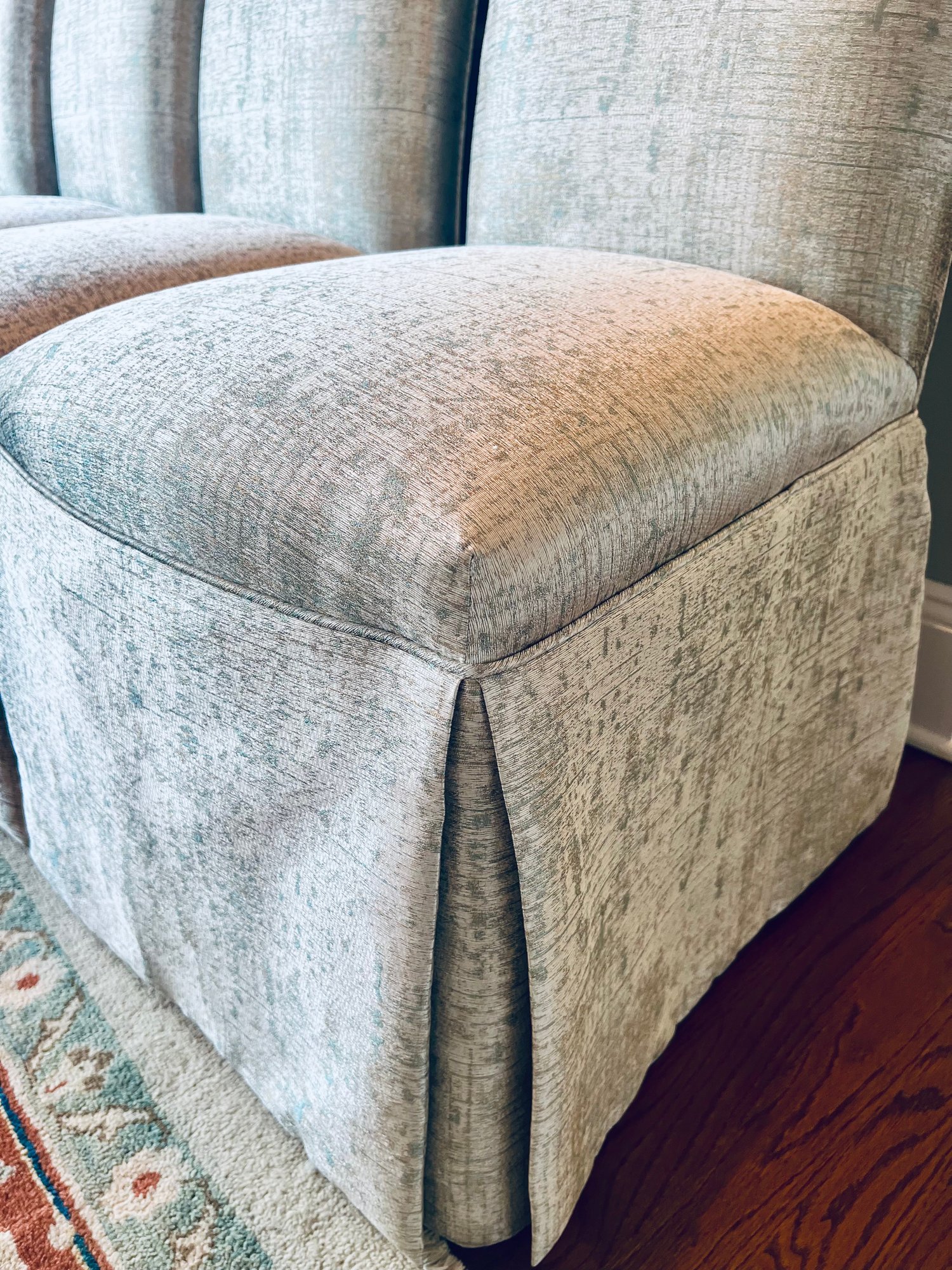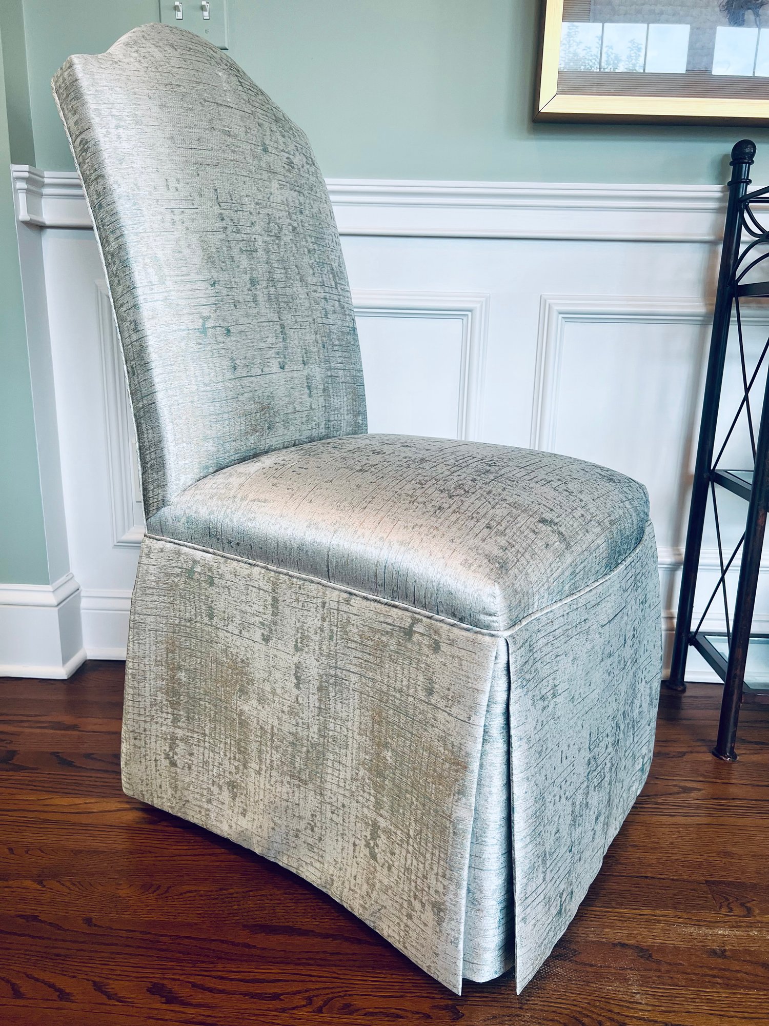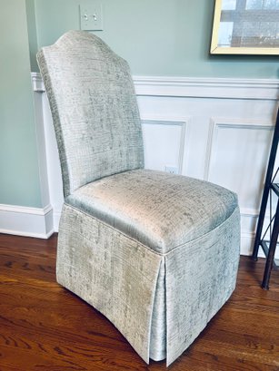 This set of four slipper chairs have been custom upholstered in a gorgeous silk melange Shantung style with subtle Ikat print. Absolutely elegant in silver overtone. Condition is very good and in appearance look almost new.