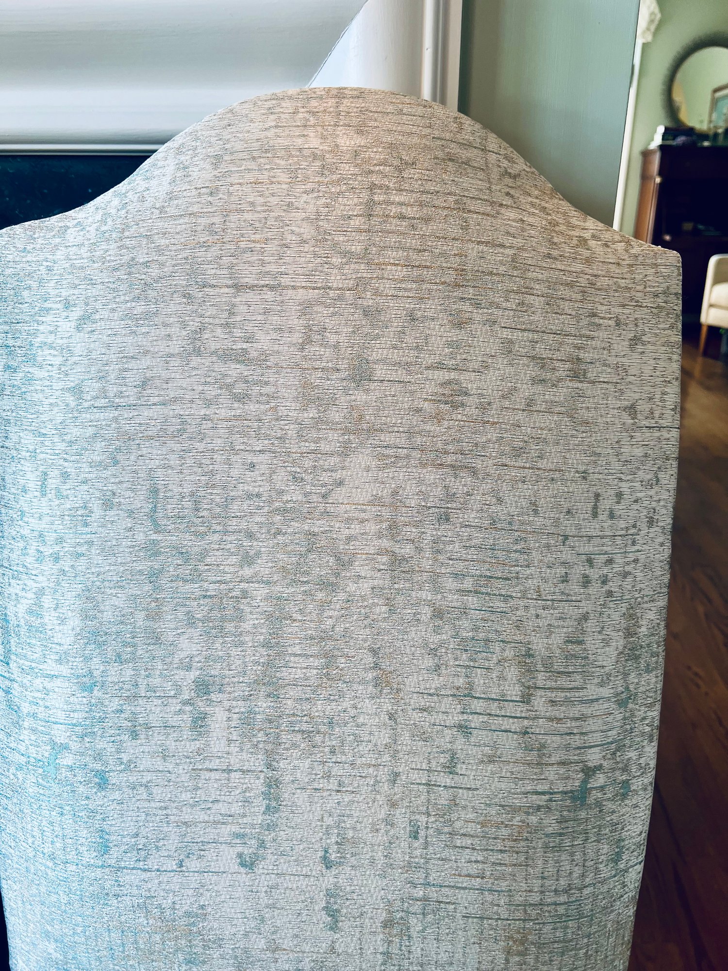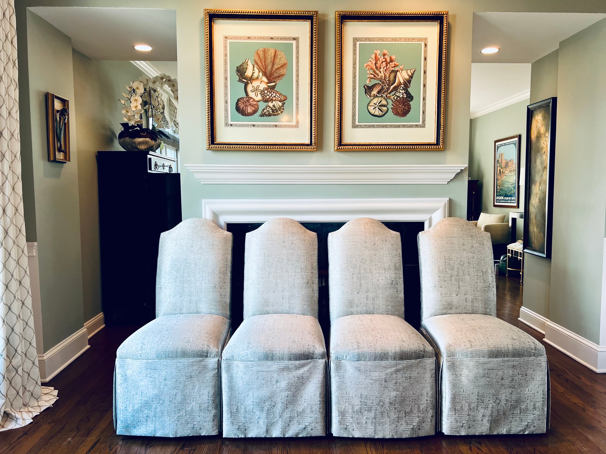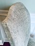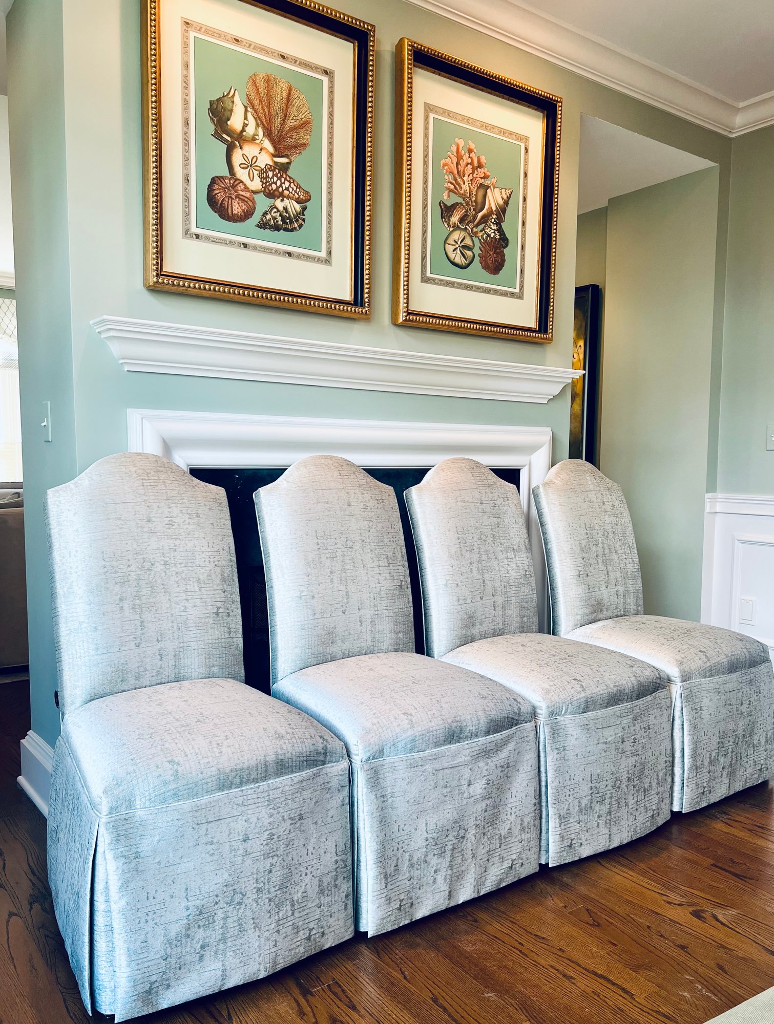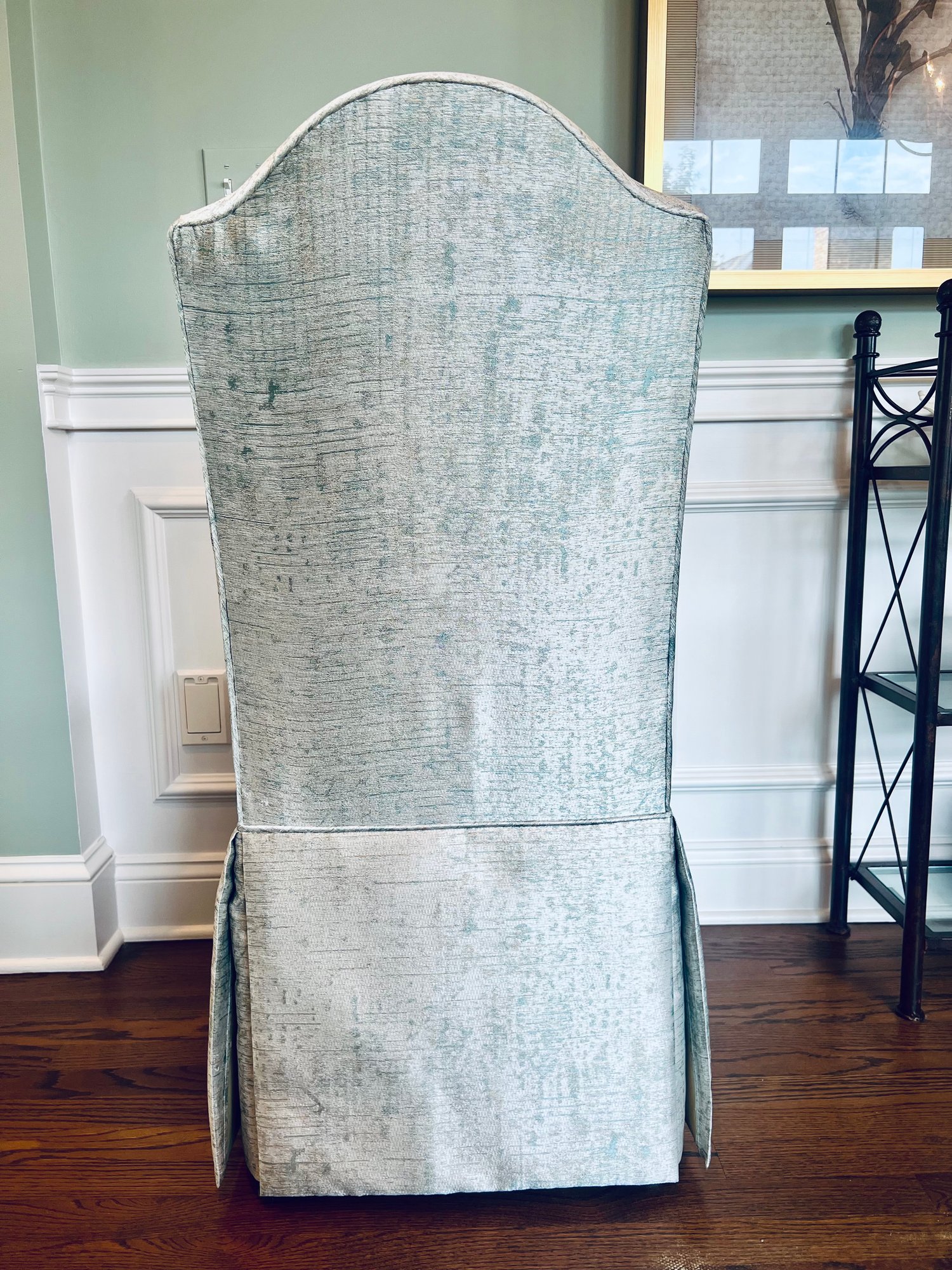 This set of four slipper chairs have been custom upholstered in a gorgeous silk melange Shantung style with subtle Ikat print. Absolutely elegant in silver overtone. Condition is very good and in appearance look almost new.
