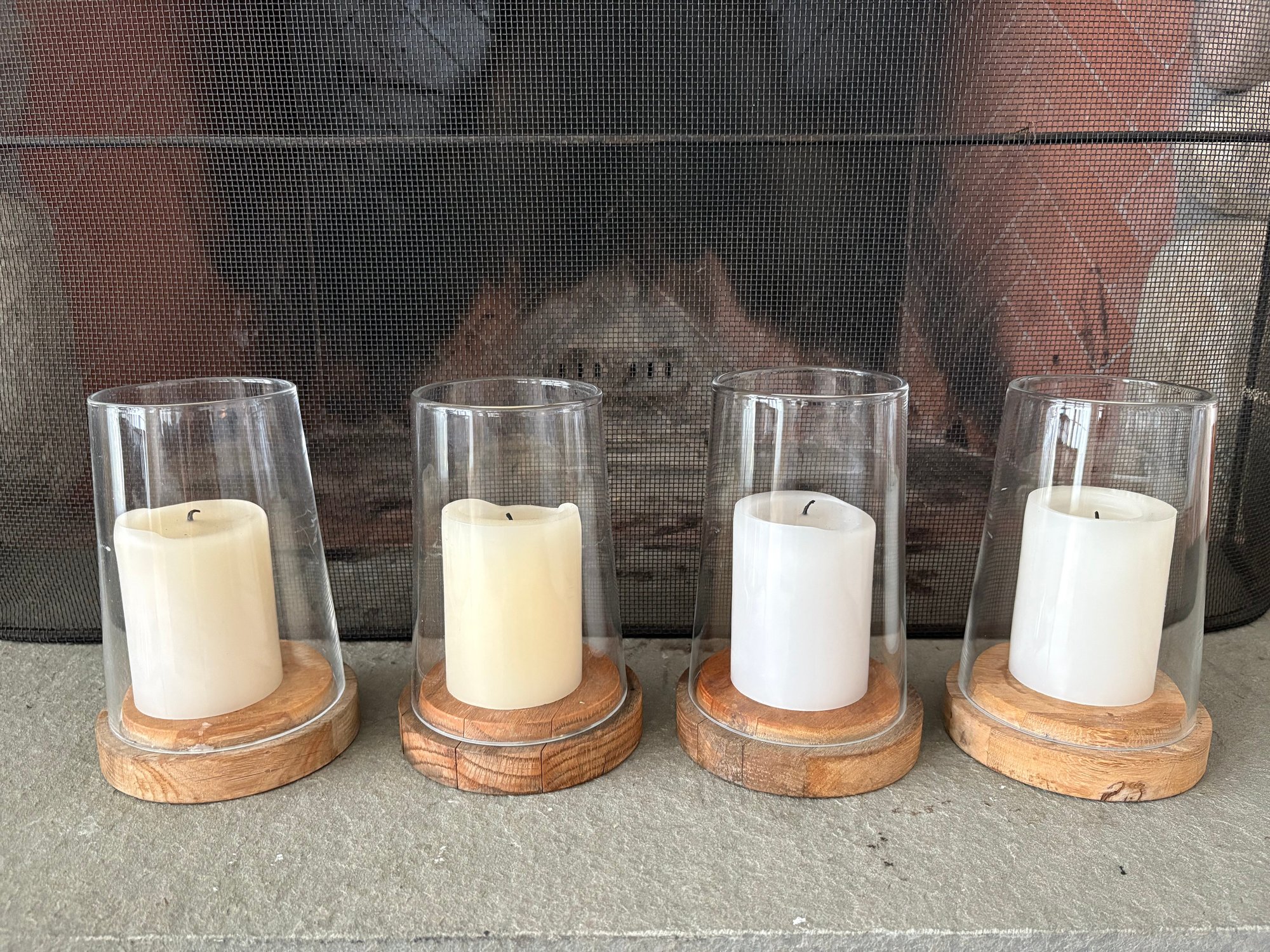 Four (4) Crate & Barrel Ellery Hurricane Oak Candle Holders.