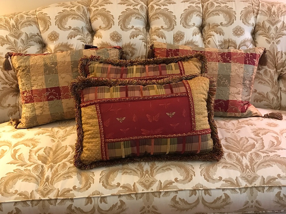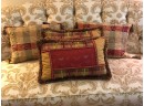 Two pillows in a gold, green and deep red and two with bees. Good condition.