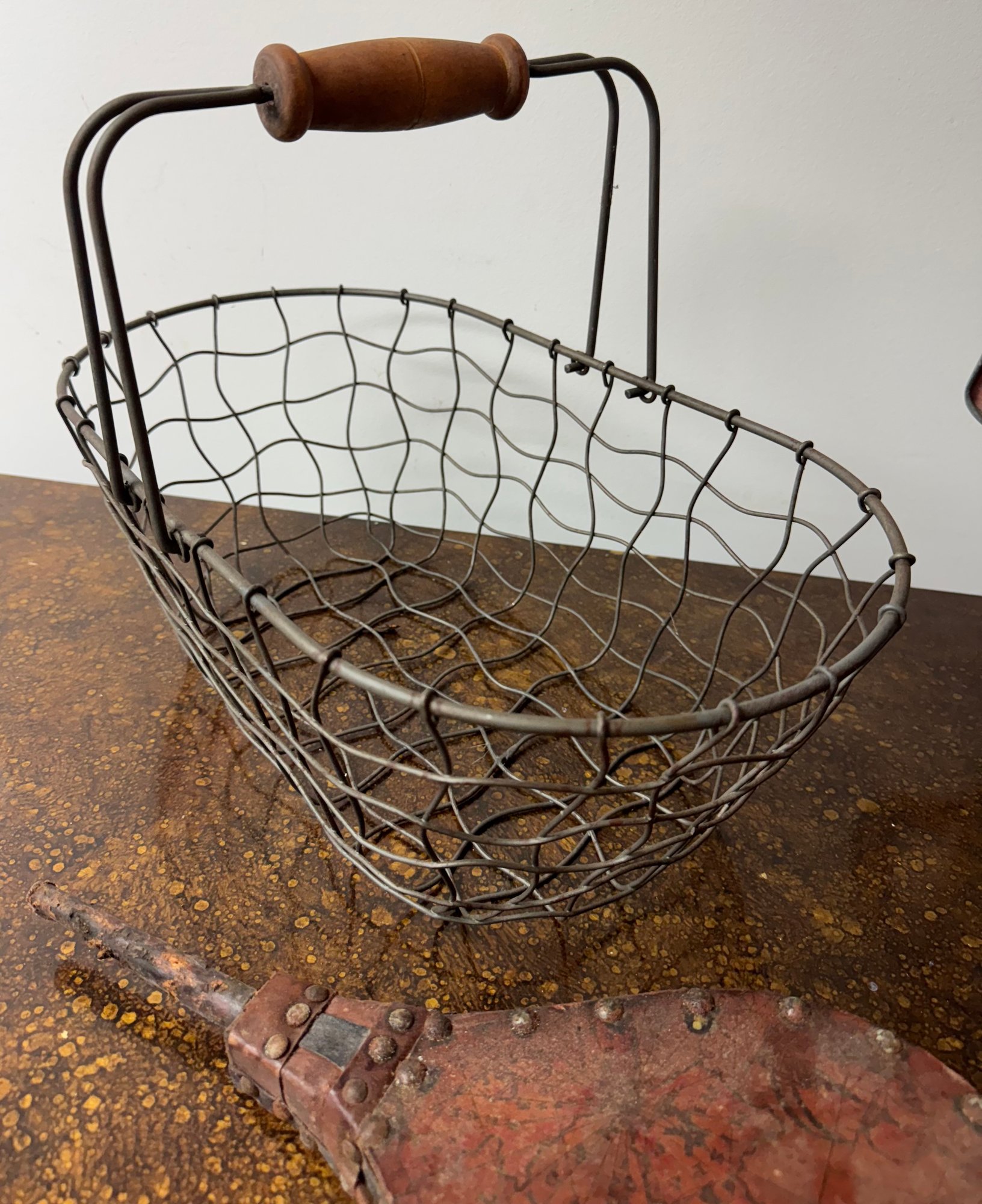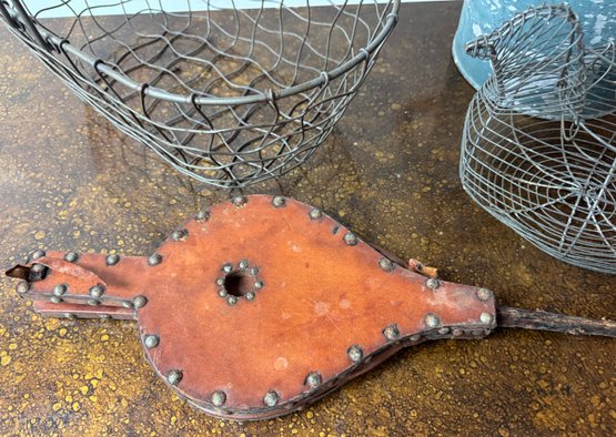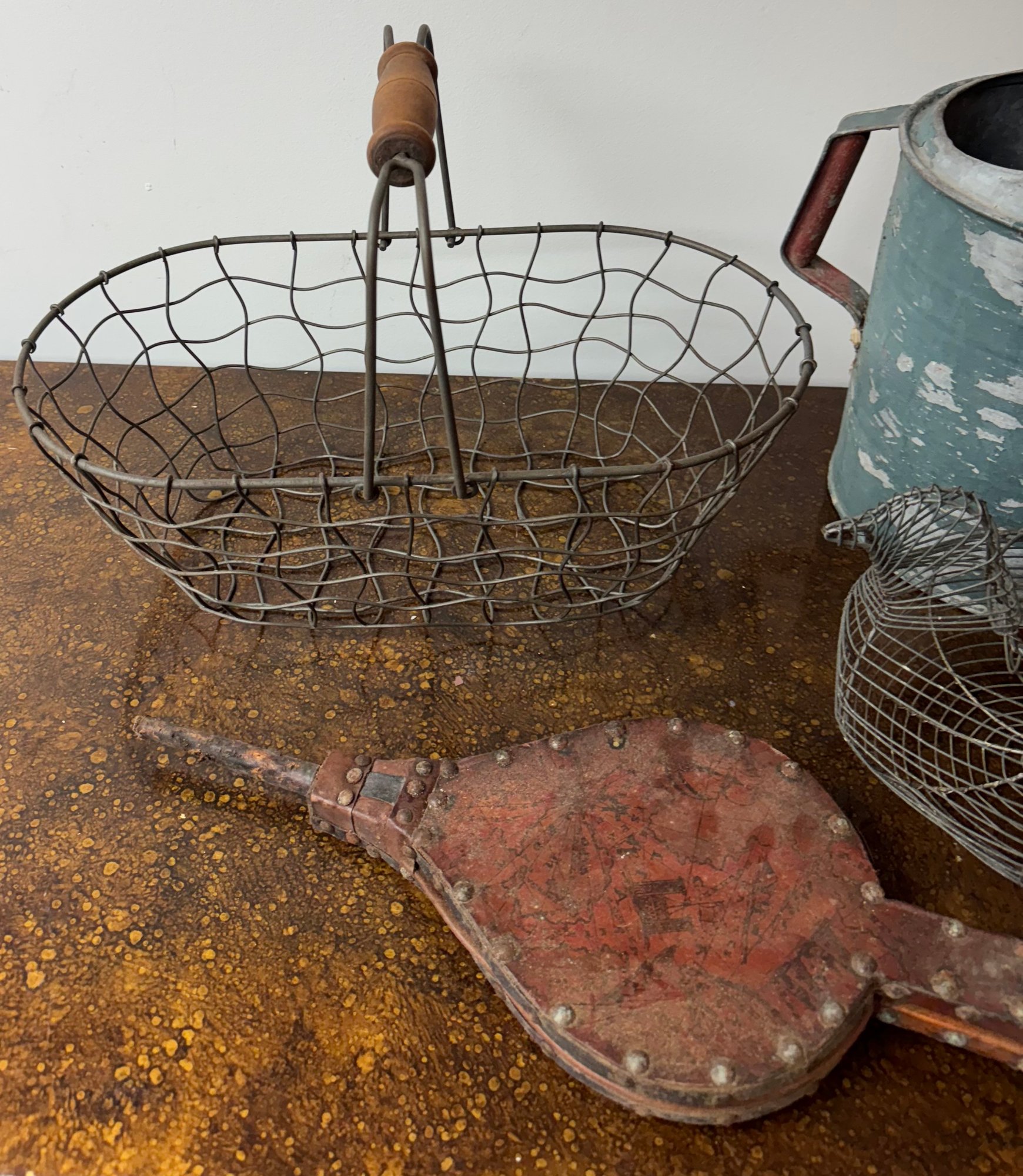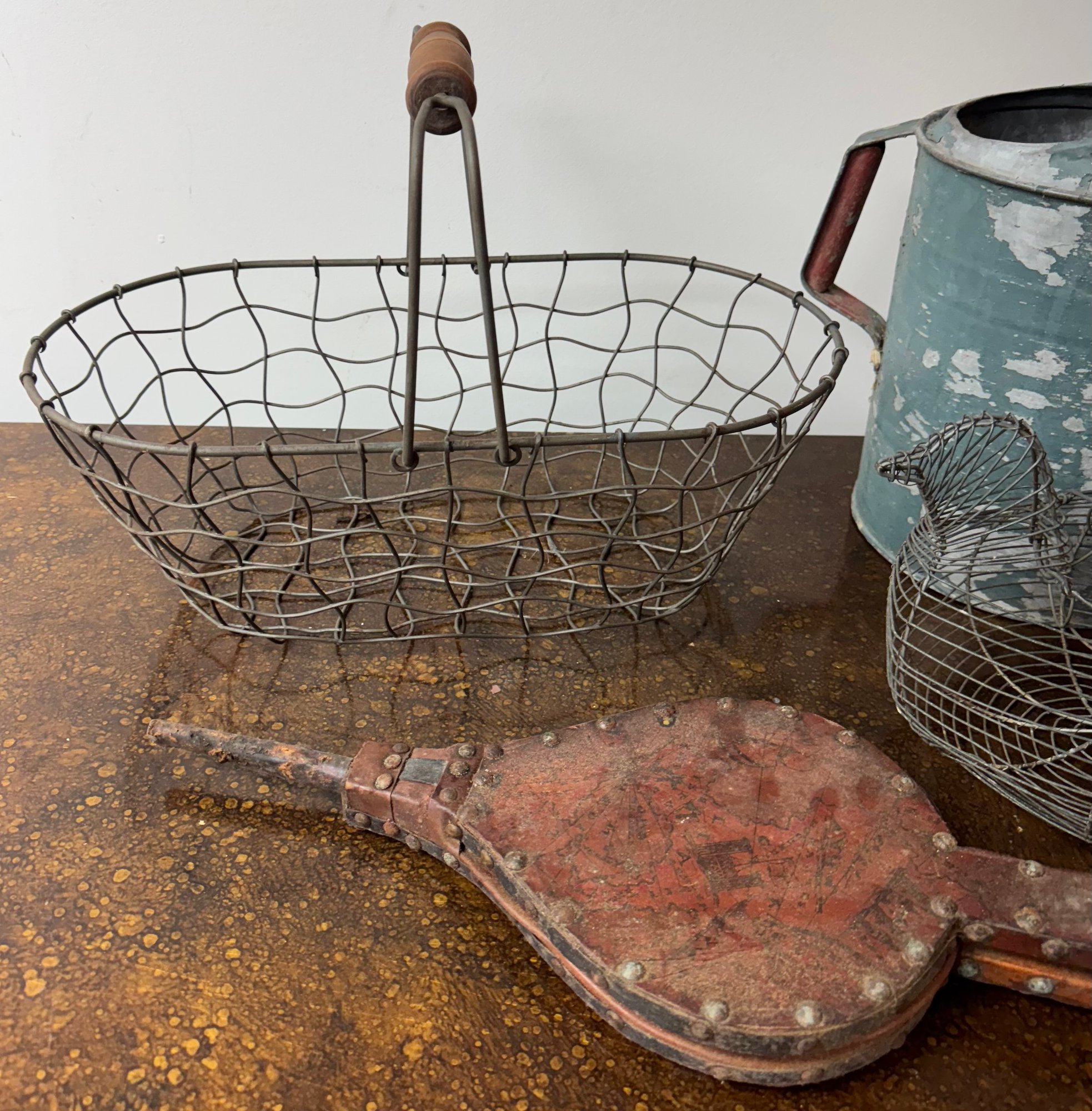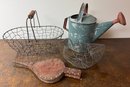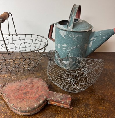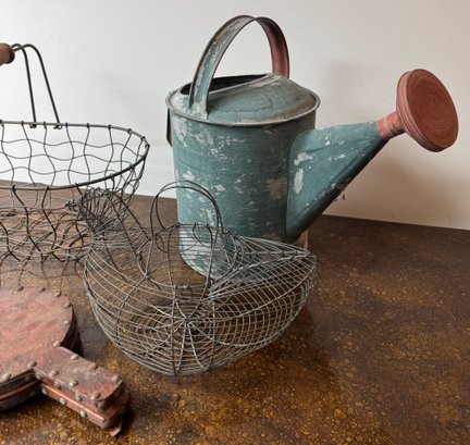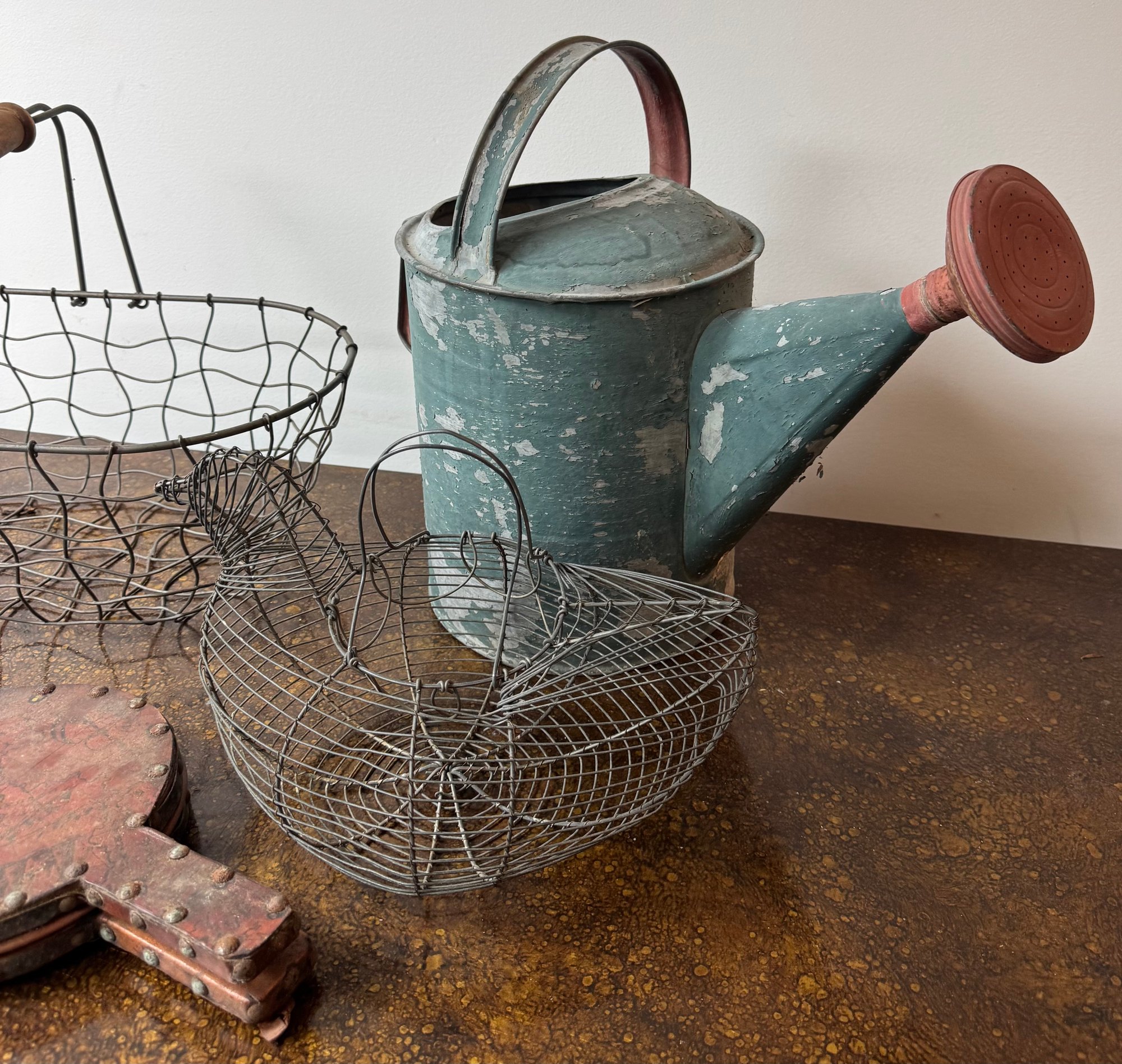 watering can(16"h), chicken basket(12" x 8"h), bellows, metal basket with wire (18" x 10.25" x 13"h)