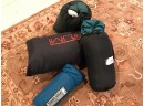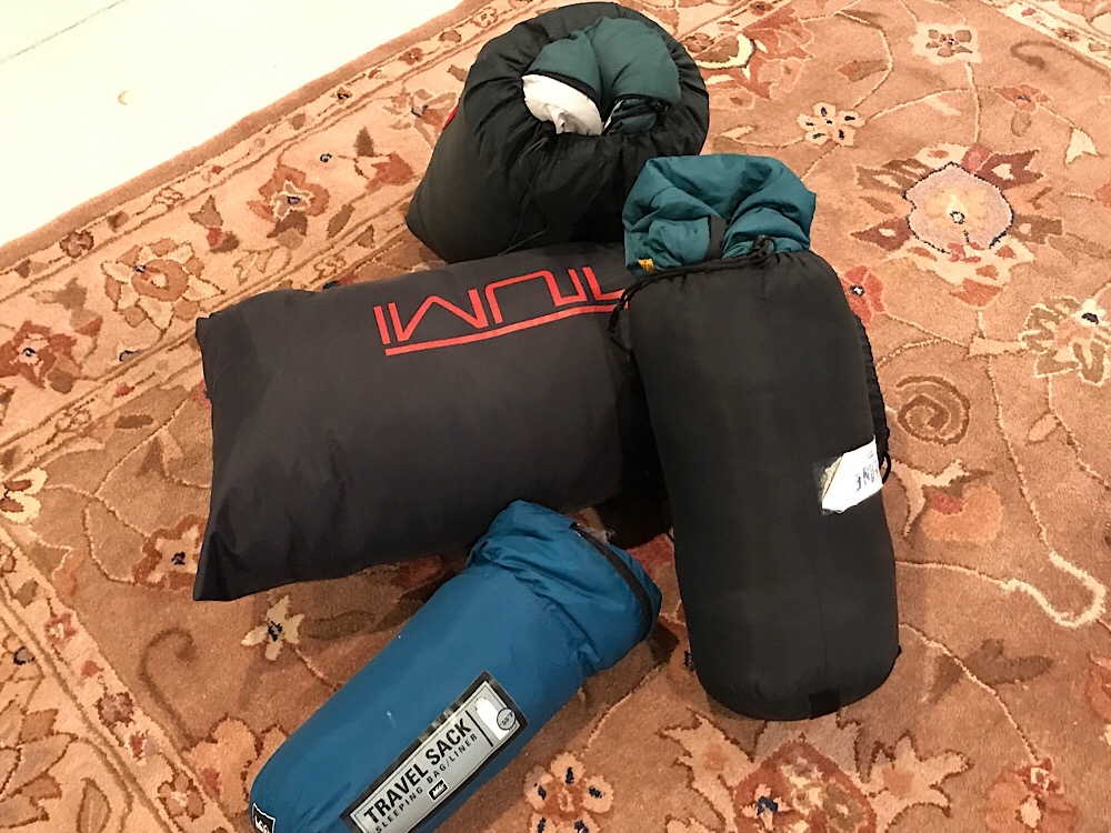 Four sleeping bags, Tumi, Northface and Travel Sack.