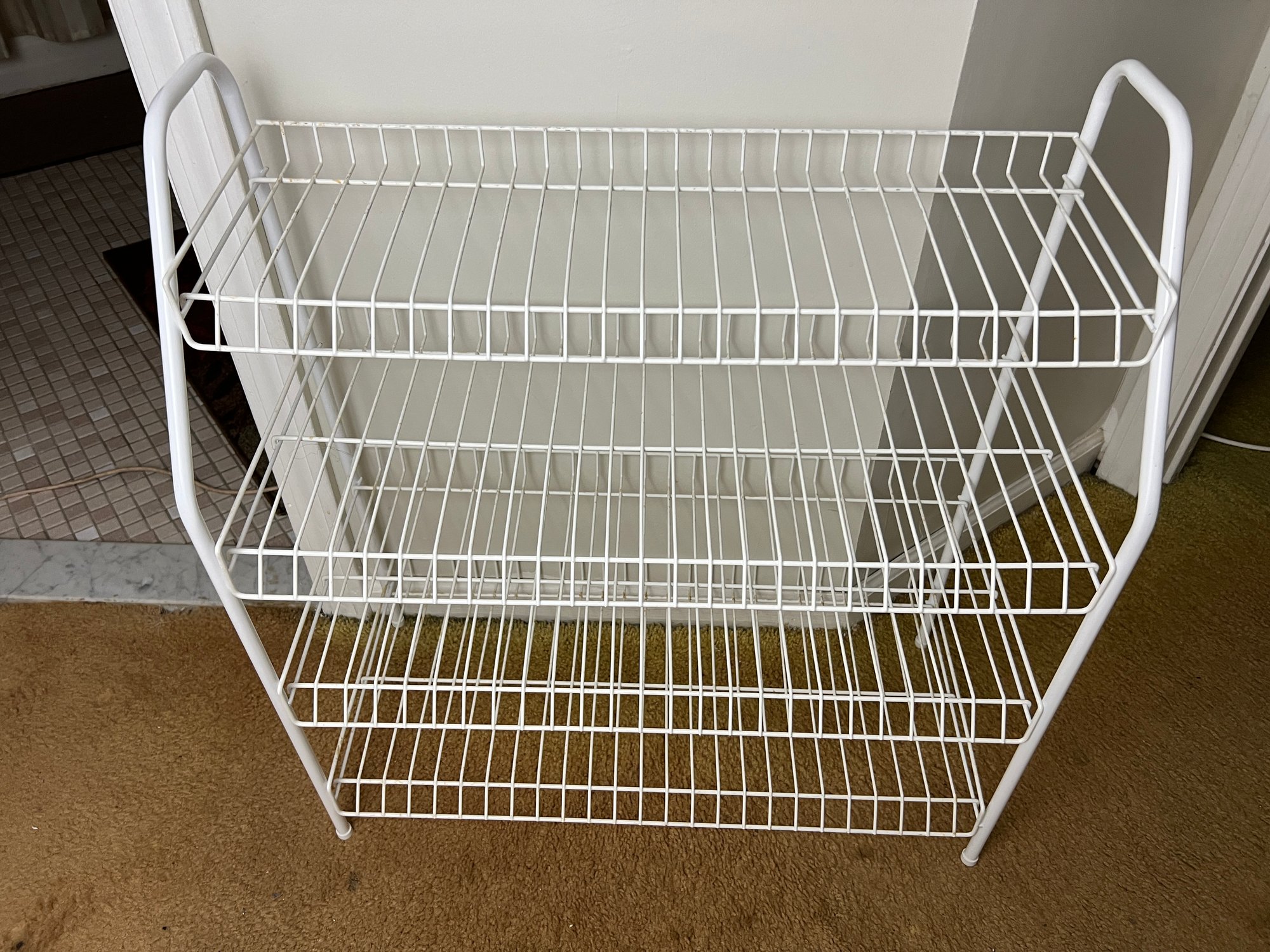 White coated metal wire four-tier shoe rack.