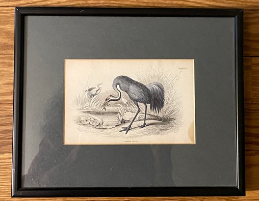 A fine antique folio print entitled Common Crane. It's well framed and in good condition. The frame measures 10 1/2" long by 8 1/2" high.