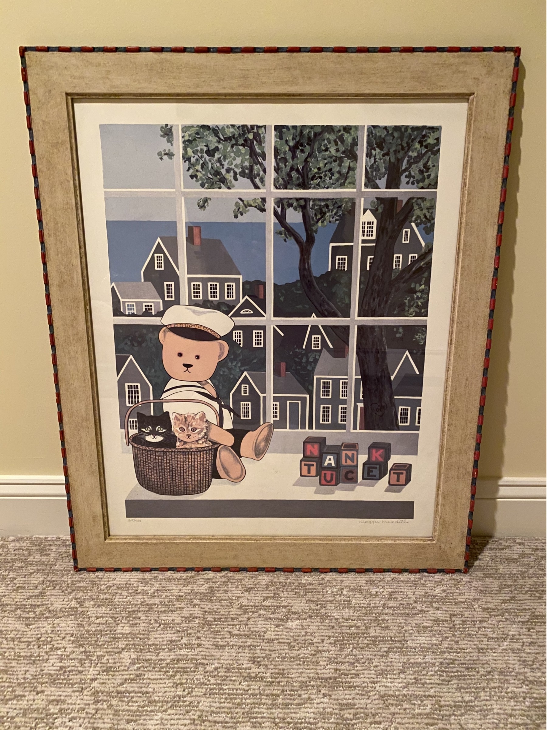 Edition 165/500. Depicts Teddy Bear overlooking Nantucket with NANTUCKET spelled in toy blocks. Framed by Heydenryk.