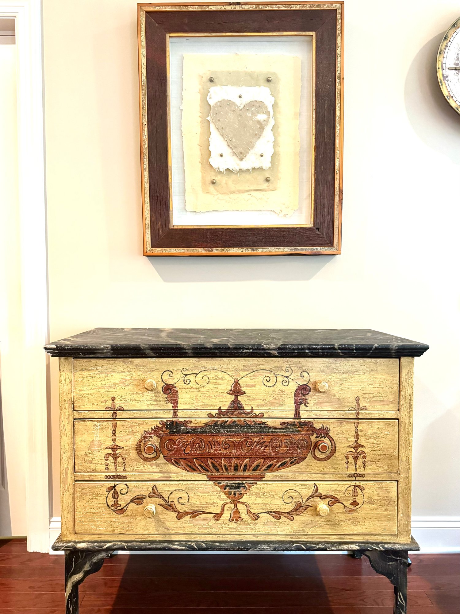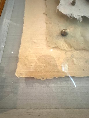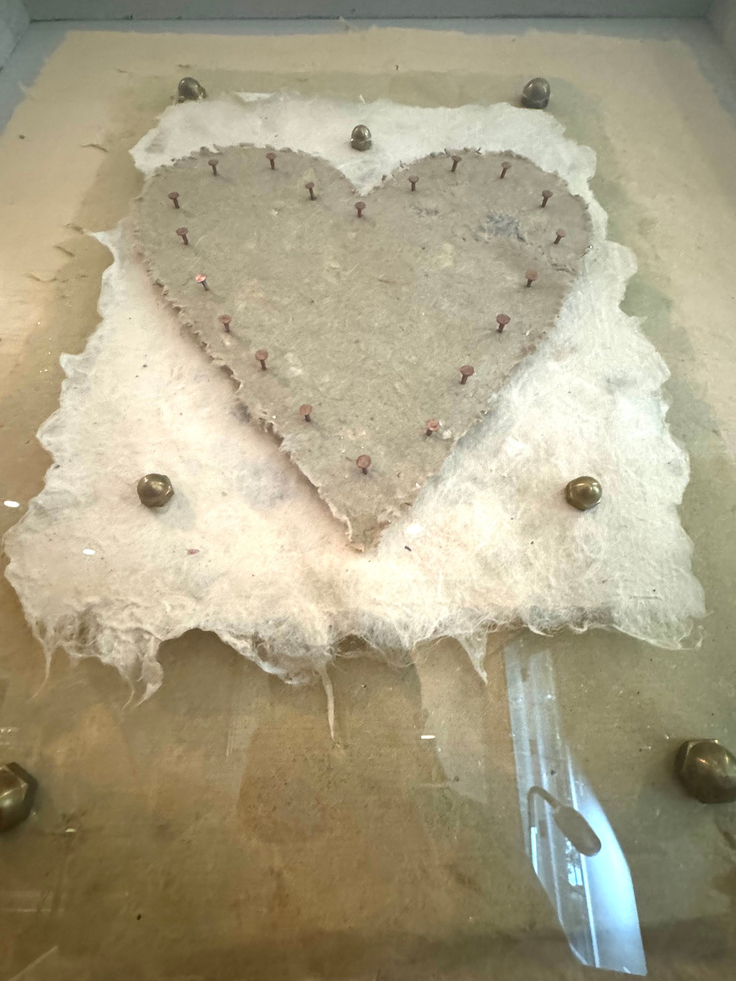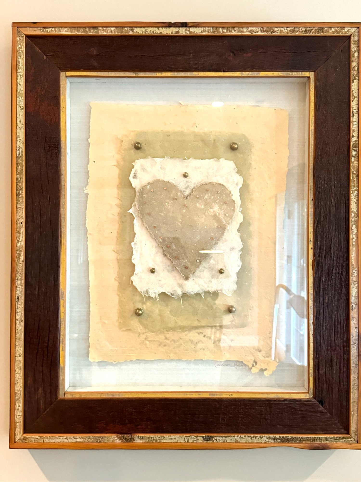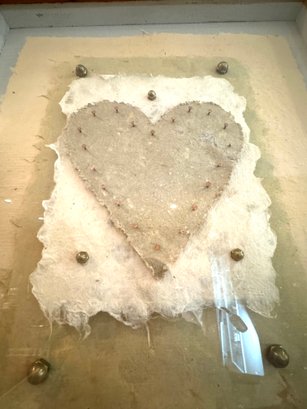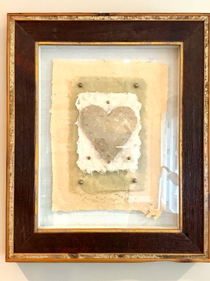 This framed paper sculpture art Heart Aches is a layered grouping of hand made paper, copper nails and brass hardware. It is encased floating in a rustic heavy wood frame under glass. Condition is very good.