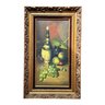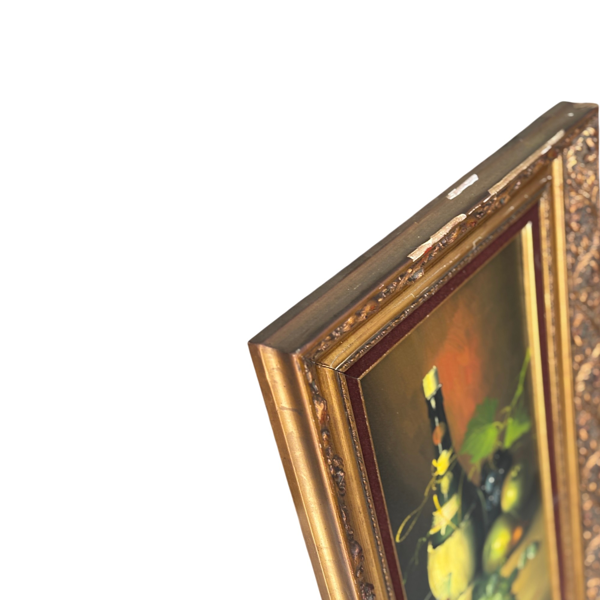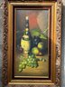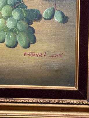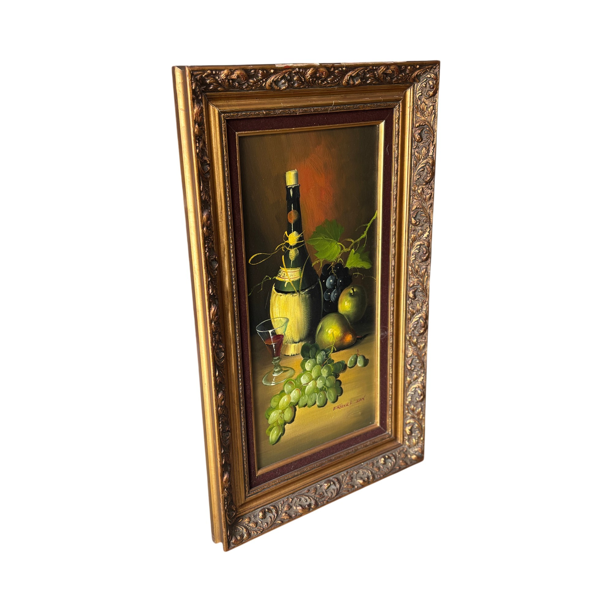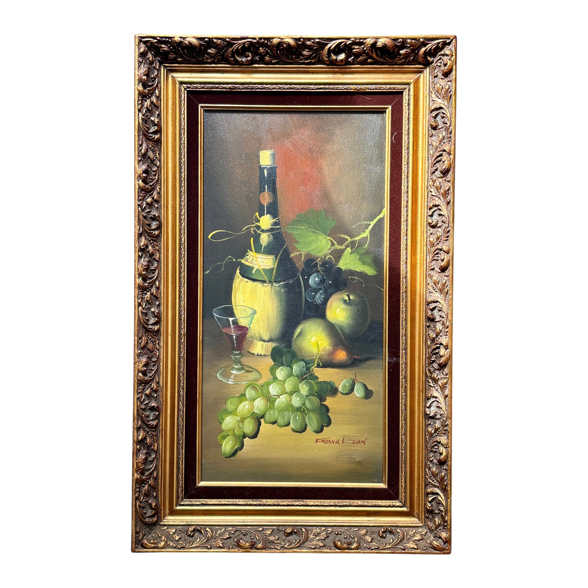 Signed Frank Lean at lower right. Housed in an ornate carved and gilt frame with layered molding and decorative detailing that elevates the presentation. A versatile decorative piece that works well in kitchens, dining rooms, wine rooms, or traditional interiors.