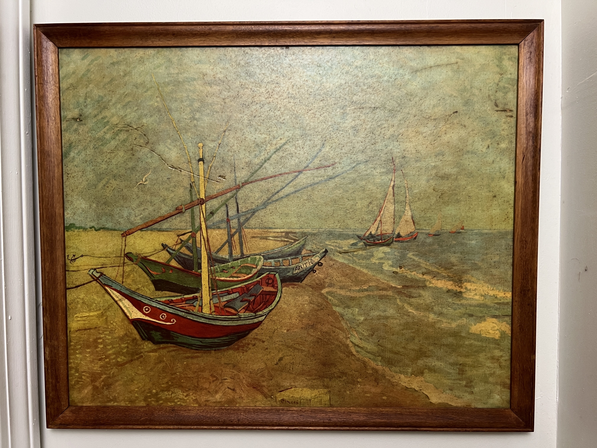 Vintage framed reproduction on board of a Van Gogh painting depicting boats on a beach.