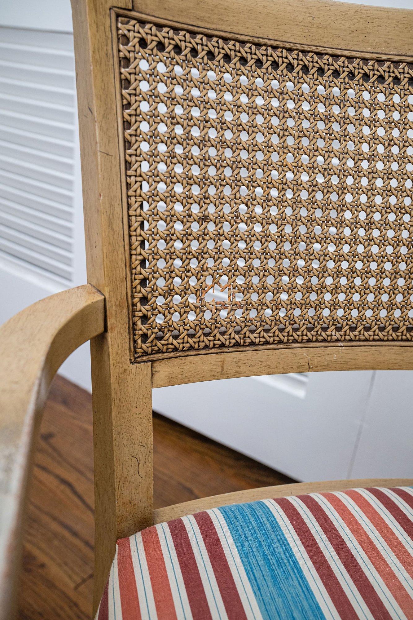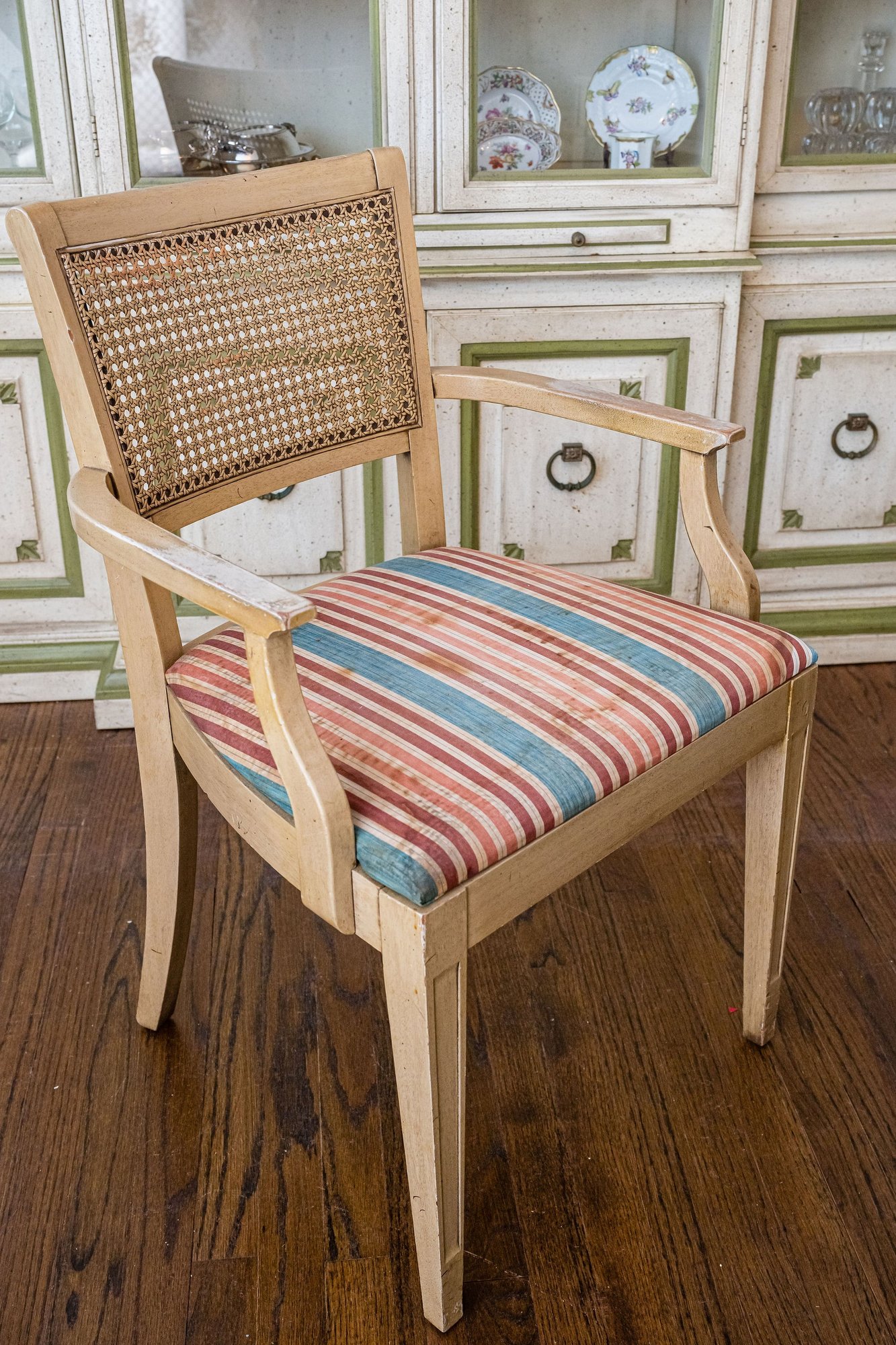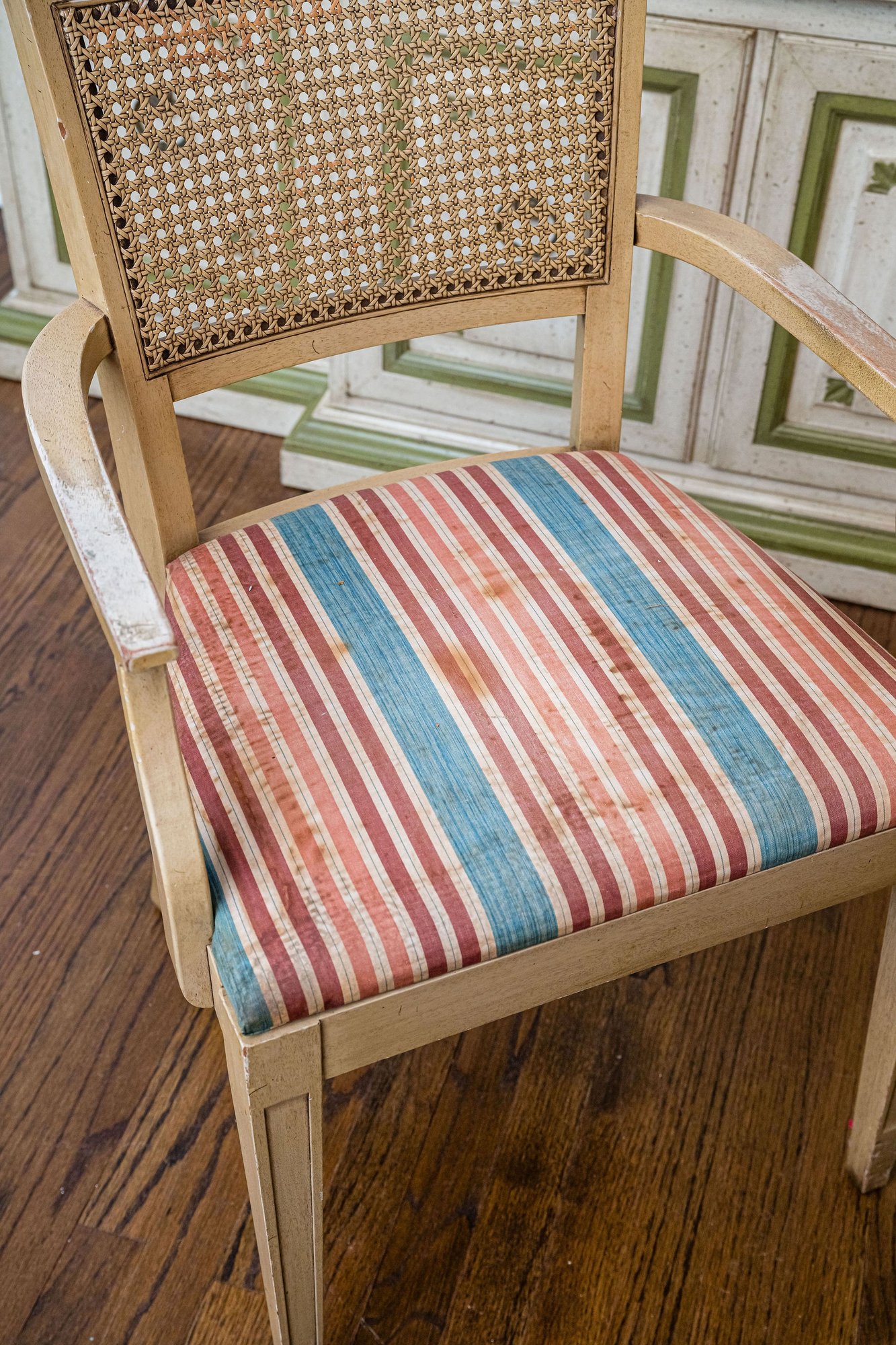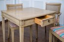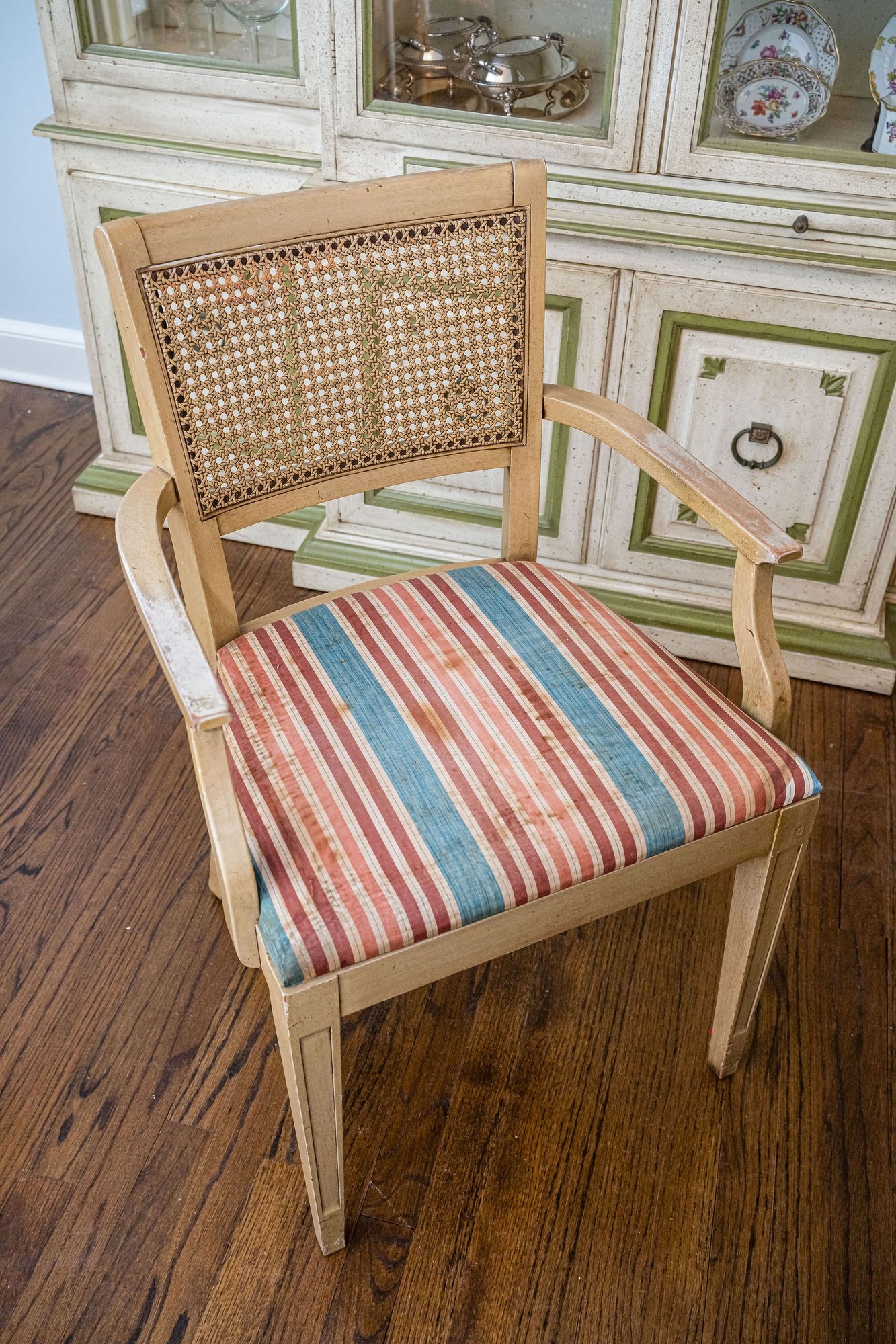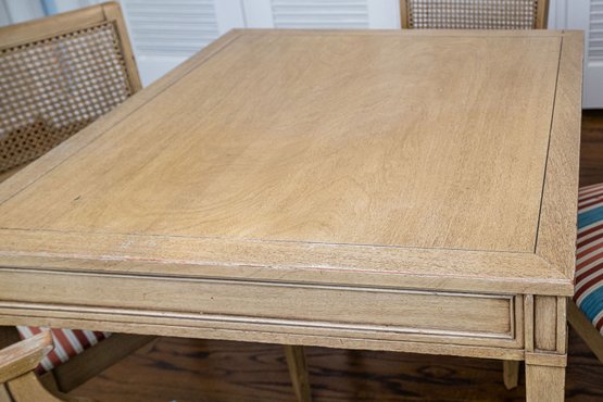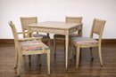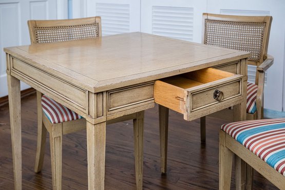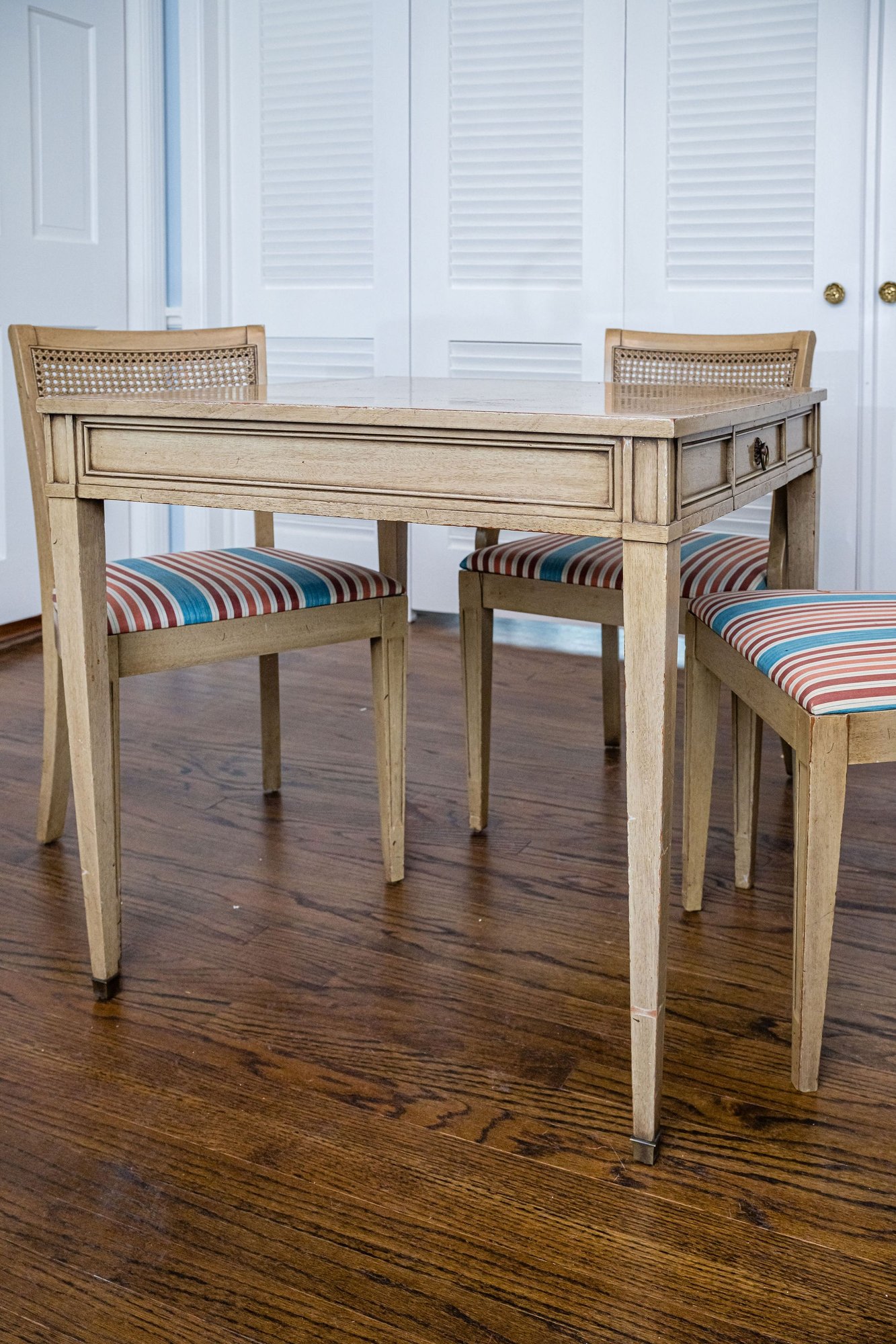 Functional and homey game table or compact dining set with a light washed finish and bright fabric. 2 host armchairs and 2 guest chairs - wear and tear is expected, please review photos for full condition.