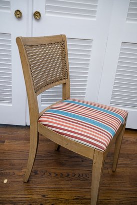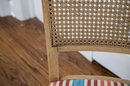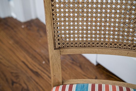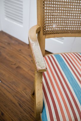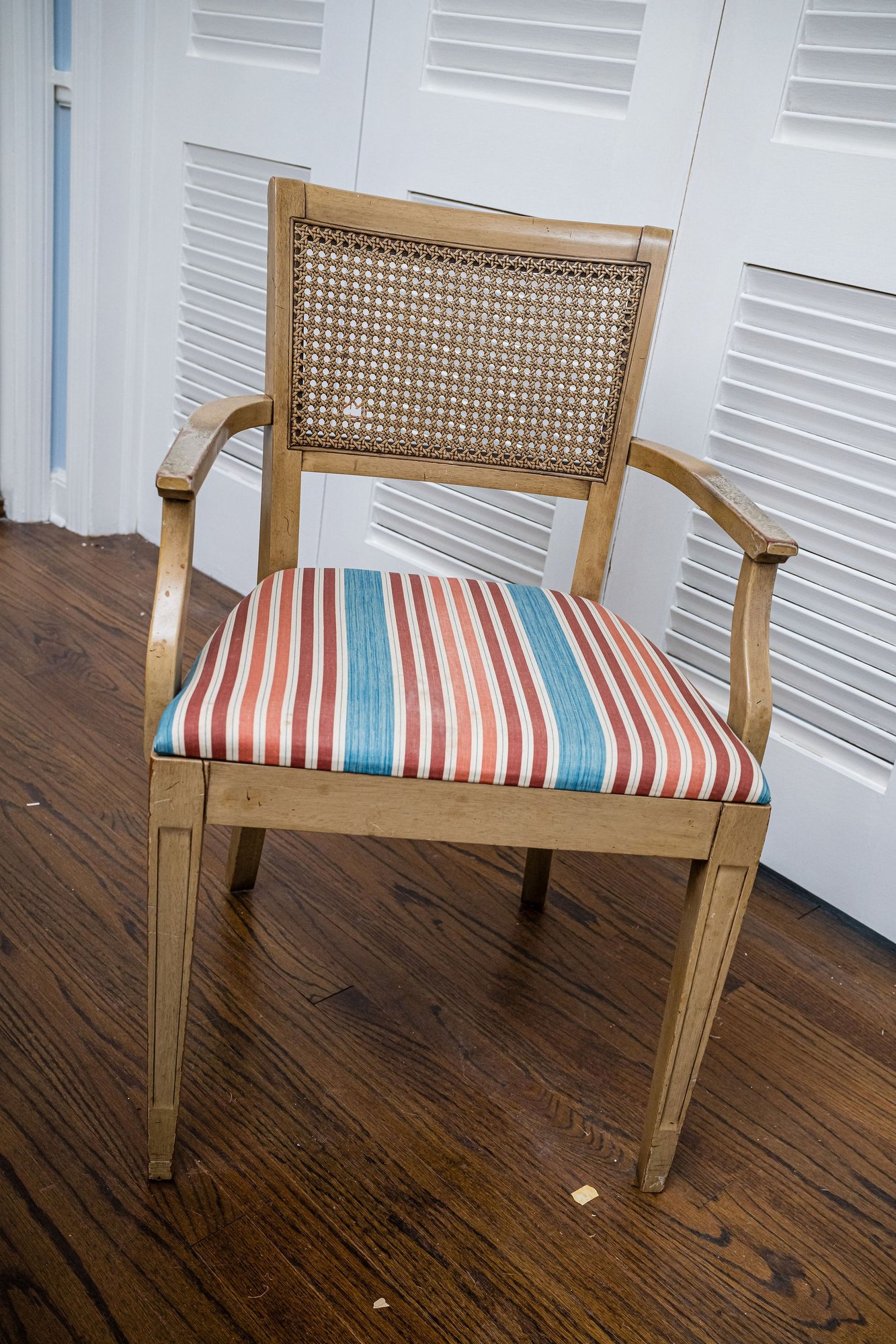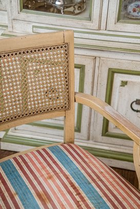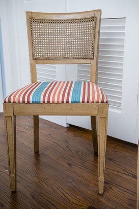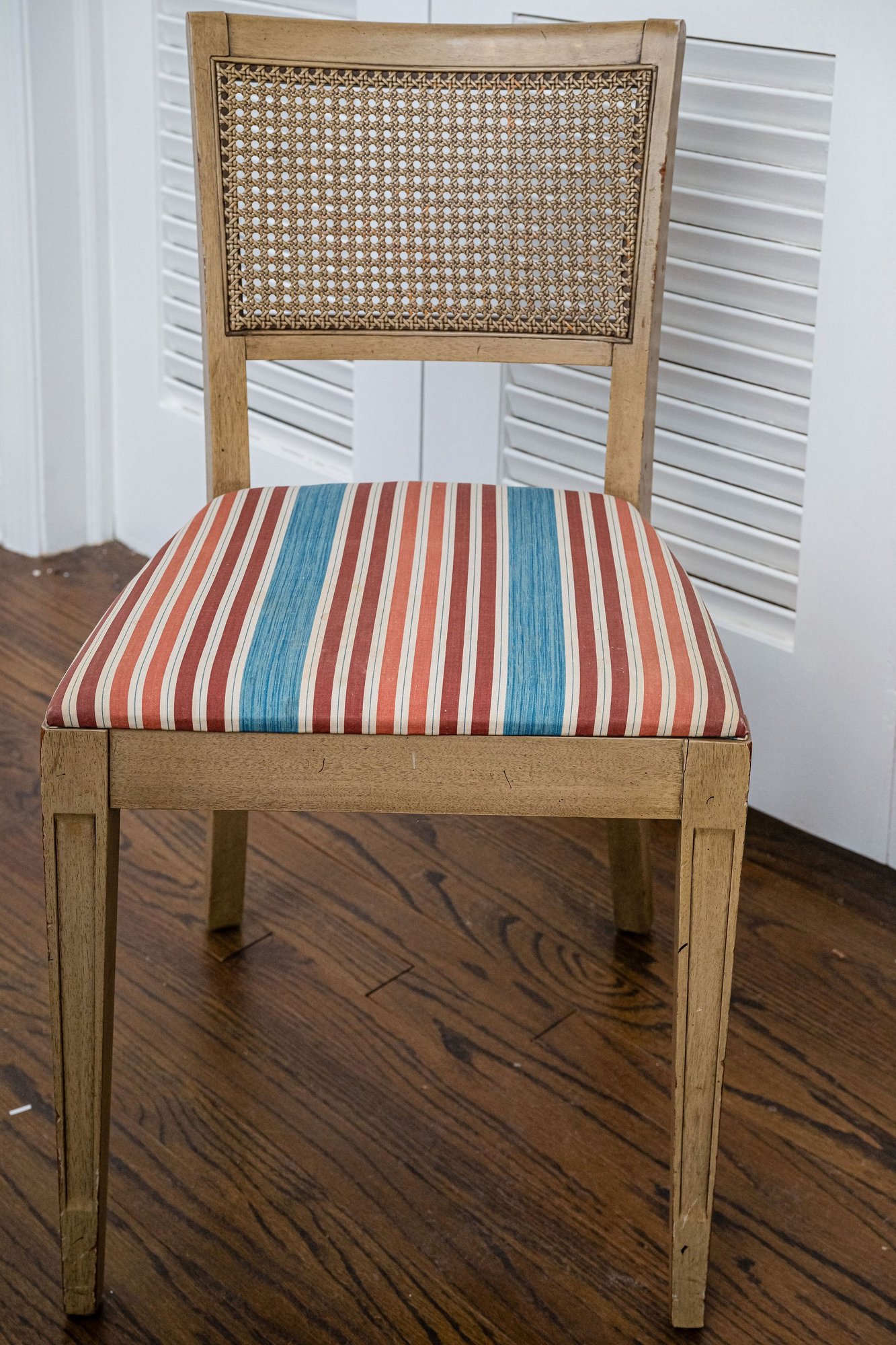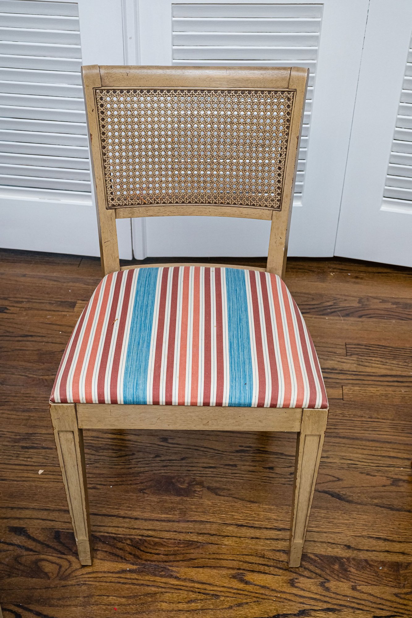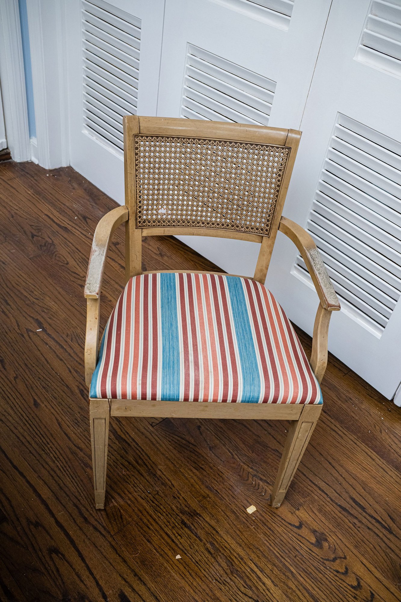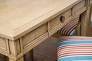 Functional and homey game table or compact dining set with a light washed finish and bright fabric. 2 host armchairs and 2 guest chairs - wear and tear is expected, please review photos for full condition.