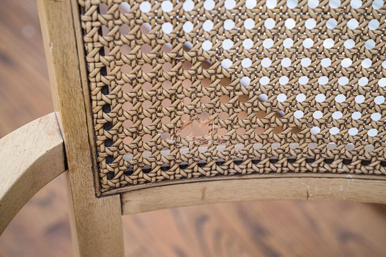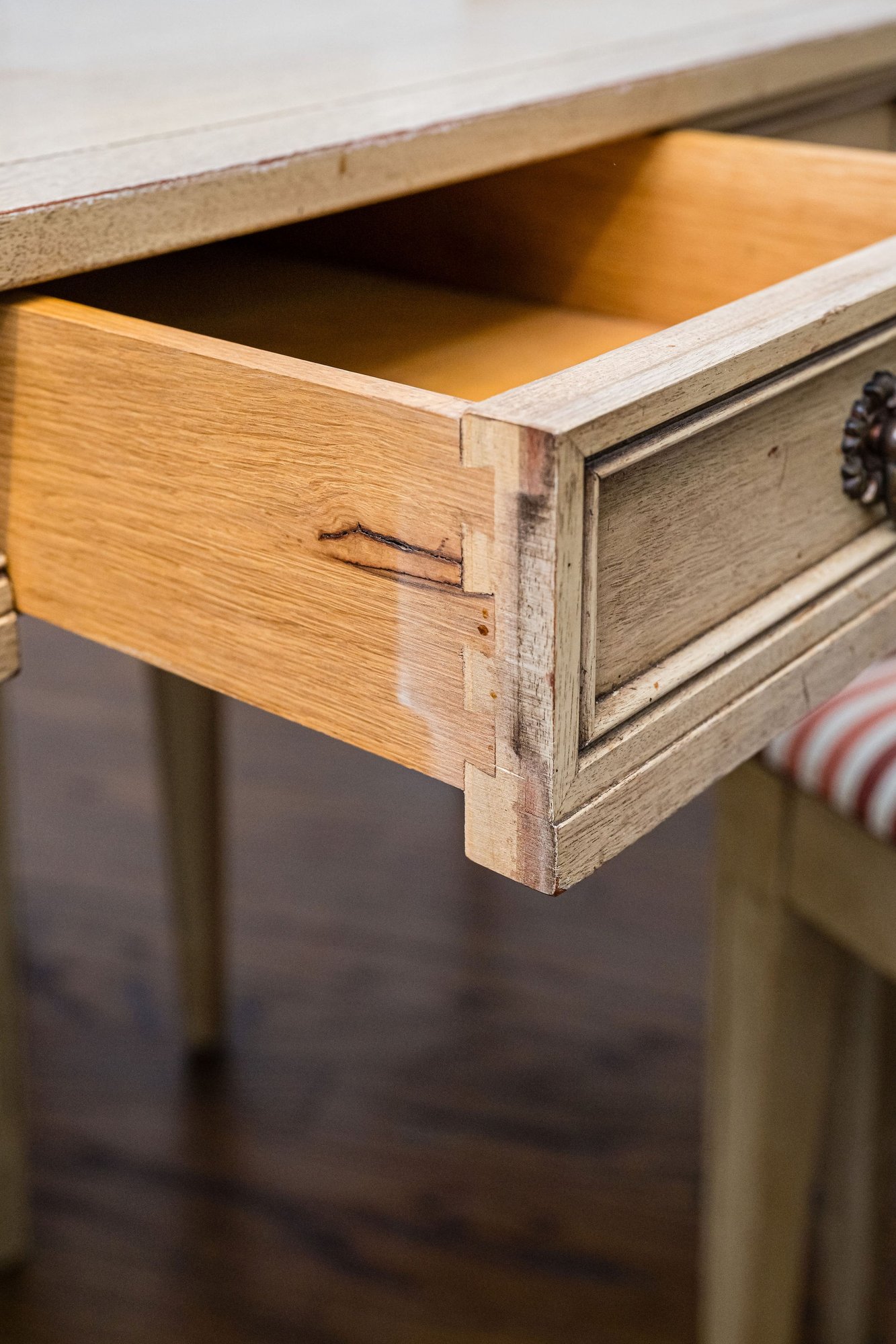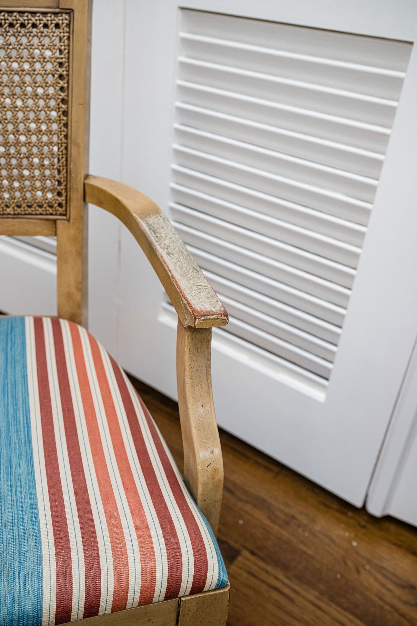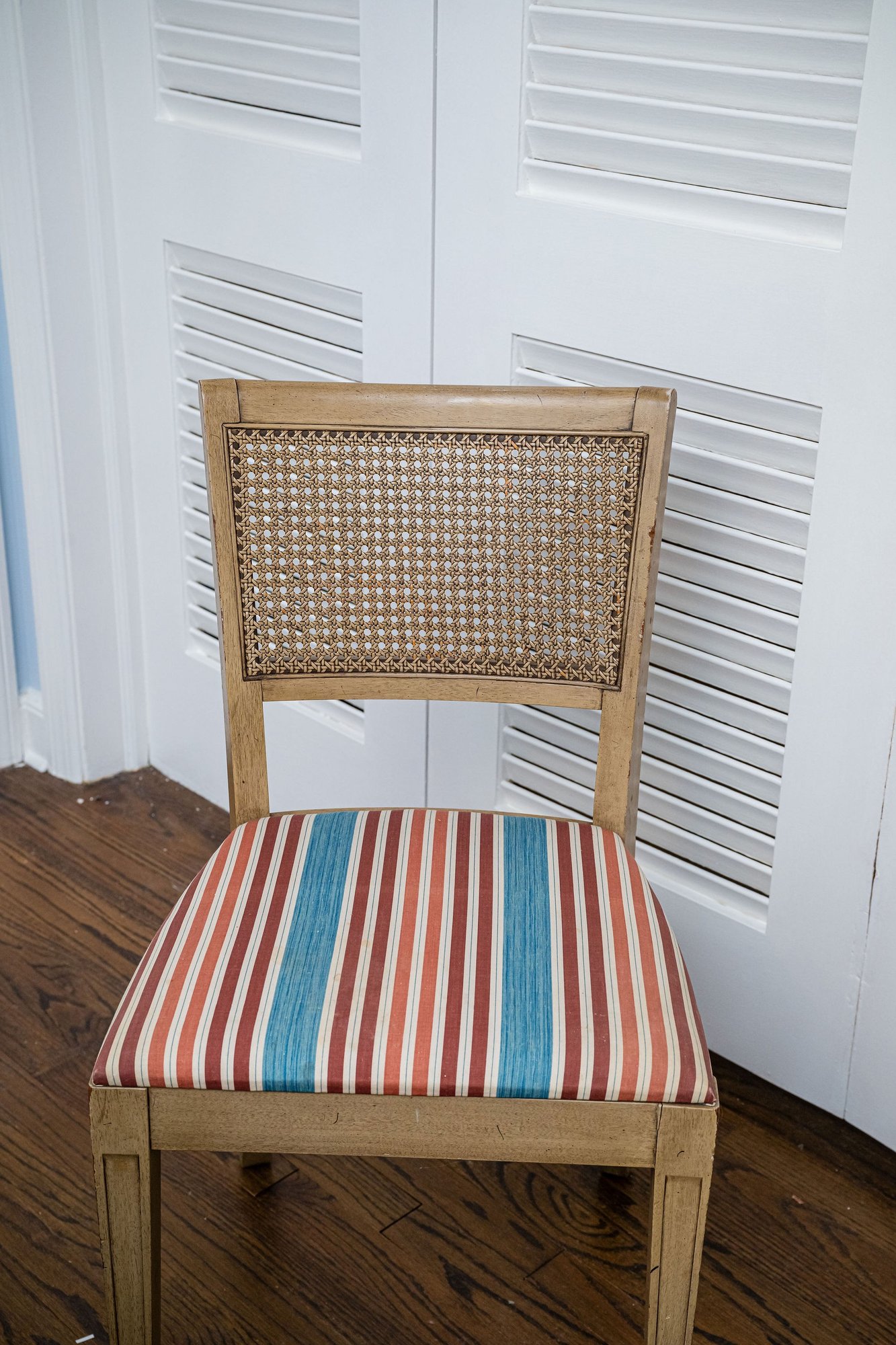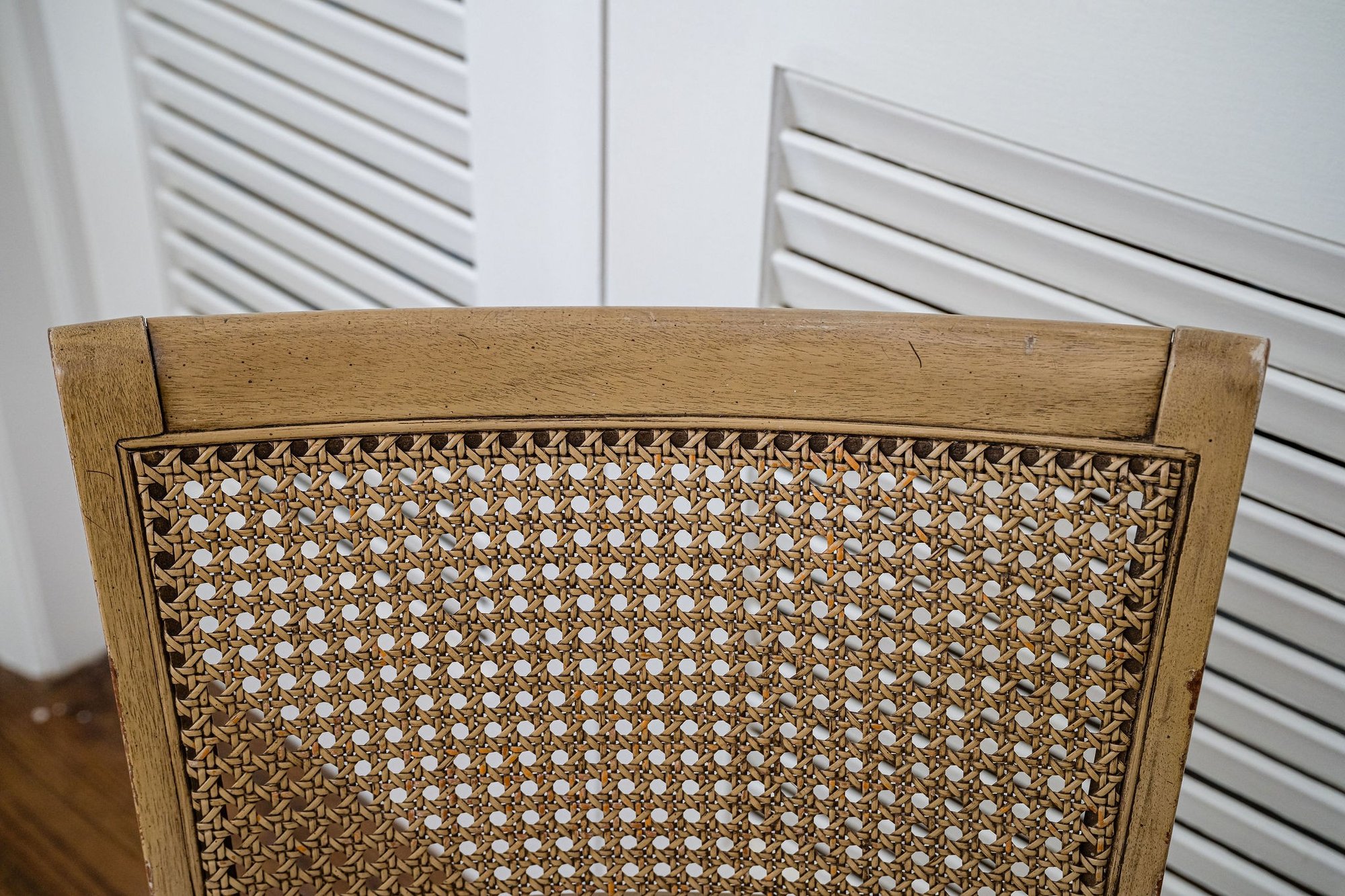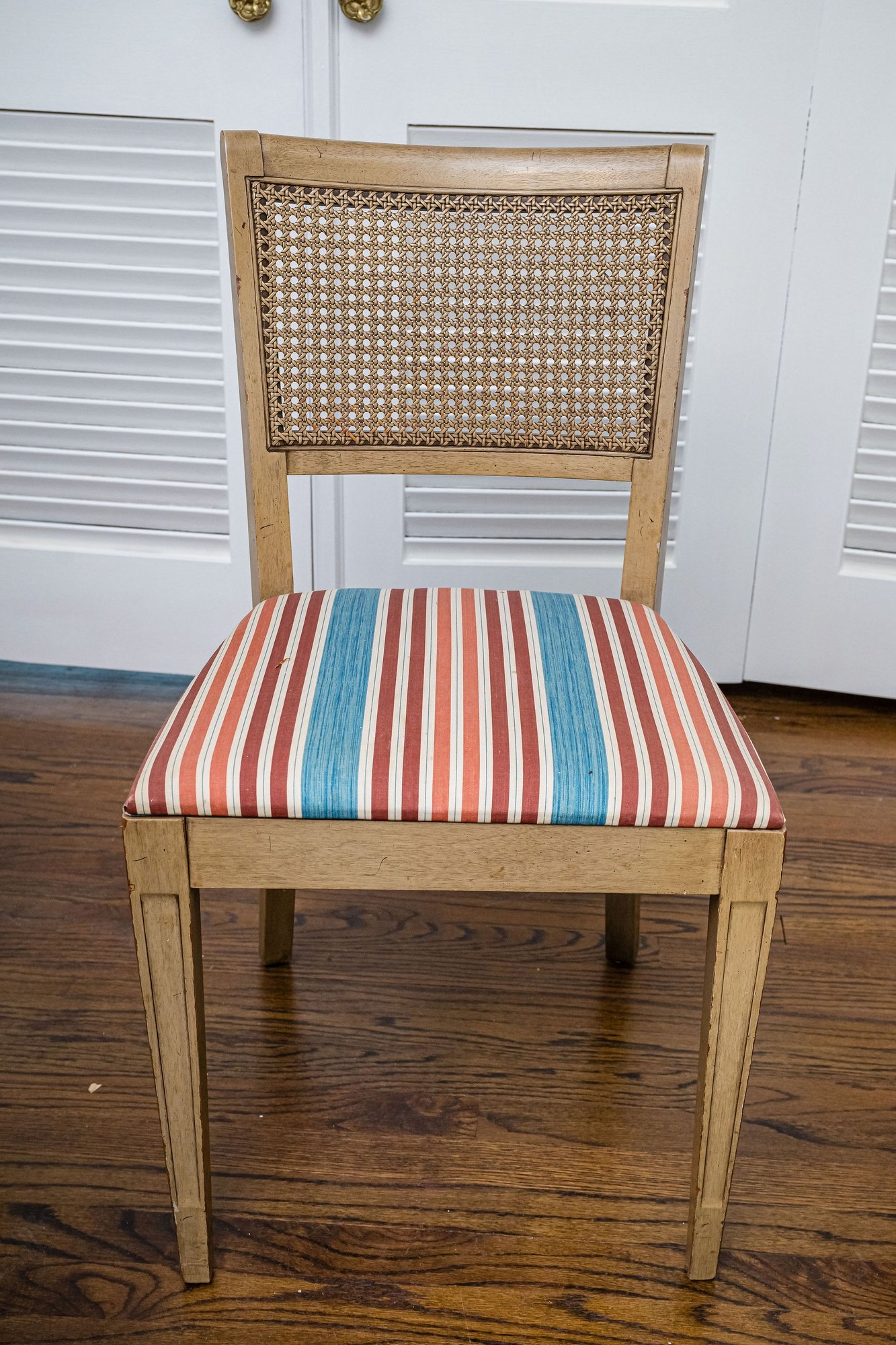Functional and homey game table or compact dining set with a light washed finish and bright fabric. 2 host armchairs and 2 guest chairs - wear and tear is expected, please review photos for full condition.