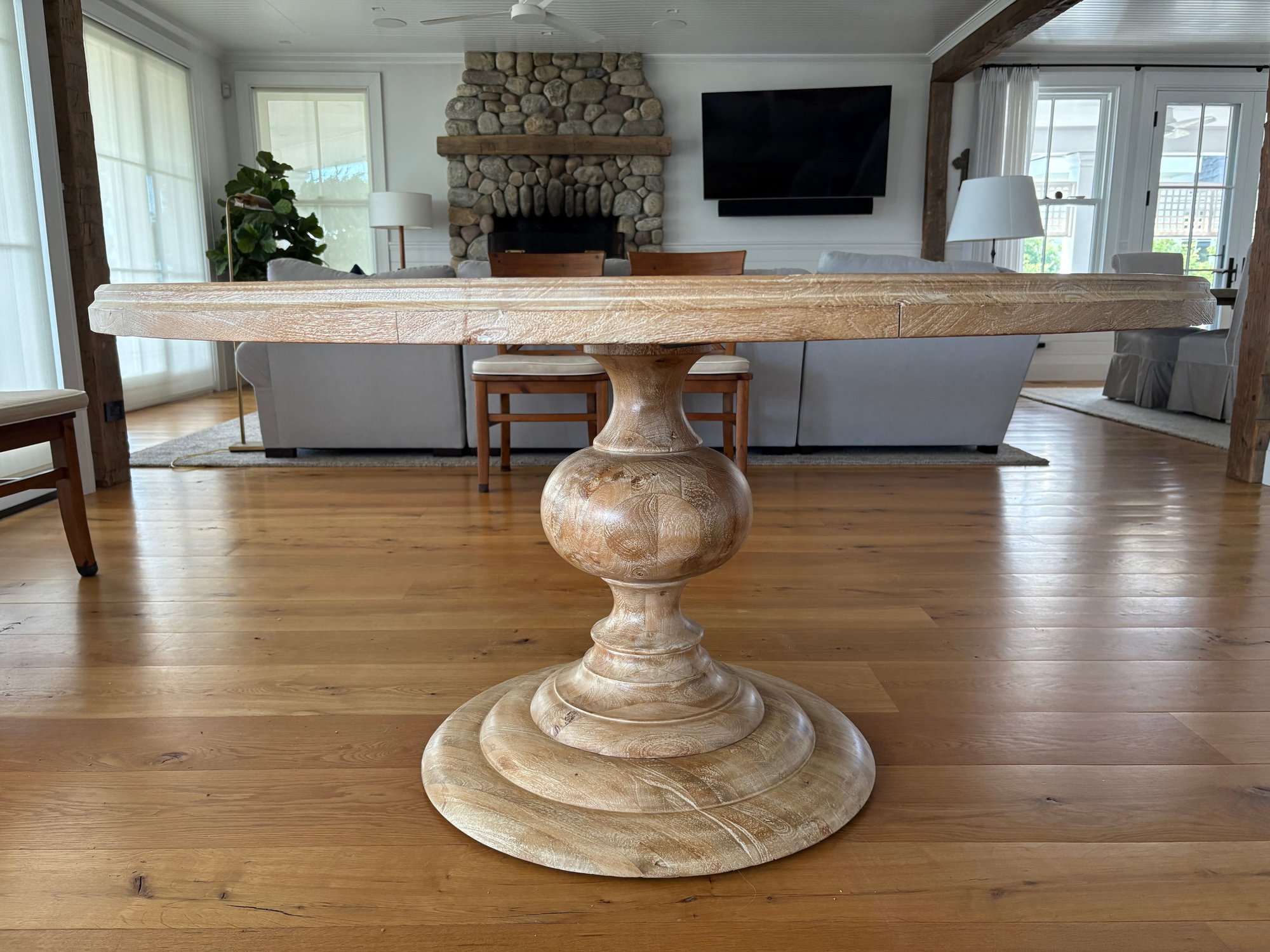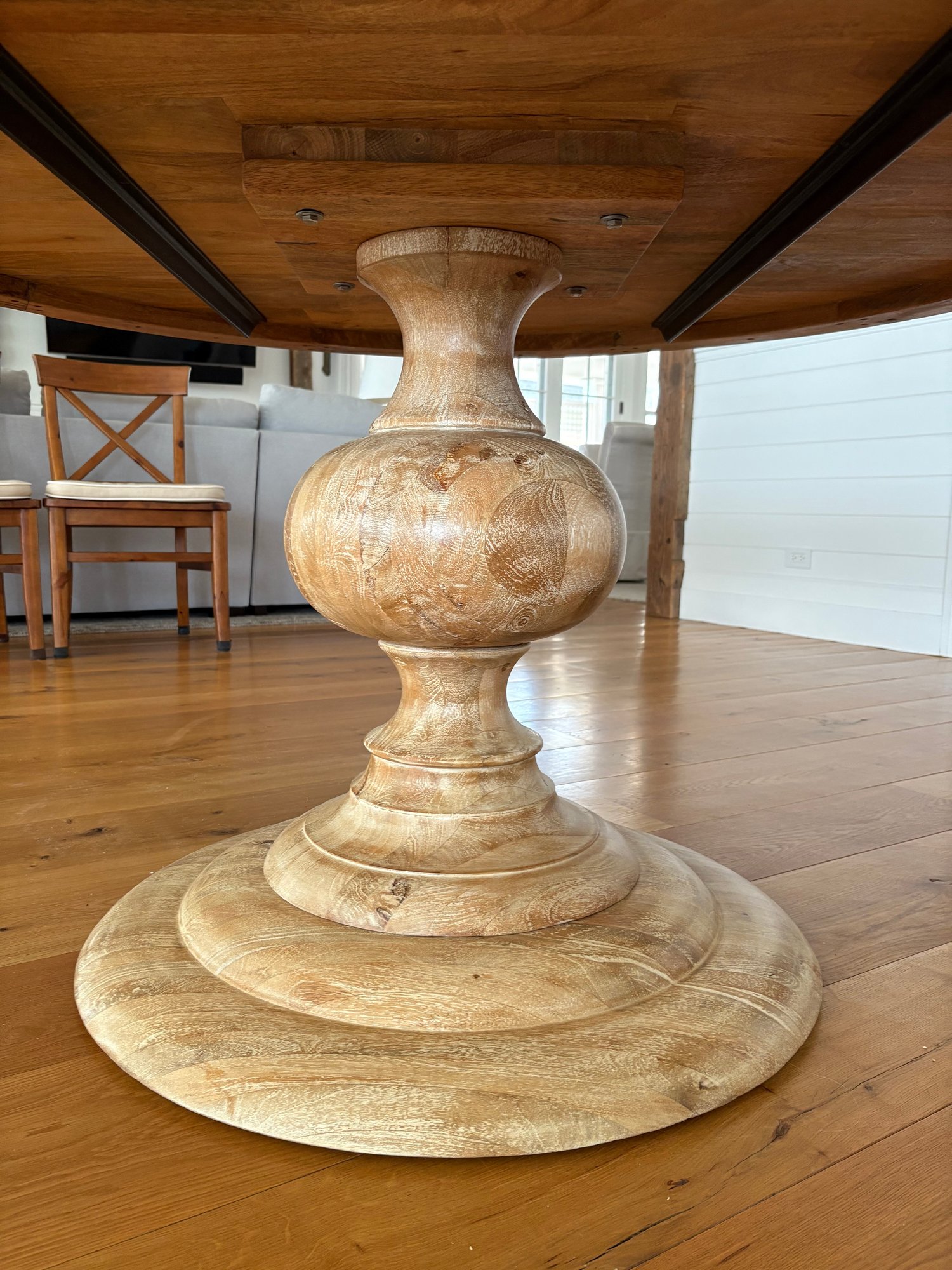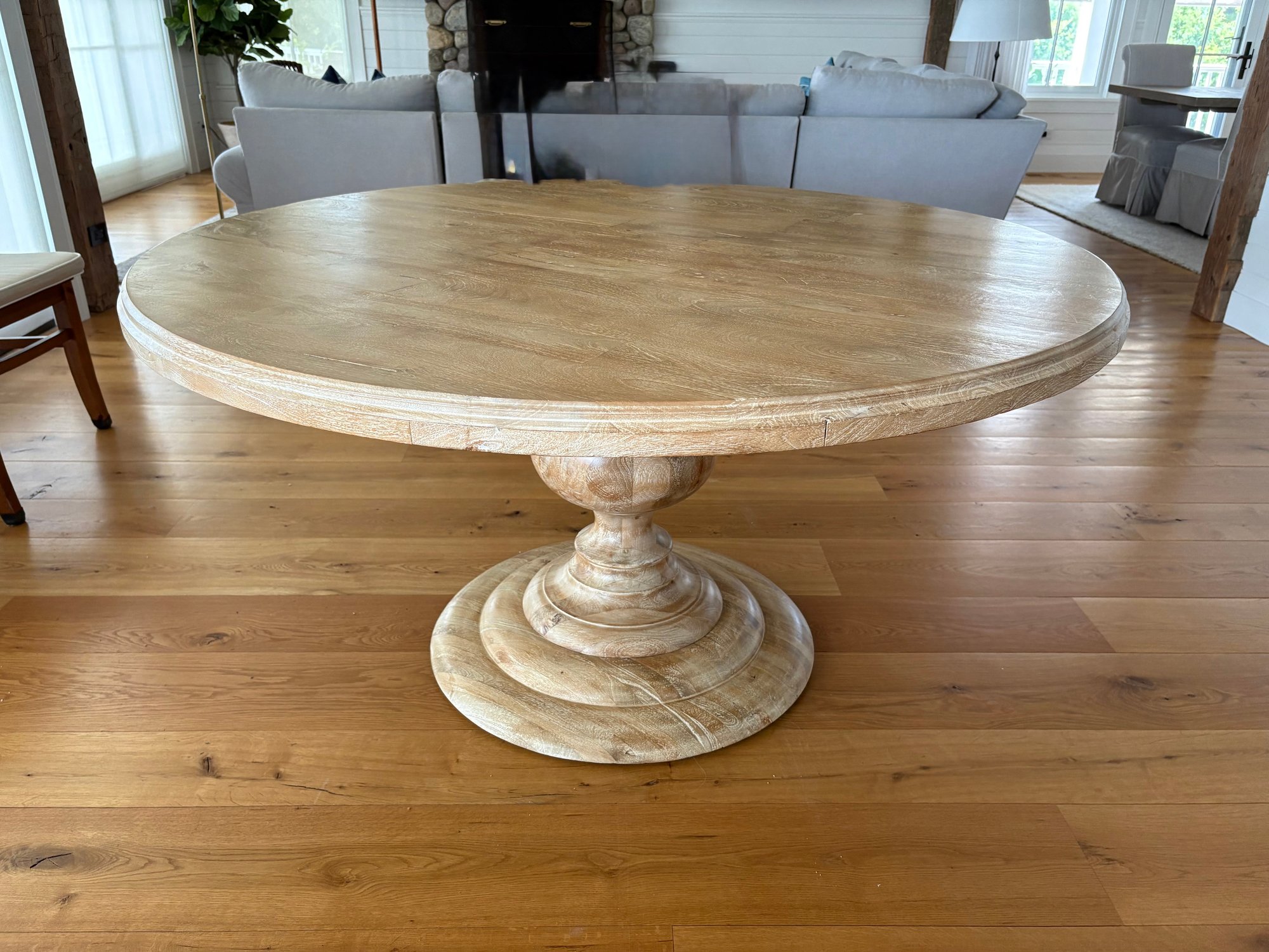 This wood dining table features a round tabletop supported by a chunky, turned pedestal base, lending it a classic and elegant French Country style.