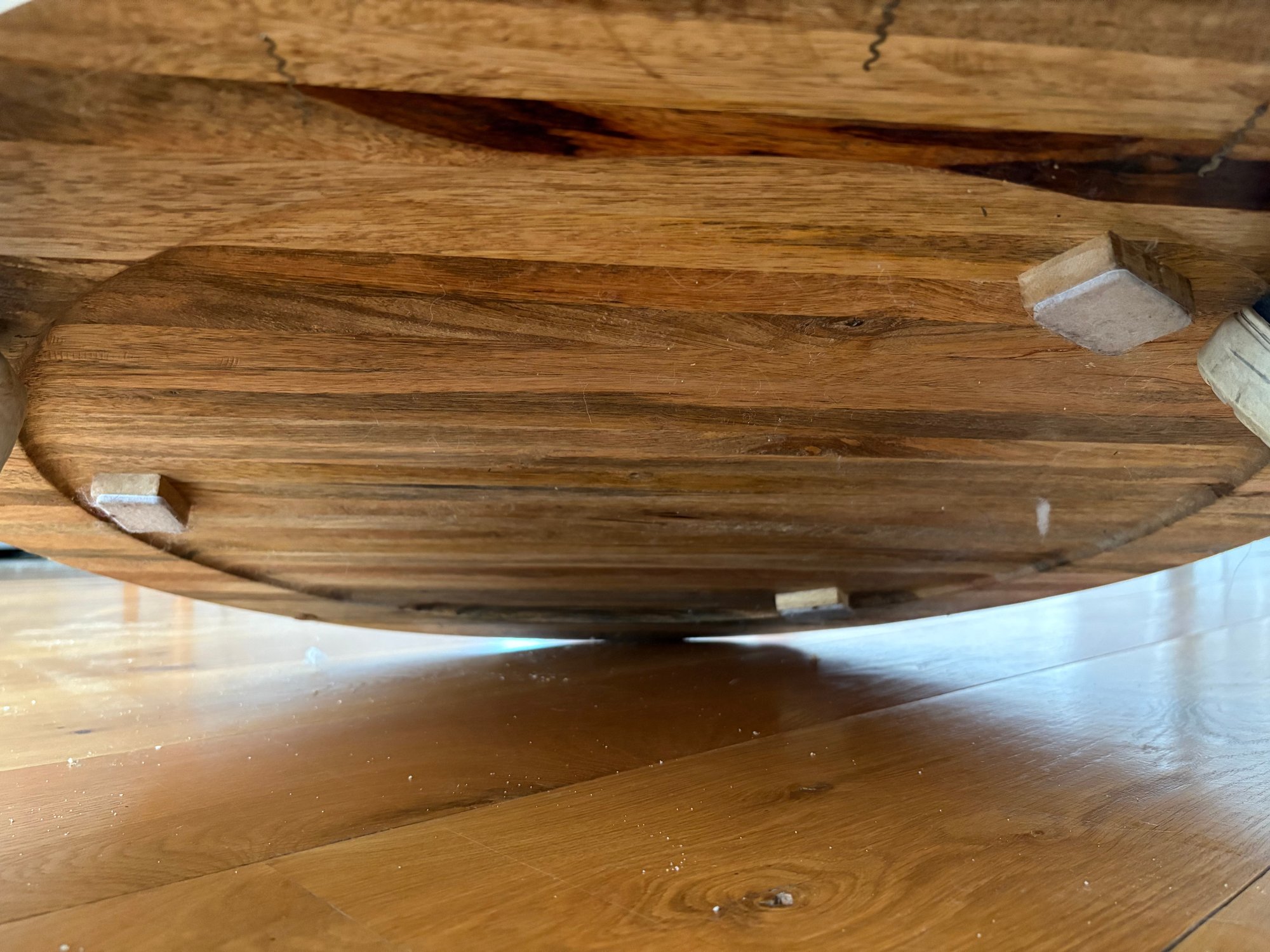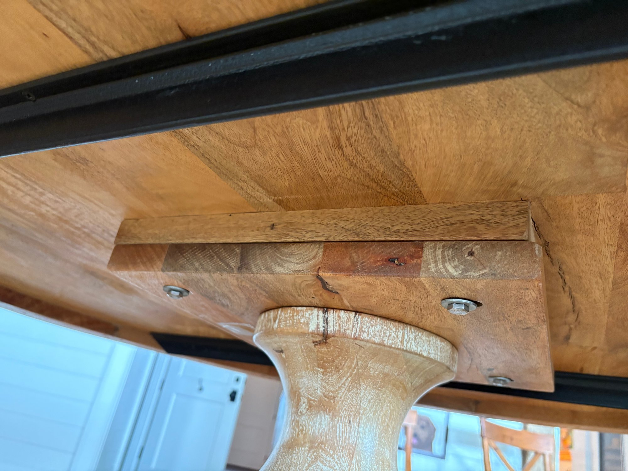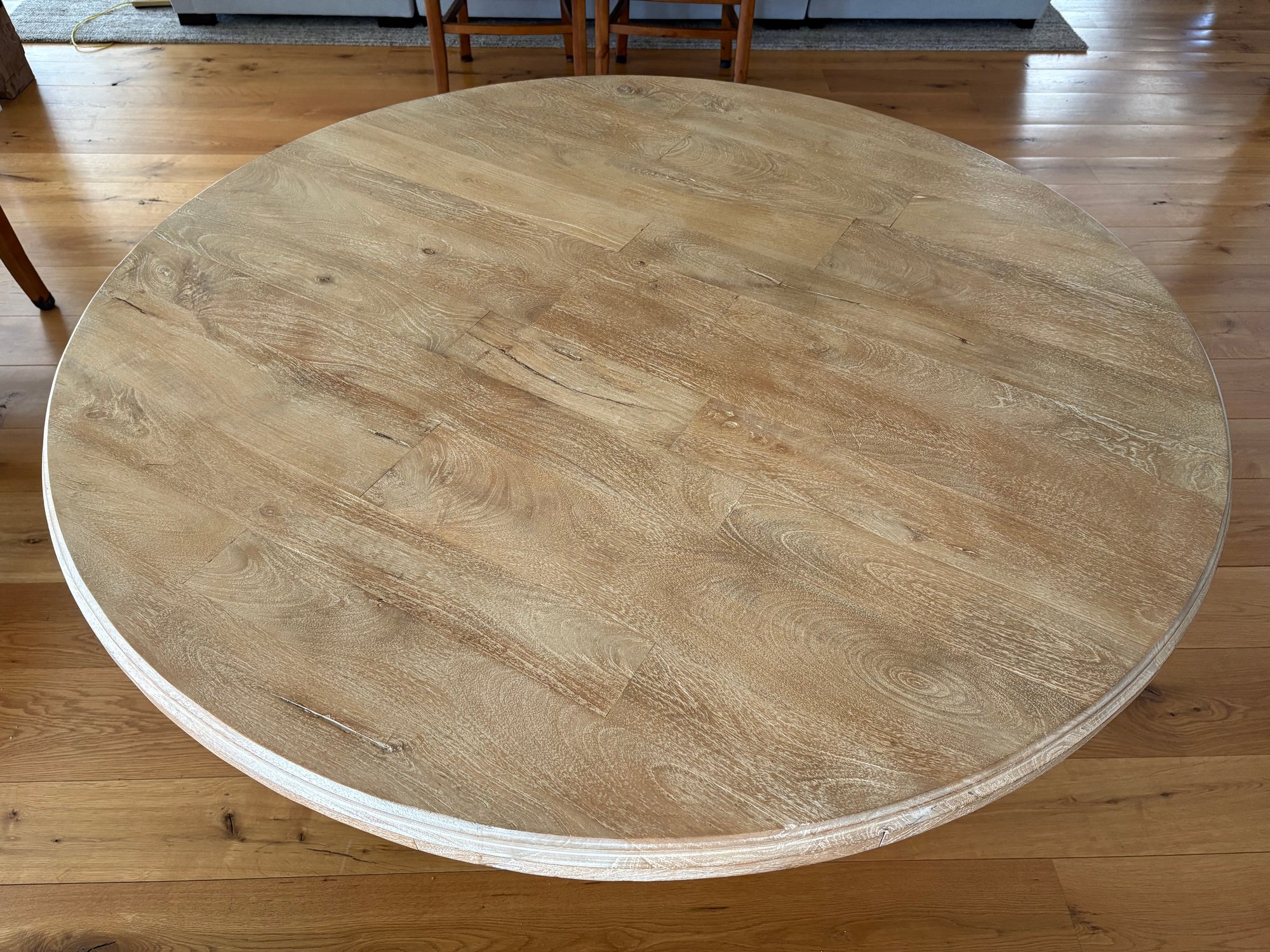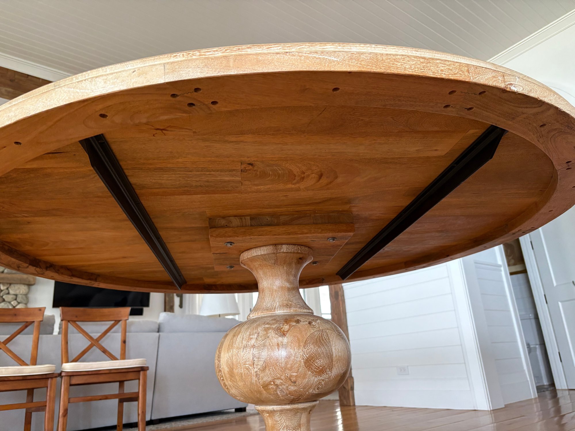 This wood dining table features a round tabletop supported by a chunky, turned pedestal base, lending it a classic and elegant French Country style.
