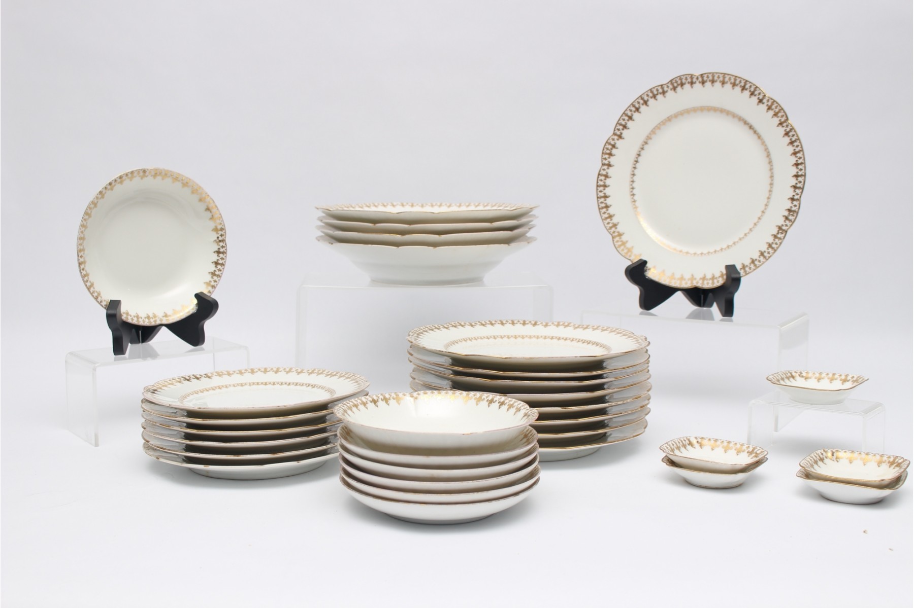 Antique assortment of Limoges, France porcelain pieces with gold Fleur-de-lis pattern and scalloped edges, market William Wilhem & Grafe, New York, D& Co France, R. Dekliniertes & Co.