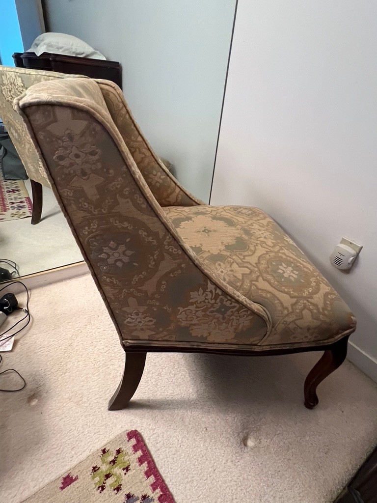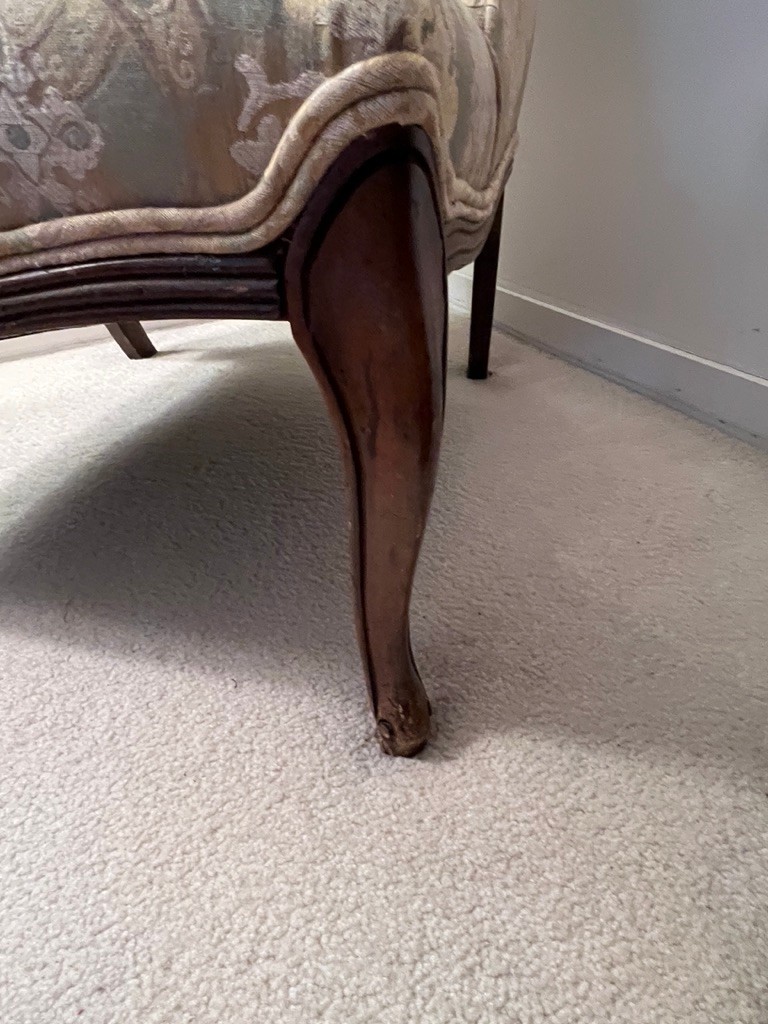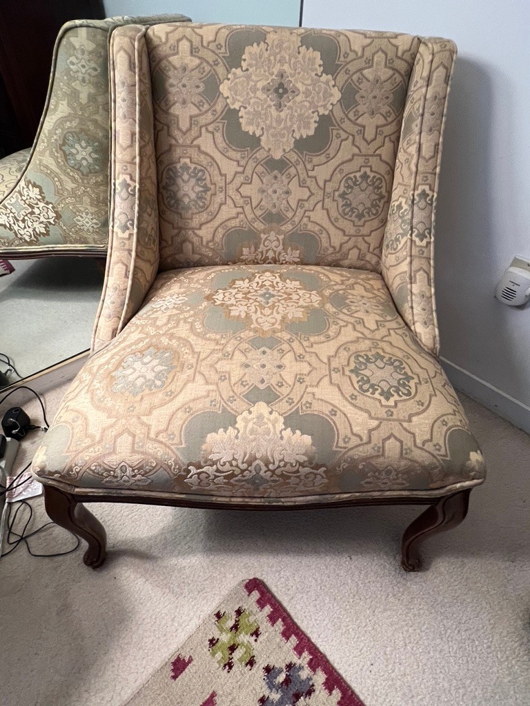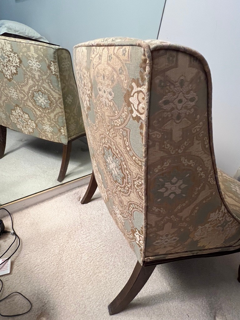This is a French provincial wingback accent chair with damask upholstery.