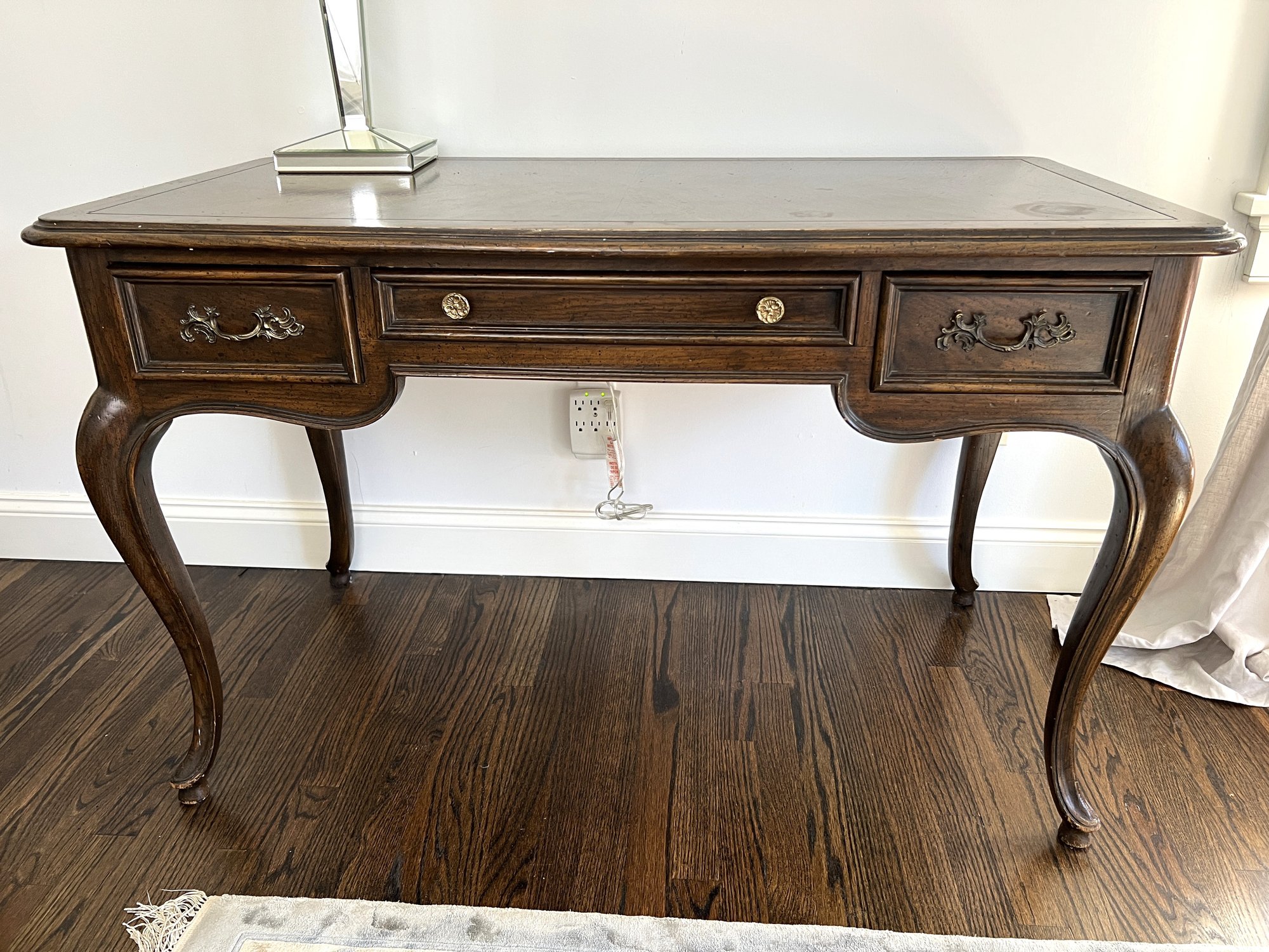 French Provincial style desk in a walnut finish with cabriole legs and three drawers.