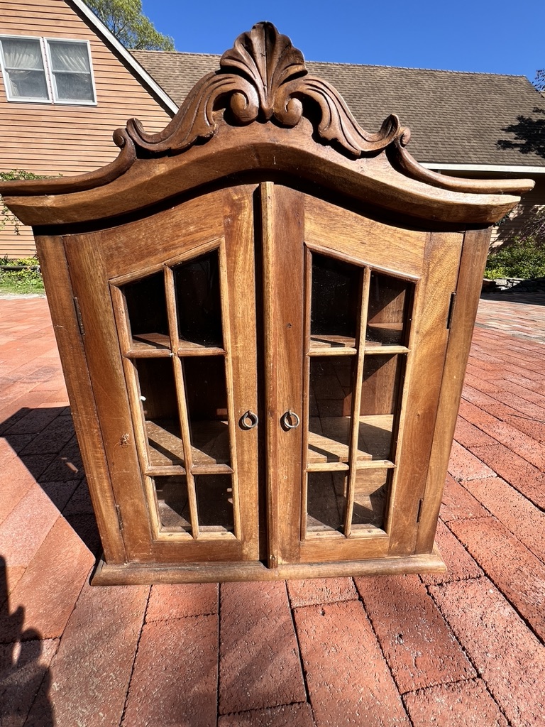 Sweet piece, great size for anywhere, French style, curio cabinet, with glass fronts and sides, can be hung, or sits on a dresser/cabinet/counter
