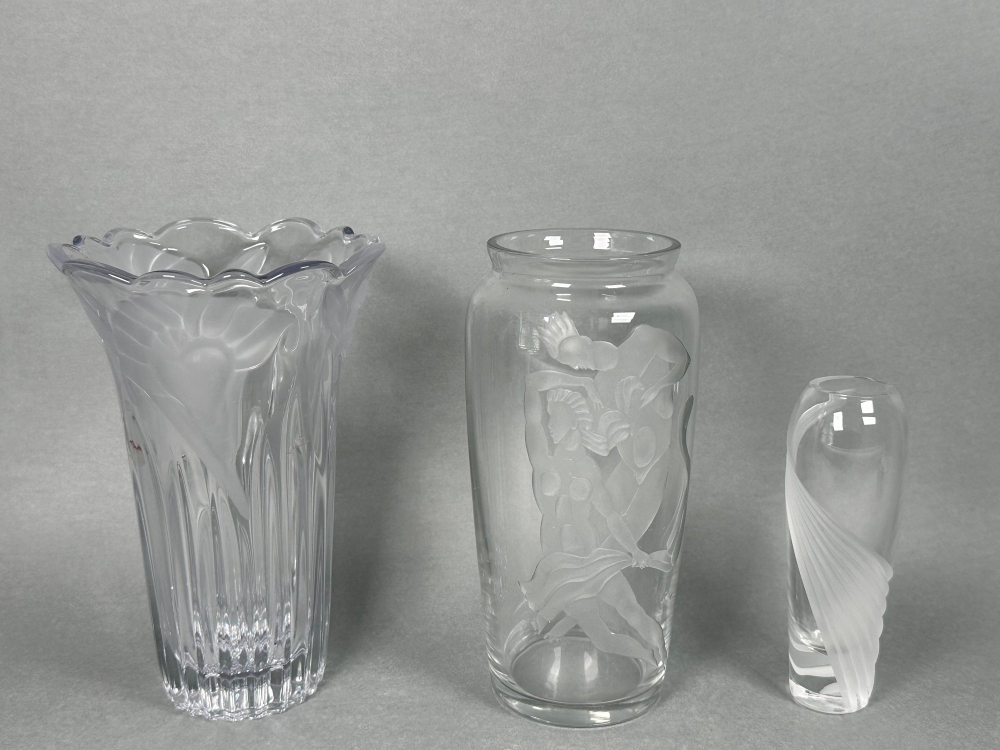 Three frosted glass etched vases including one that has two figures, there’s also a smaller Lenox vase and a larger floral design. Good ready to use condition. Larger one is 10” tall. Shorter is 7.5” tall.