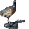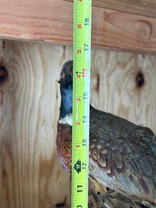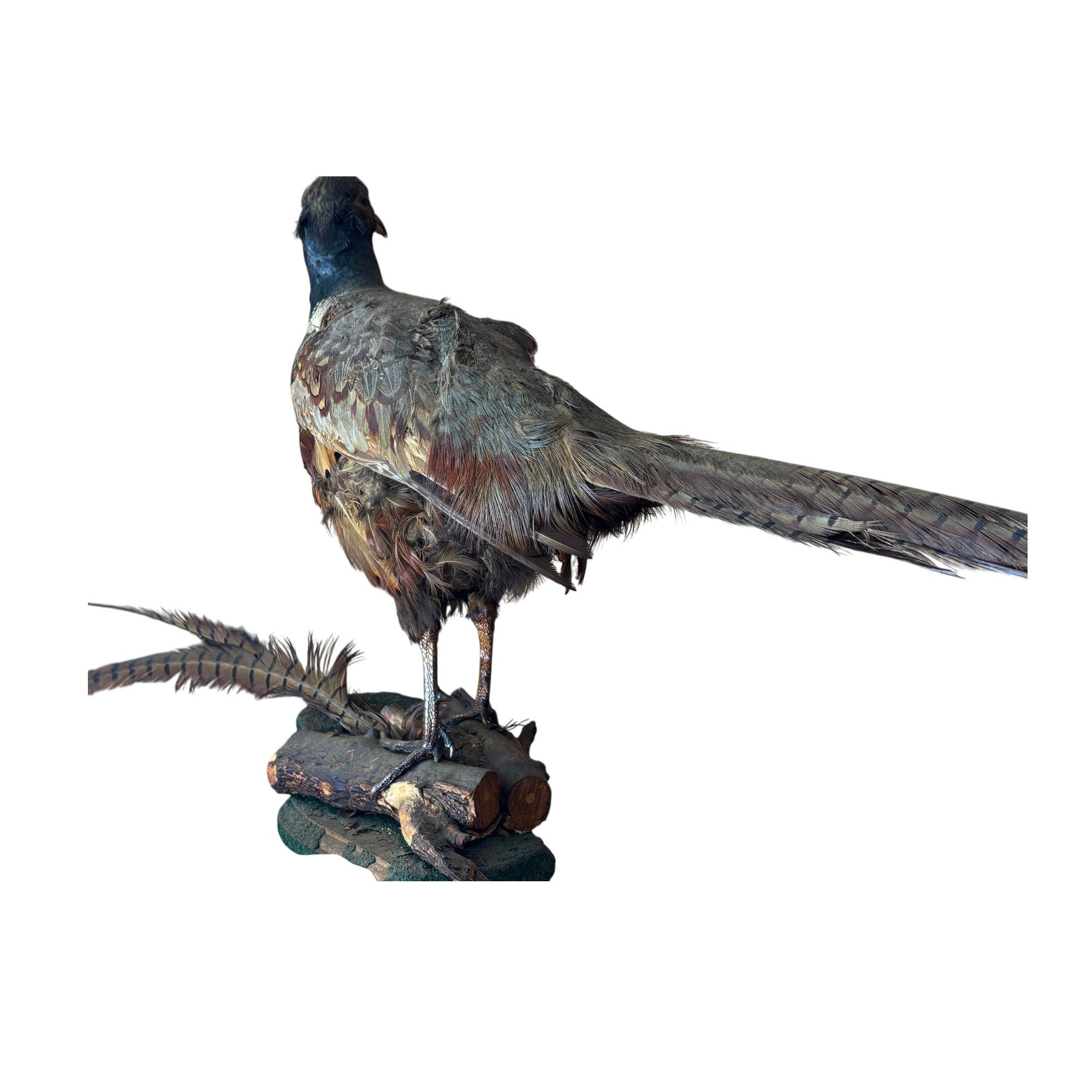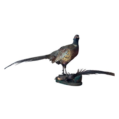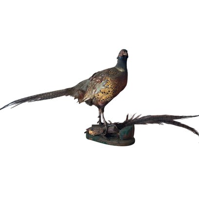 Striking full-size taxidermy pheasant mount featuring rich, natural coloration, layered feather detail, and an impressive elongated tail. Presented in a classic standing pose on a sculpted base, this piece brings instant lodge, library, or hunting-cabin character to any space. Perfect as a statement décor accent, for collectors of sporting antiques, or for adding a touch of old-world wilderness charm to shelves, mantels, or display cabinets. A bold and beautiful example of traditional taxidermy craftsmanship.