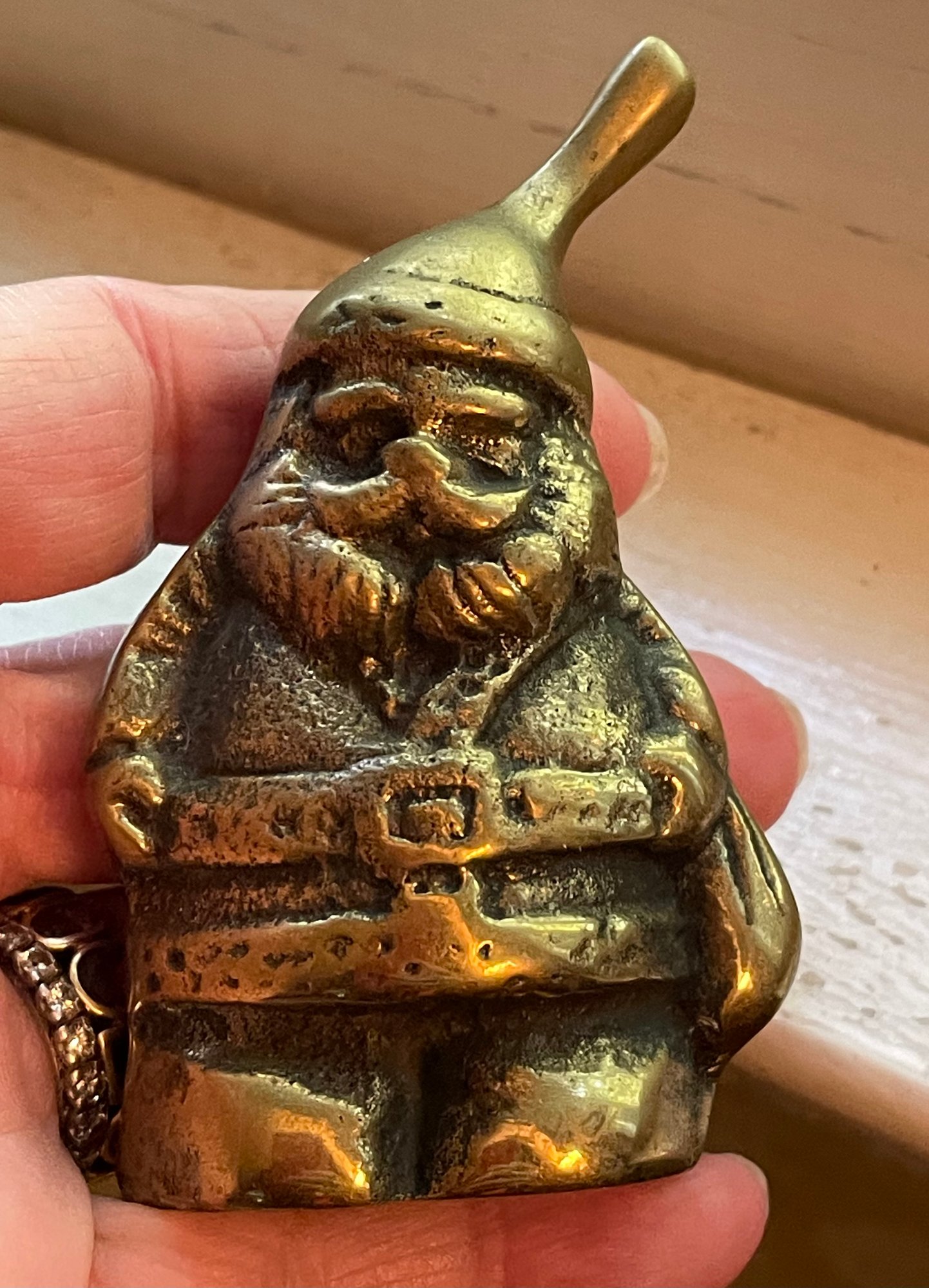 A sweet solid brass bell in the shape of Santa Claus. It's in very good condition. The bell is 3 1/4" high.