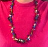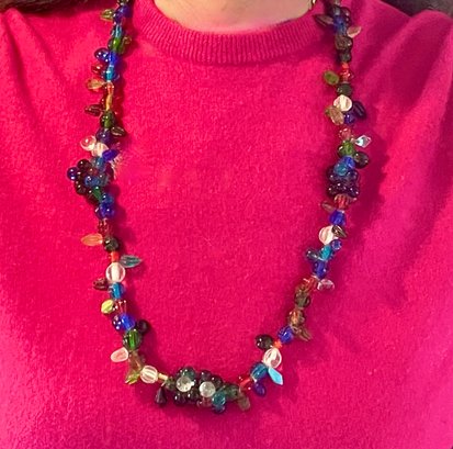 A fun fruit-like necklace with a wonderful variety of colorful glass beads. A number of them look like bunches of grapes and other fruits and berries. It has a barrel clasp if needed. The necklace is 30 1/2" long, and it's in very good condition.