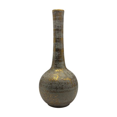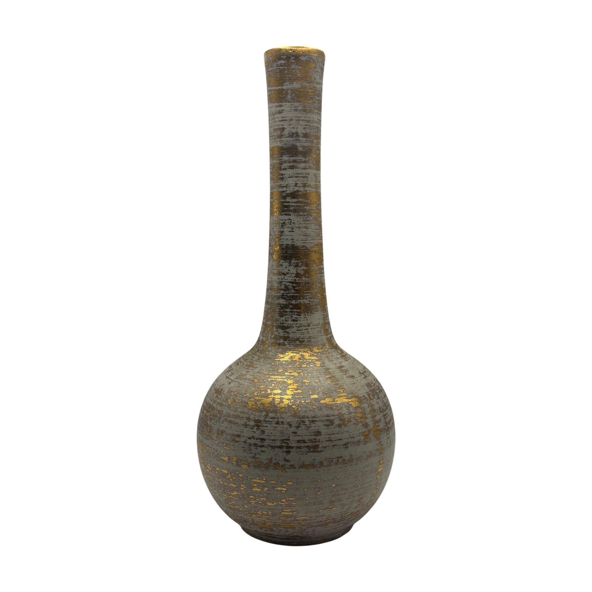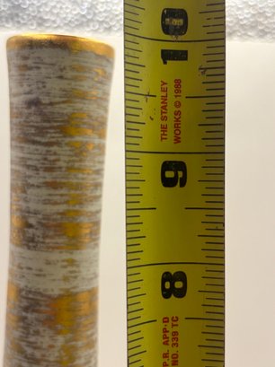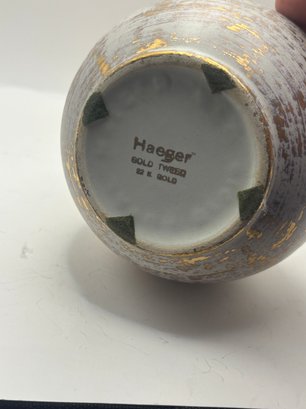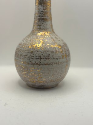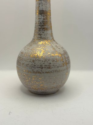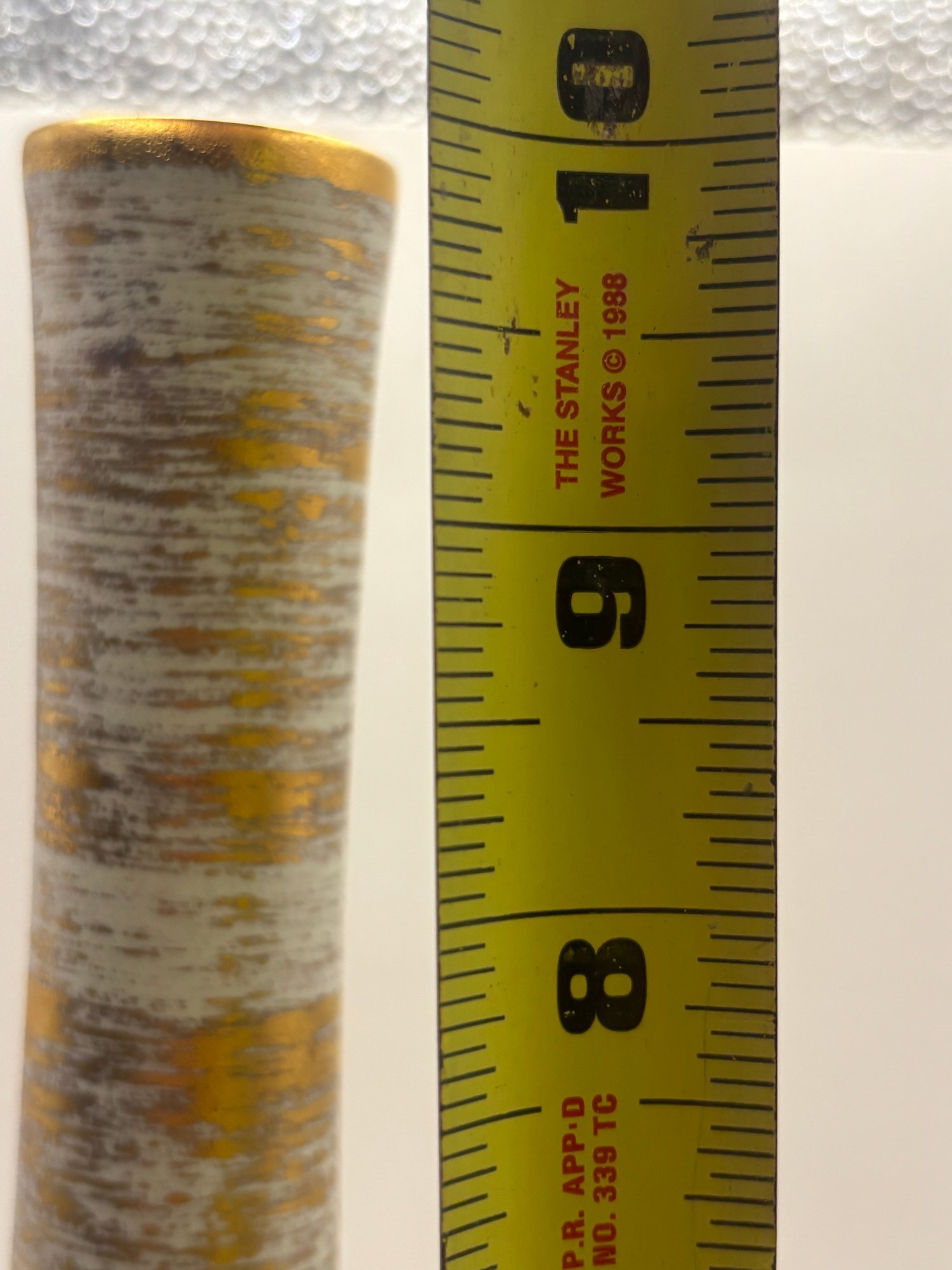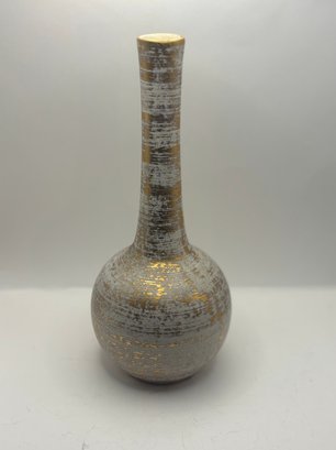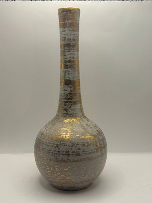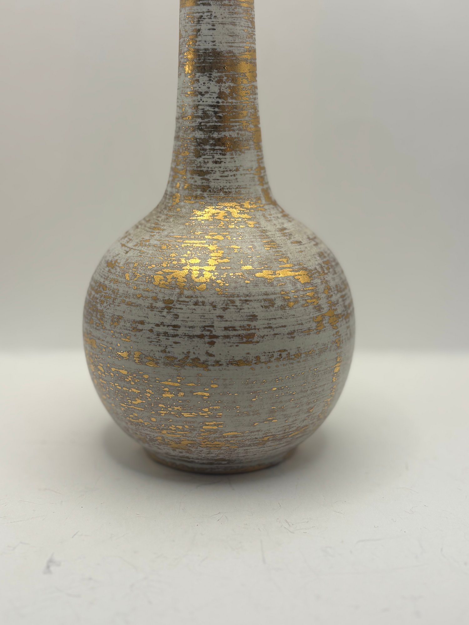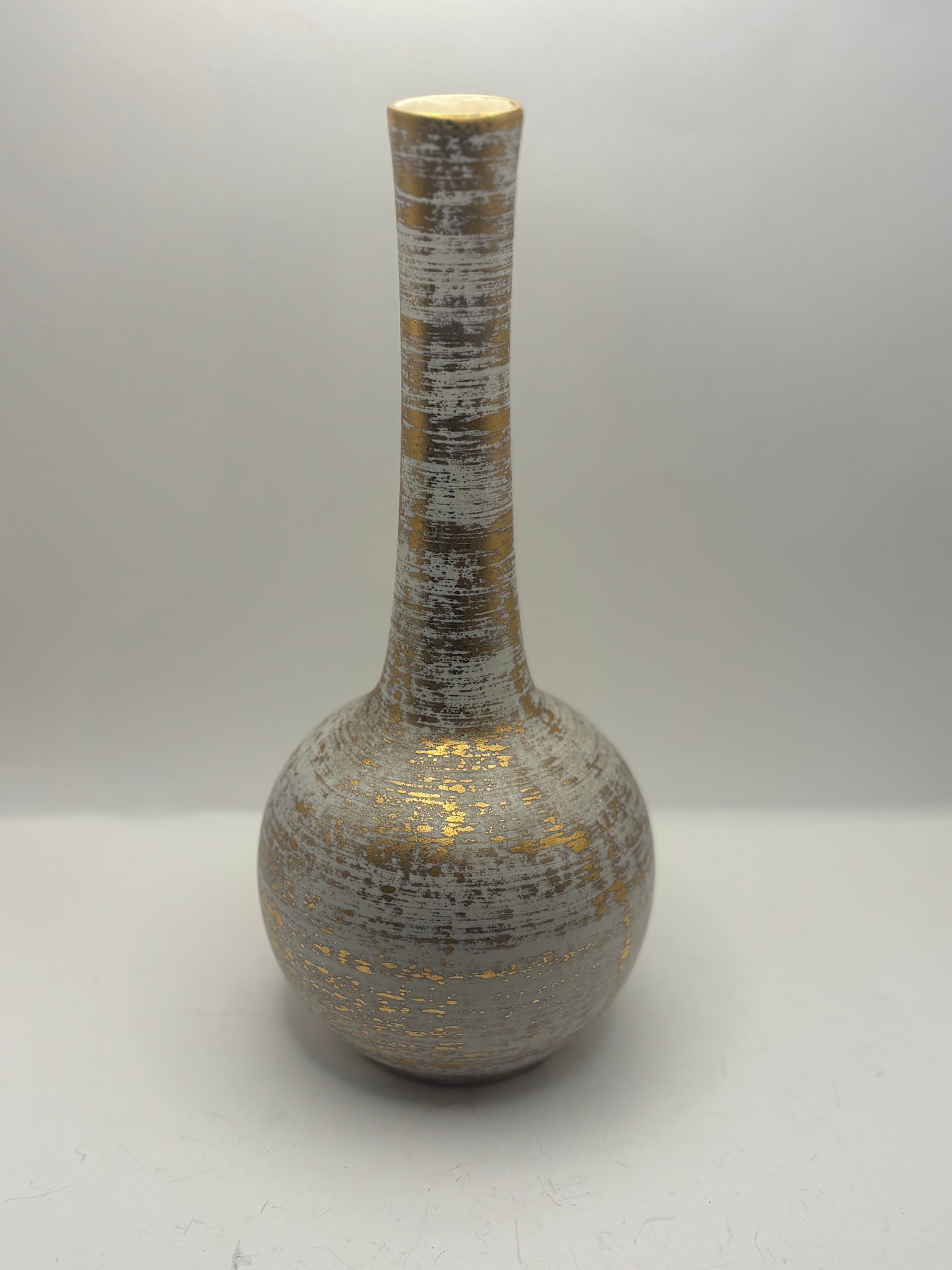 Classic Haeger art pottery in the sought-after “Gold Tweed” finish, featuring a textured gray-and-gold surface with 22K gold accents throughout. Tall bottle-form silhouette with a rounded belly and slender neck—an easy statement piece for a console, bookshelf, or MCM-style vignette. Marked on the base: “Haeger / Gold Tweed / 22K Gold.”