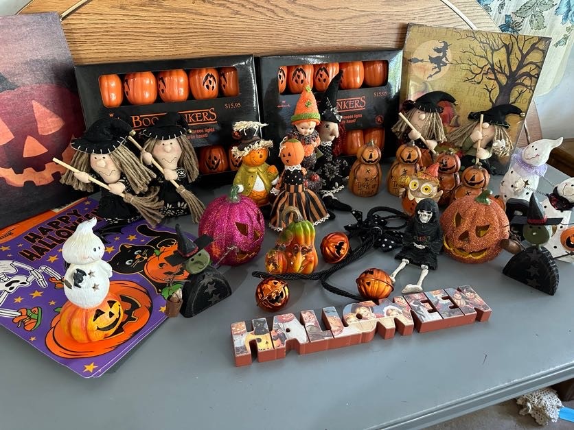 2 boxes string lights, pictures, lighted pumpkins, ghosts, witches. Huge lot. Great halloween display