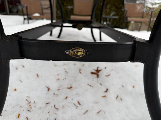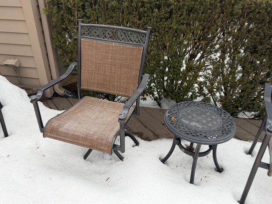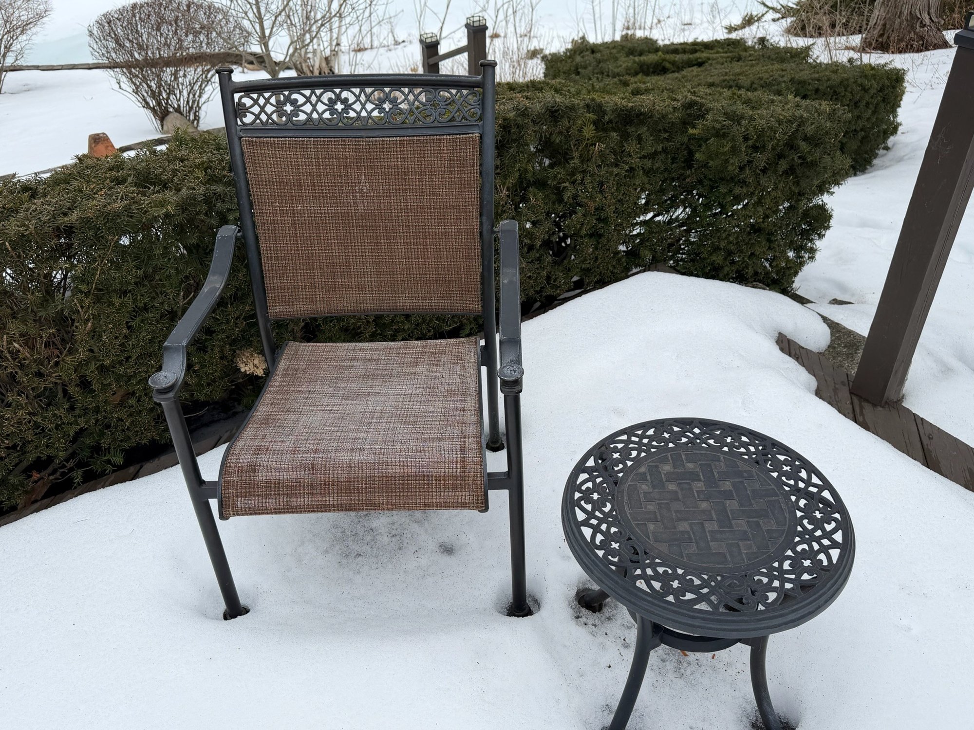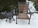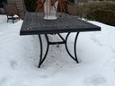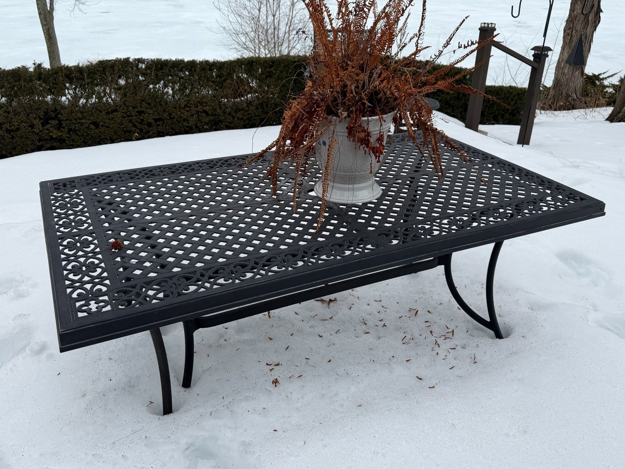 Includes table, 6 chairs, 2 side tables, has wear. Table measures 40" x 70" x 28". The white pot w/ dead plant is not included with this set. The items have some wear, not perfect.