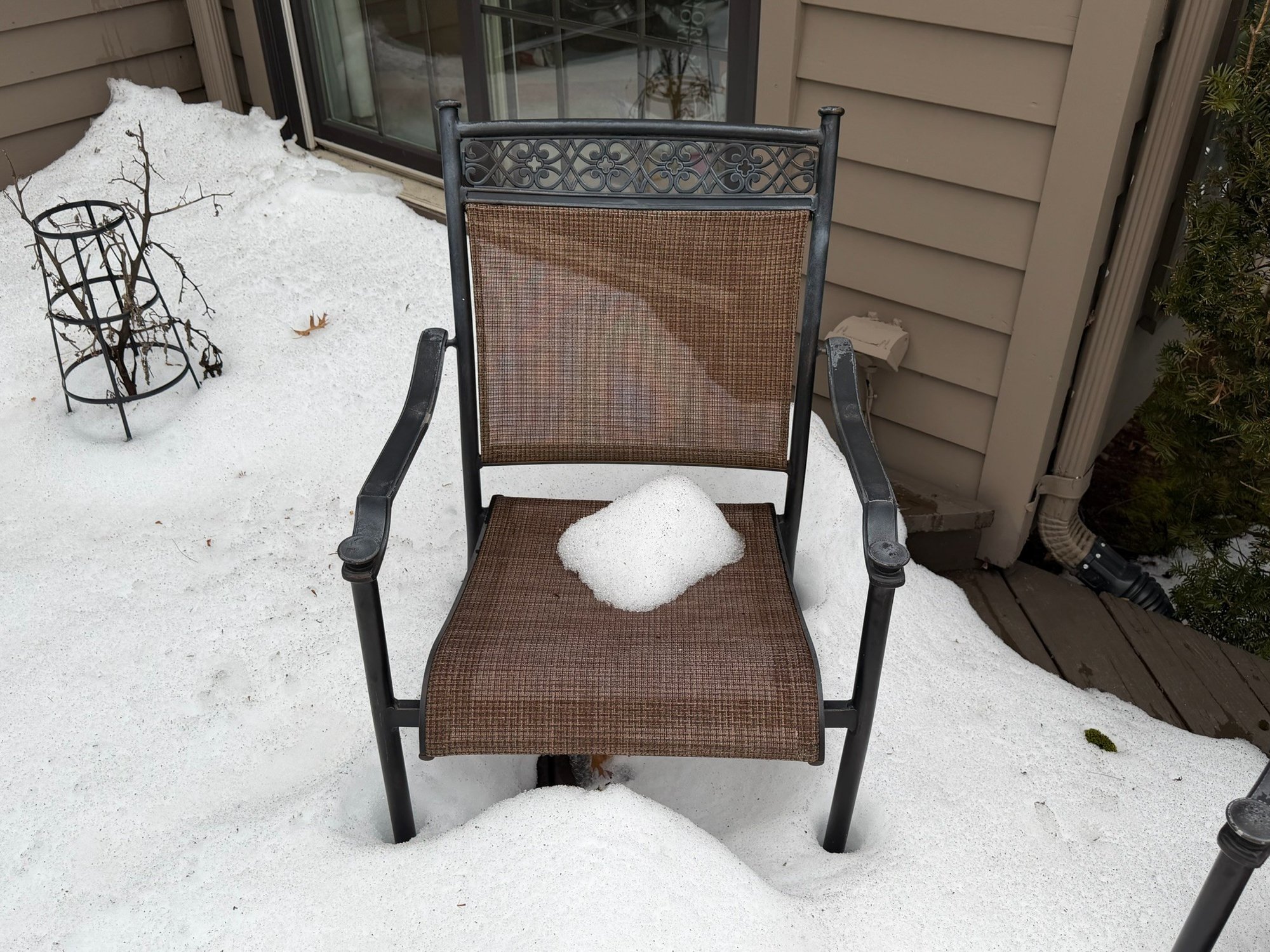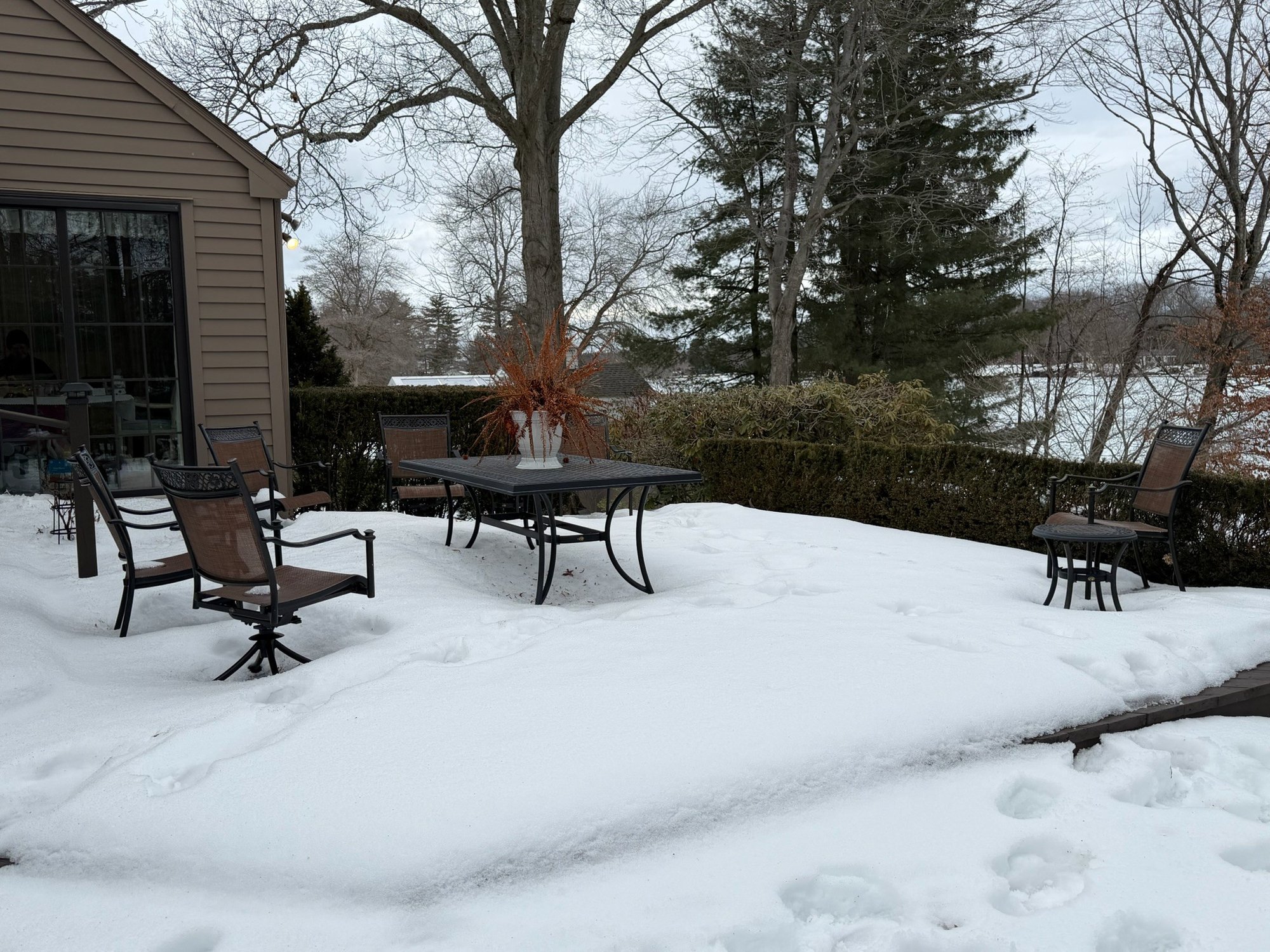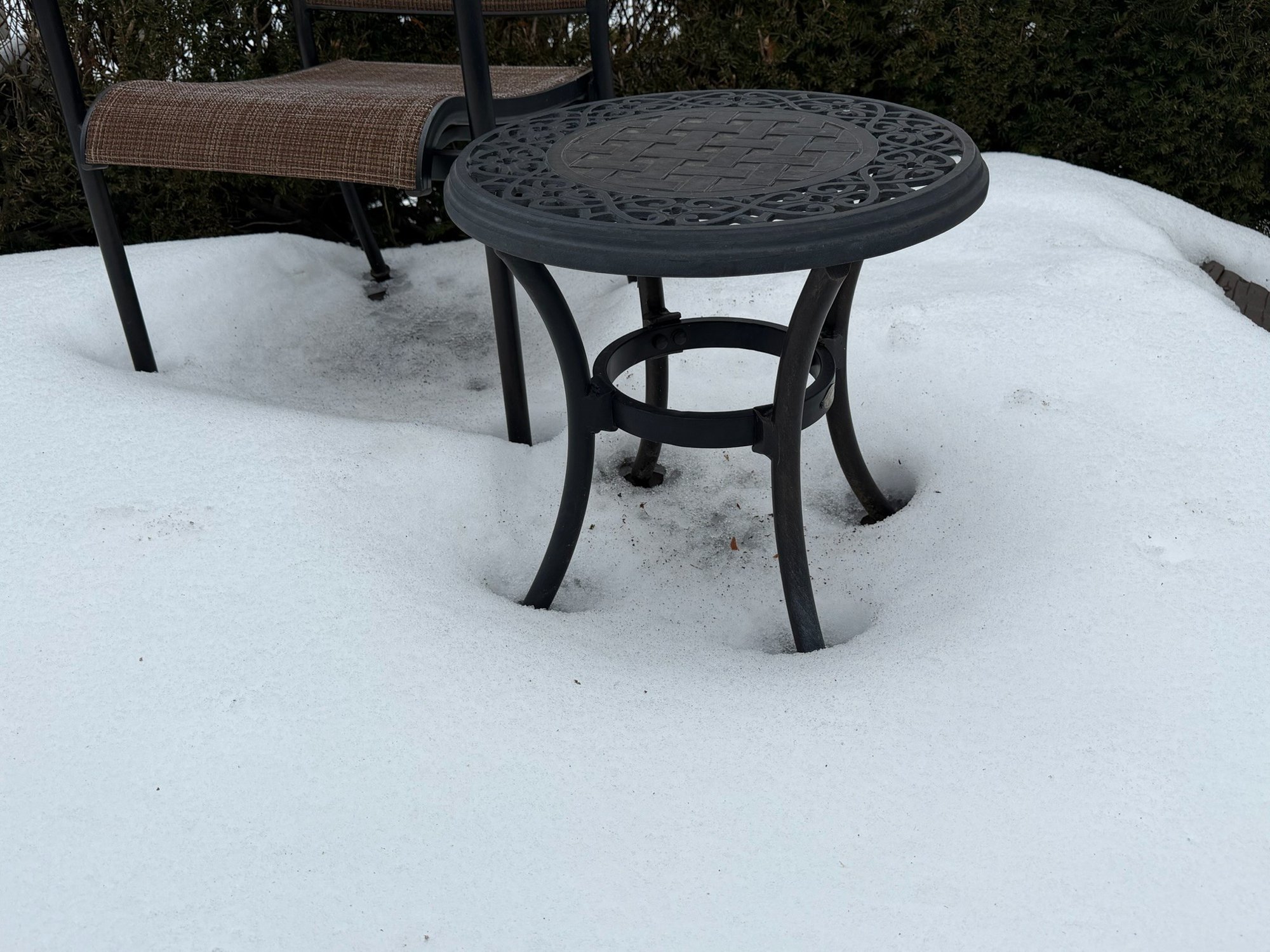 Includes table, 6 chairs, 2 side tables, has wear. Table measures 40" x 70" x 28". The white pot w/ dead plant is not included with this set. The items have some wear, not perfect.