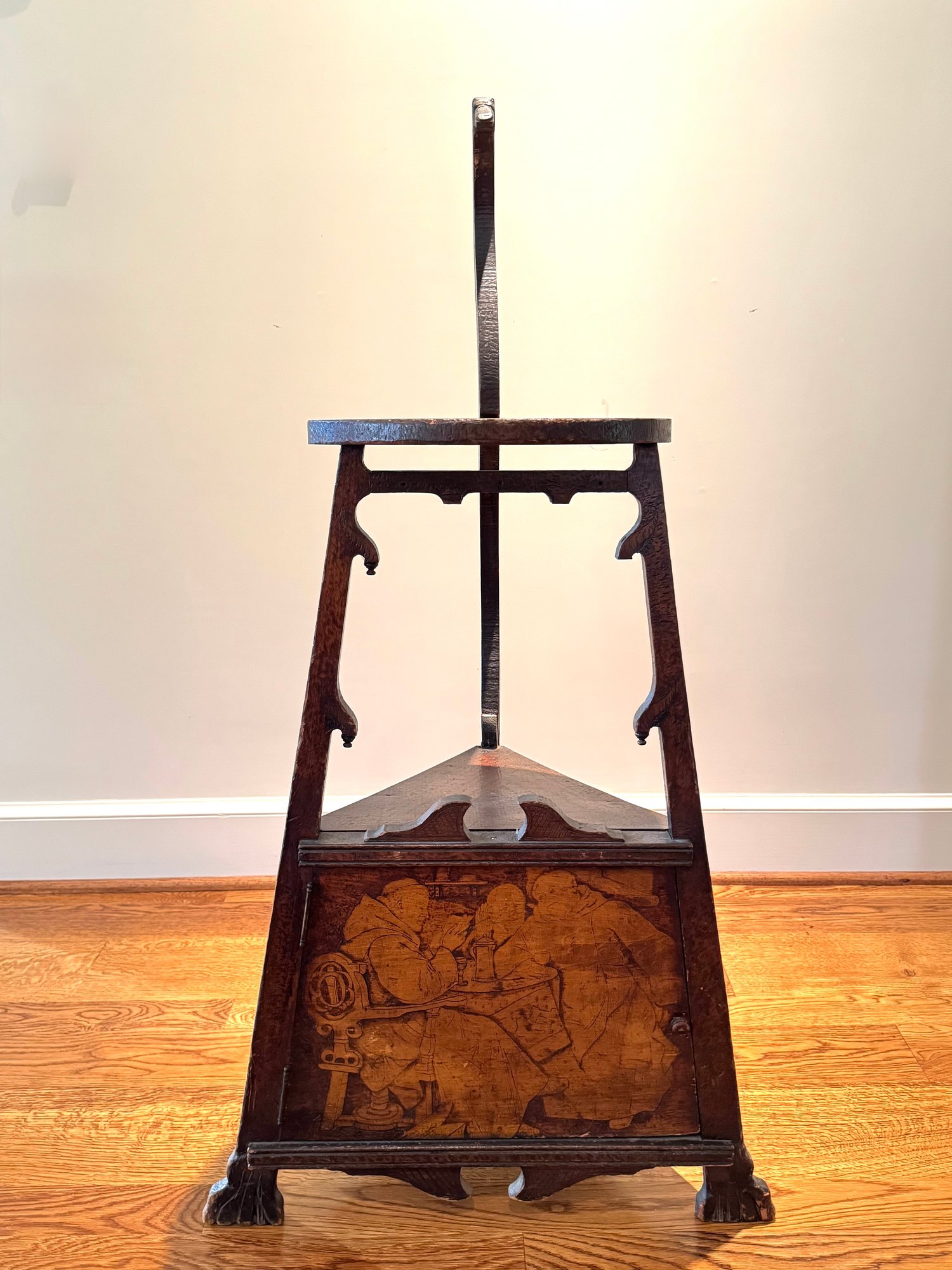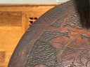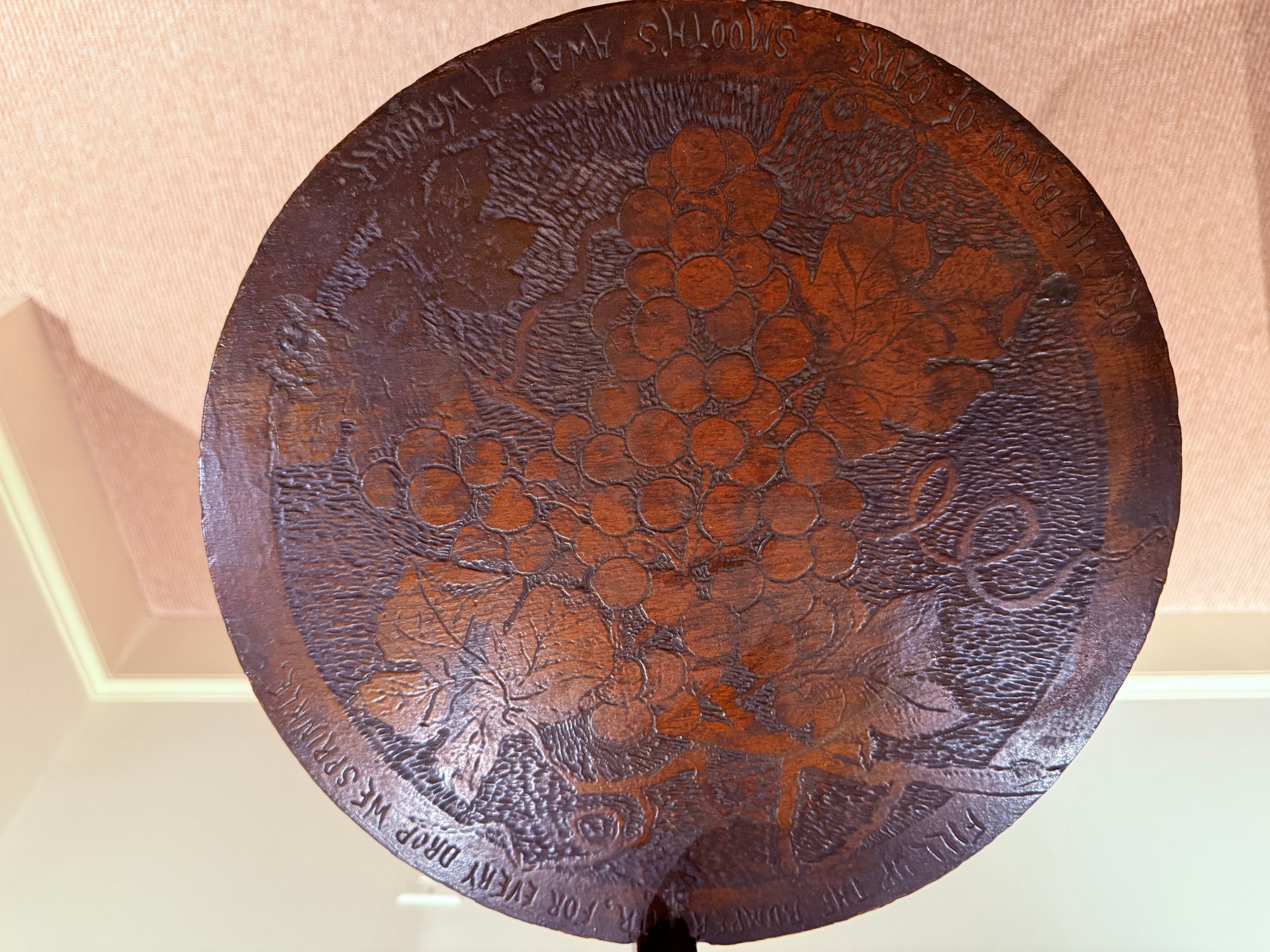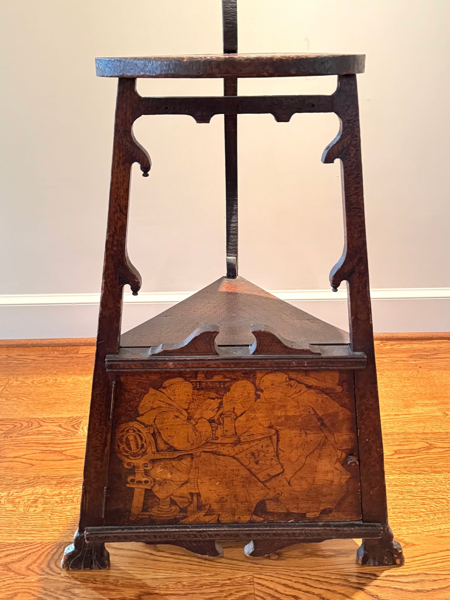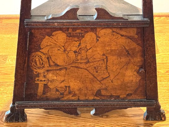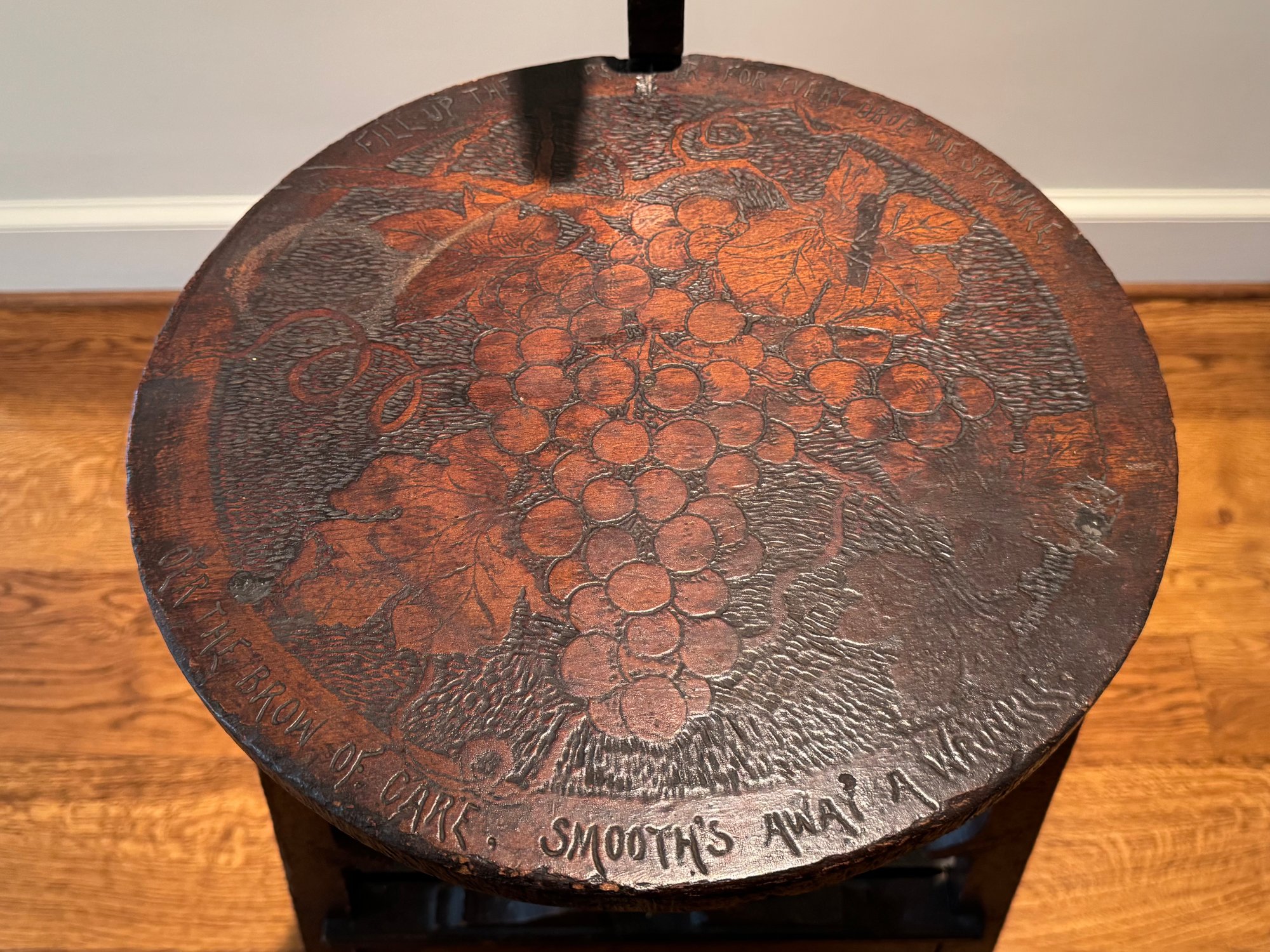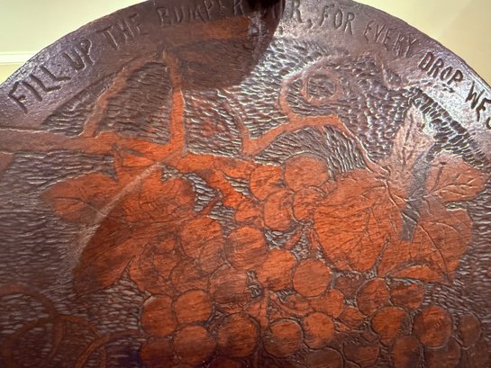 Antique hand crafted Pub table with carved grape motif and an inscription that reads: "Fill up the bumperair for every drop we sprinkle, Oer the brow of care smooths away a wrinkle". The bottom door has a carved image of Friars at work drinking. The neck is carved bird, back leg has an old repair, which needs repair, otherwise a very unique table in vintage condition. Size 46 H x 22 W
