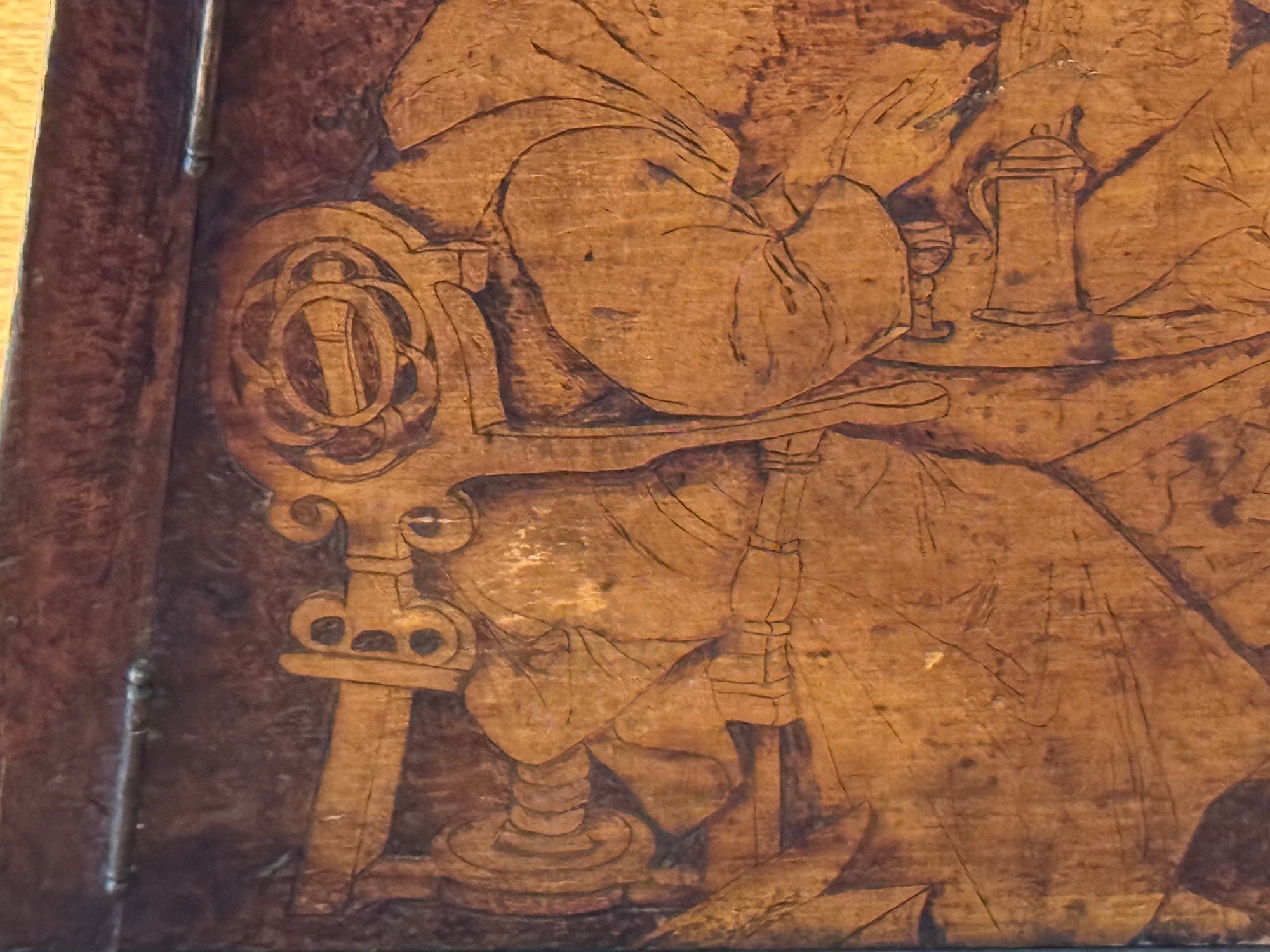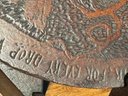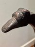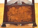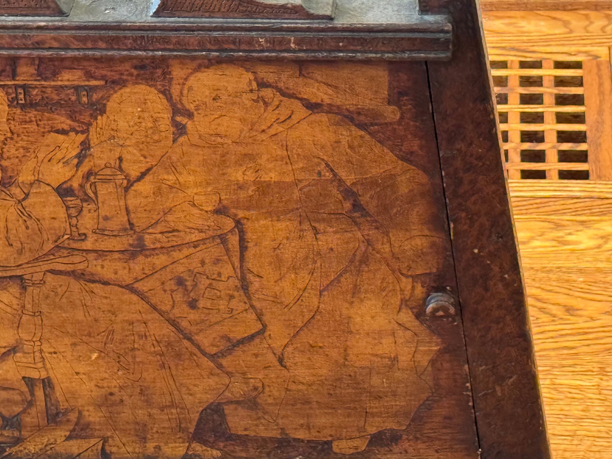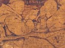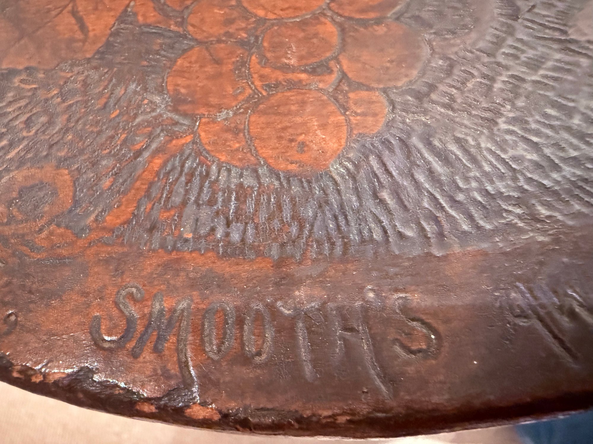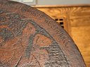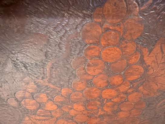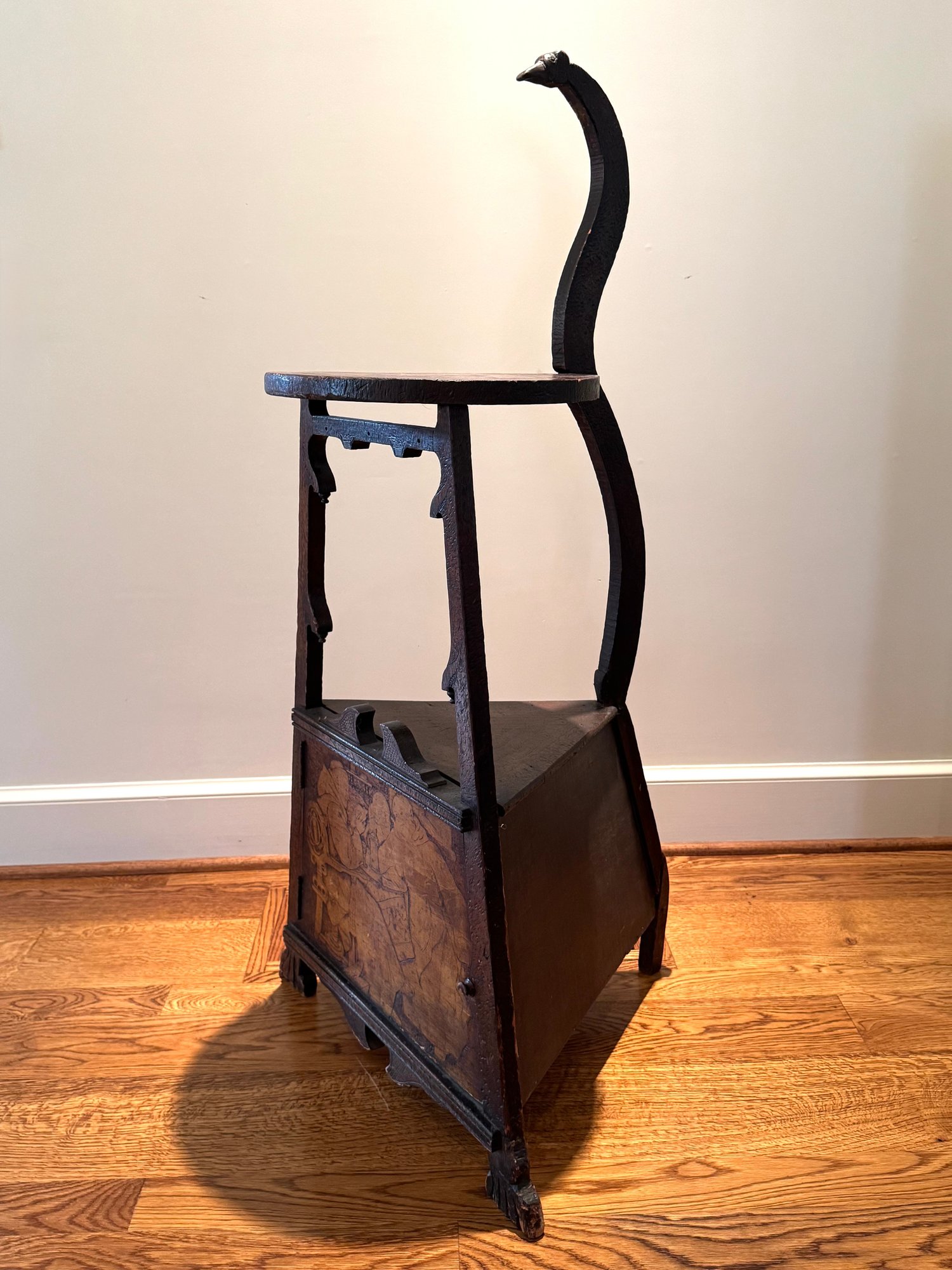 Antique hand crafted Pub table with carved grape motif and an inscription that reads: "Fill up the bumperair for every drop we sprinkle, Oer the brow of care smooths away a wrinkle". The bottom door has a carved image of Friars at work drinking. The neck is carved bird, back leg has an old repair, which needs repair, otherwise a very unique table in vintage condition. Size 46 H x 22 W
