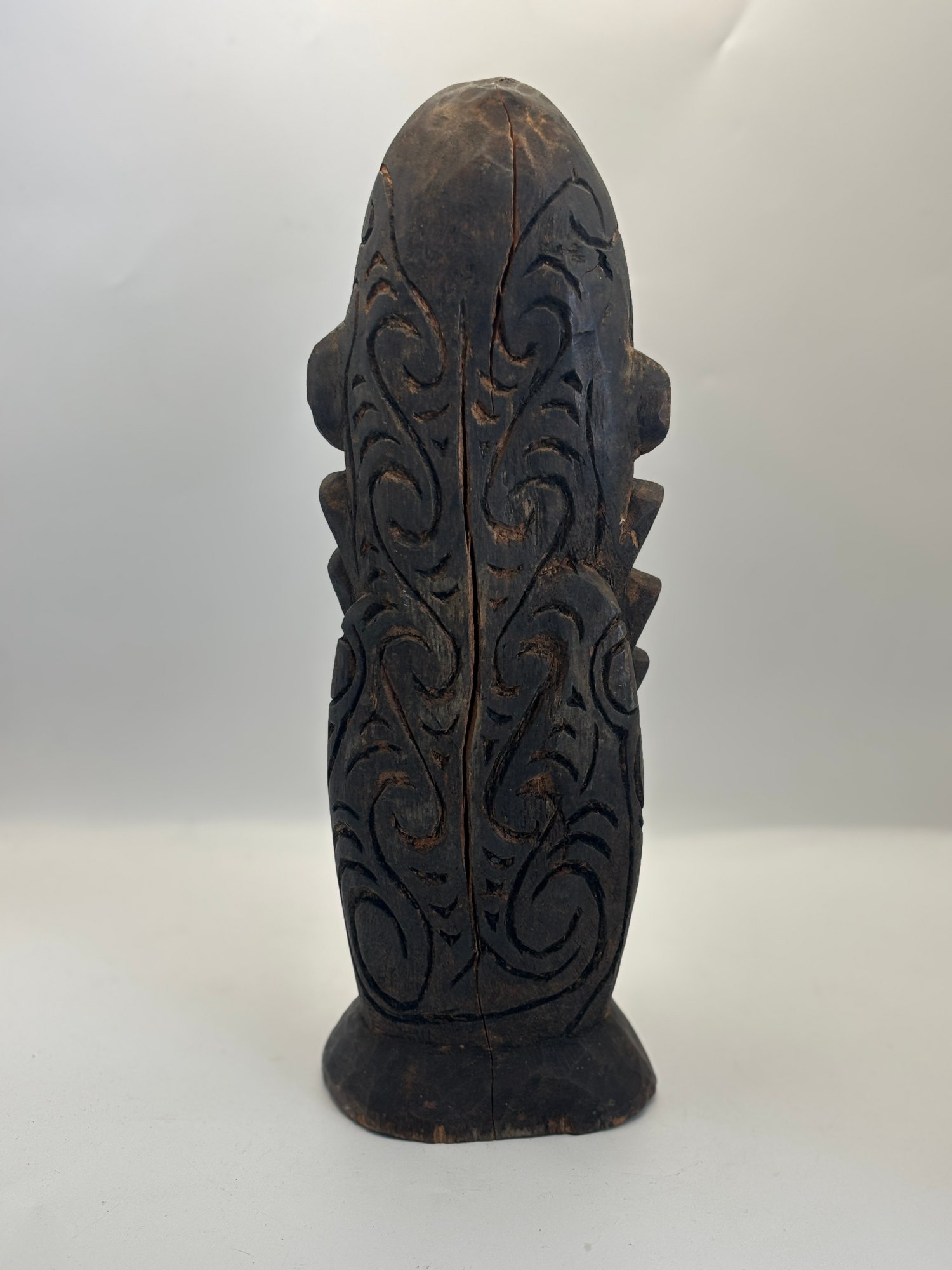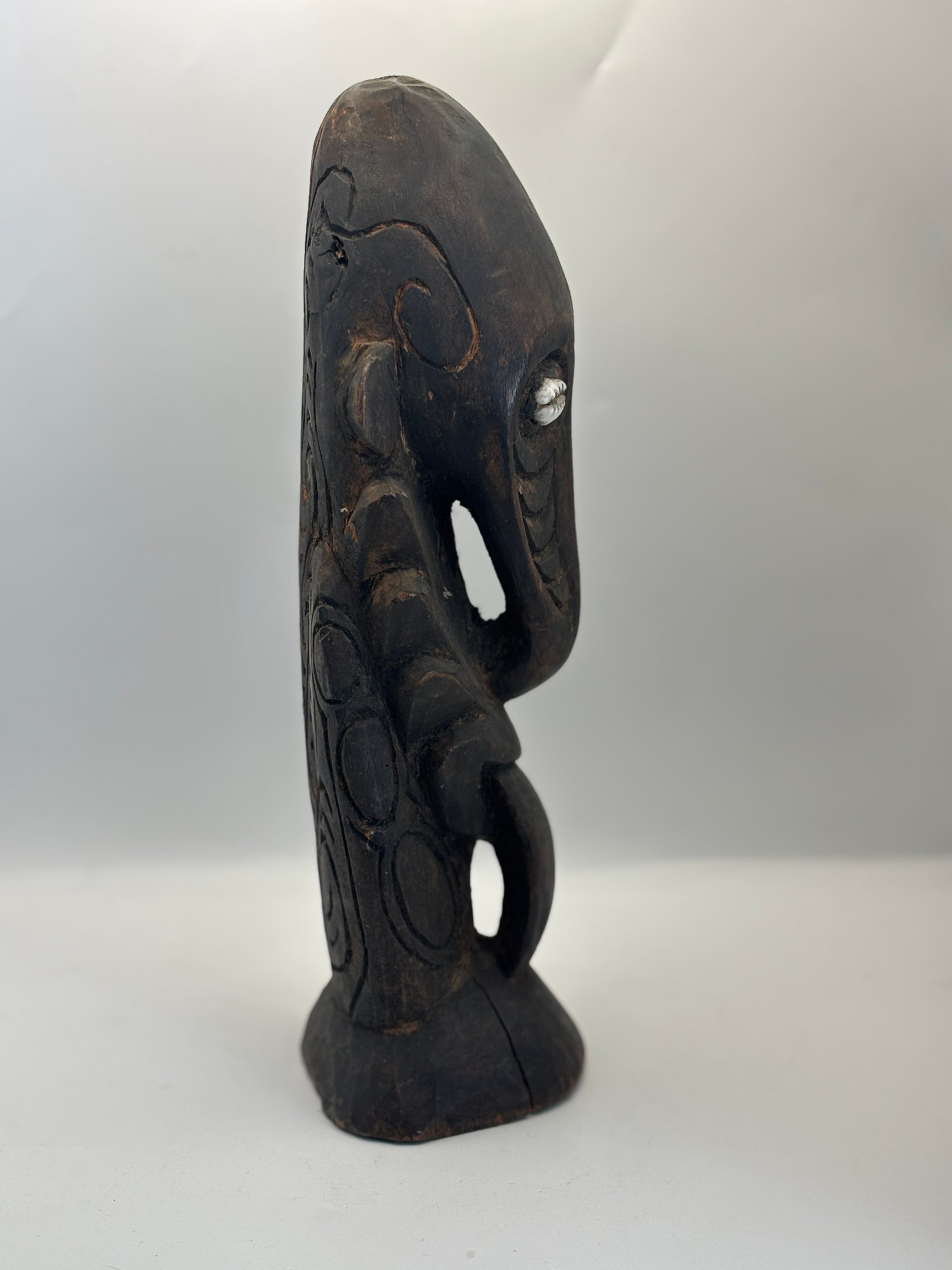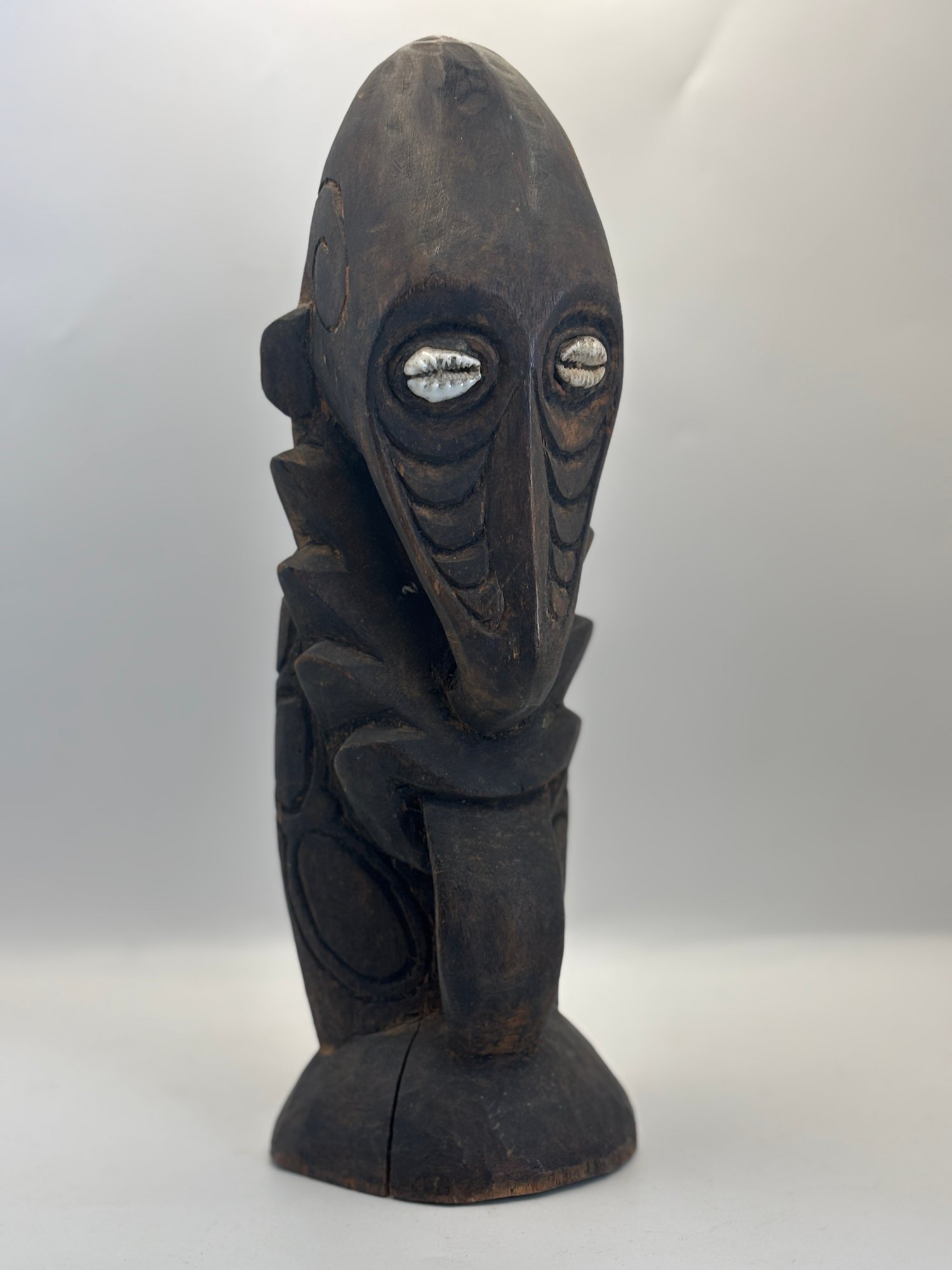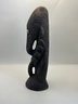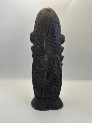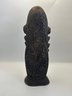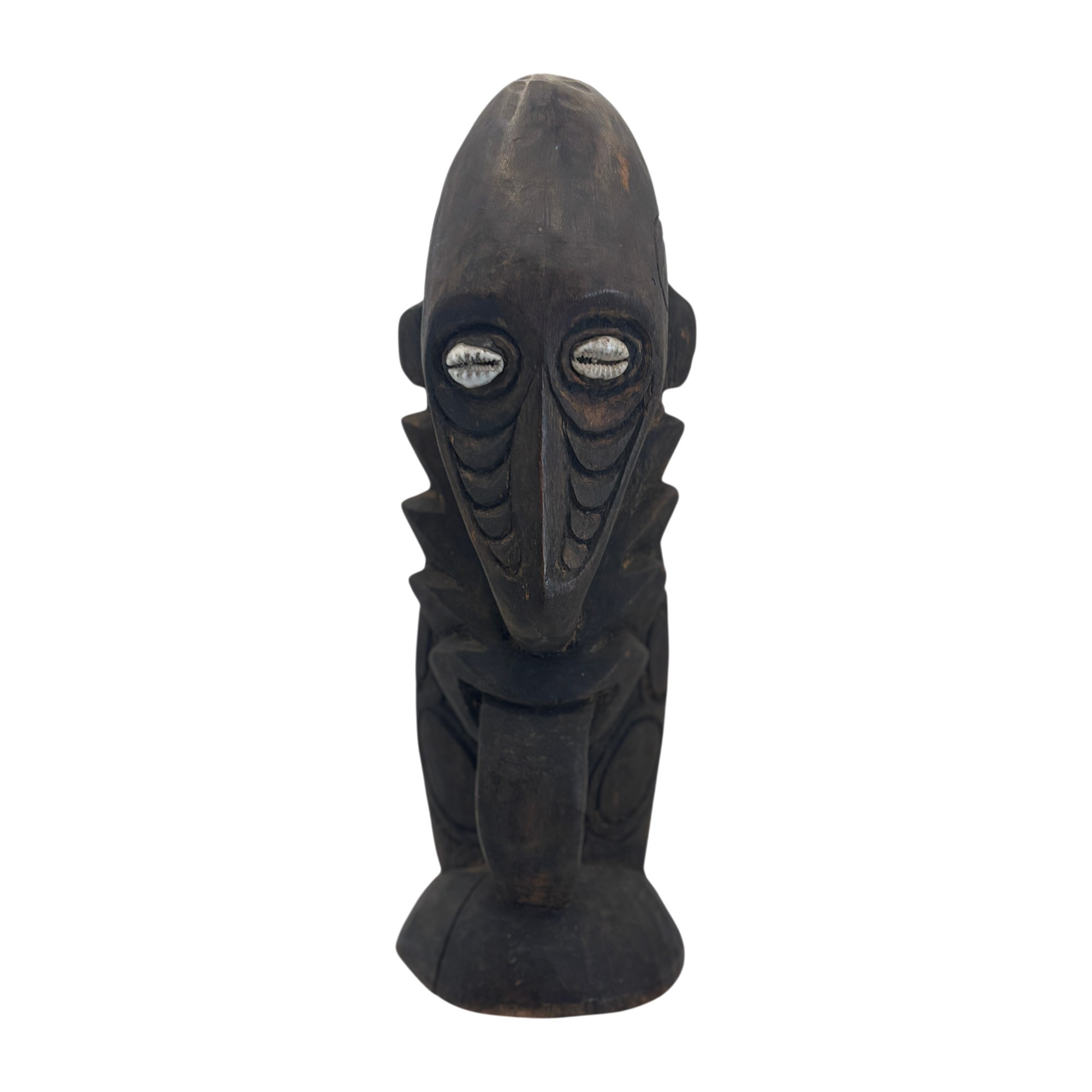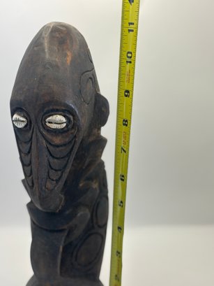 Bold hand-carved wooden figure featuring elongated facial forms, deeply incised details, and inset shell eyes that give it a powerful, expressive presence. The dark, aged surface and sculptural posture create strong visual impact, making it an eye-catching accent for shelves, mantels, or display cabinets. A sculptural piece that bridges folk art, tribal-inspired design, and modern eclectic décor.