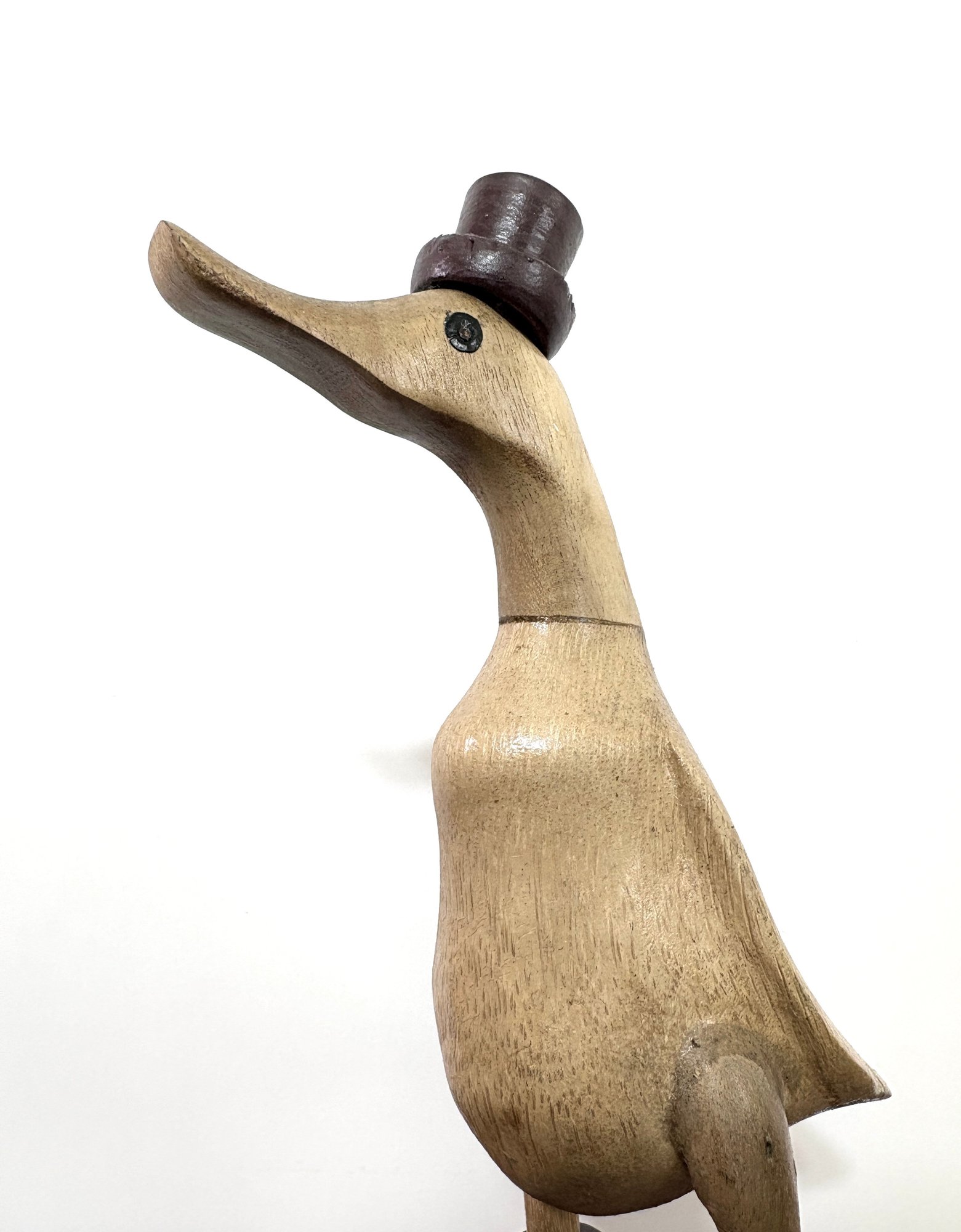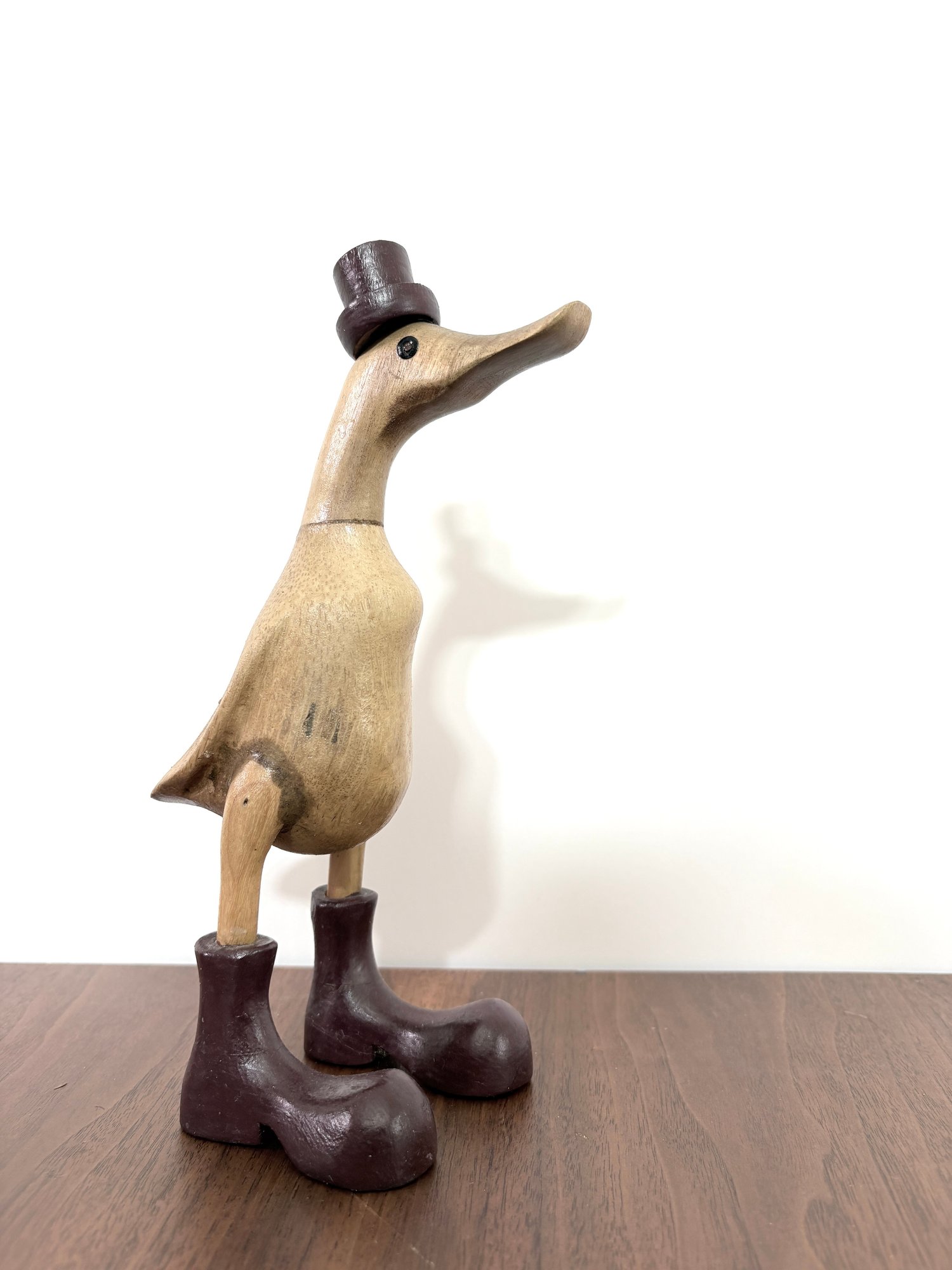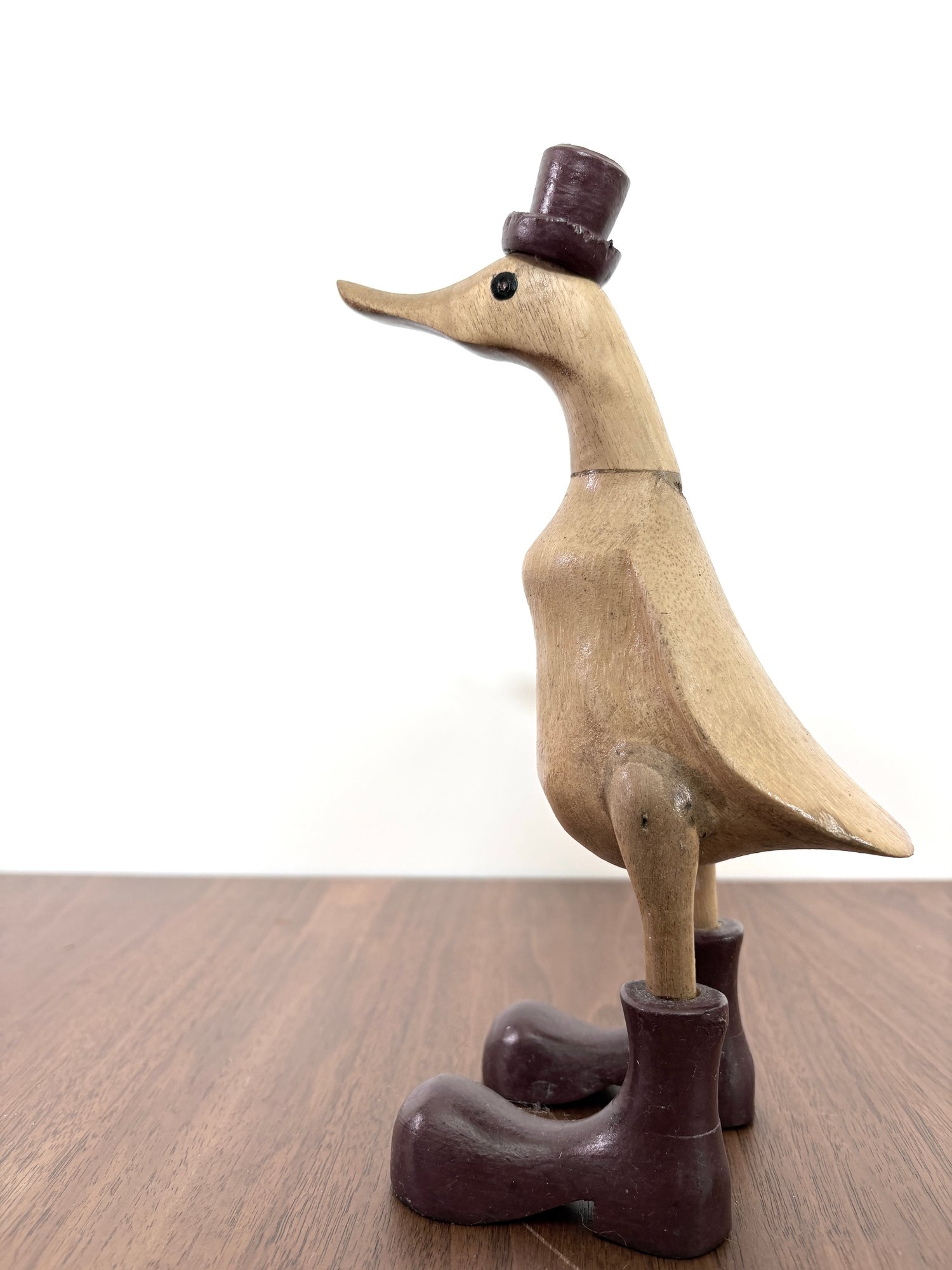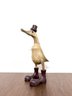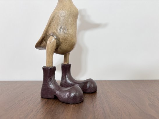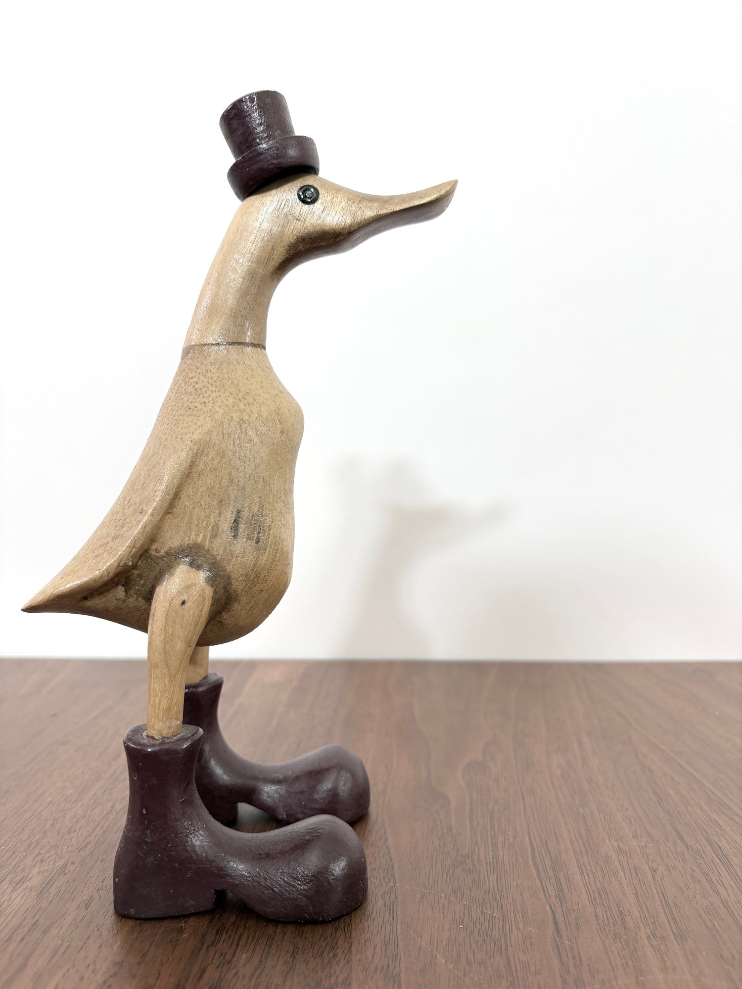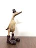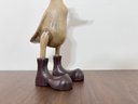 This hand-carved sculpture is a Vie Naturals Duck with Boot & Hat, often crafted in Indonesia from sustainable bamboo root and teak wood.