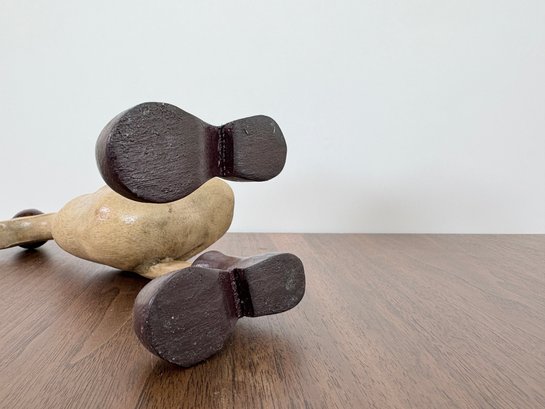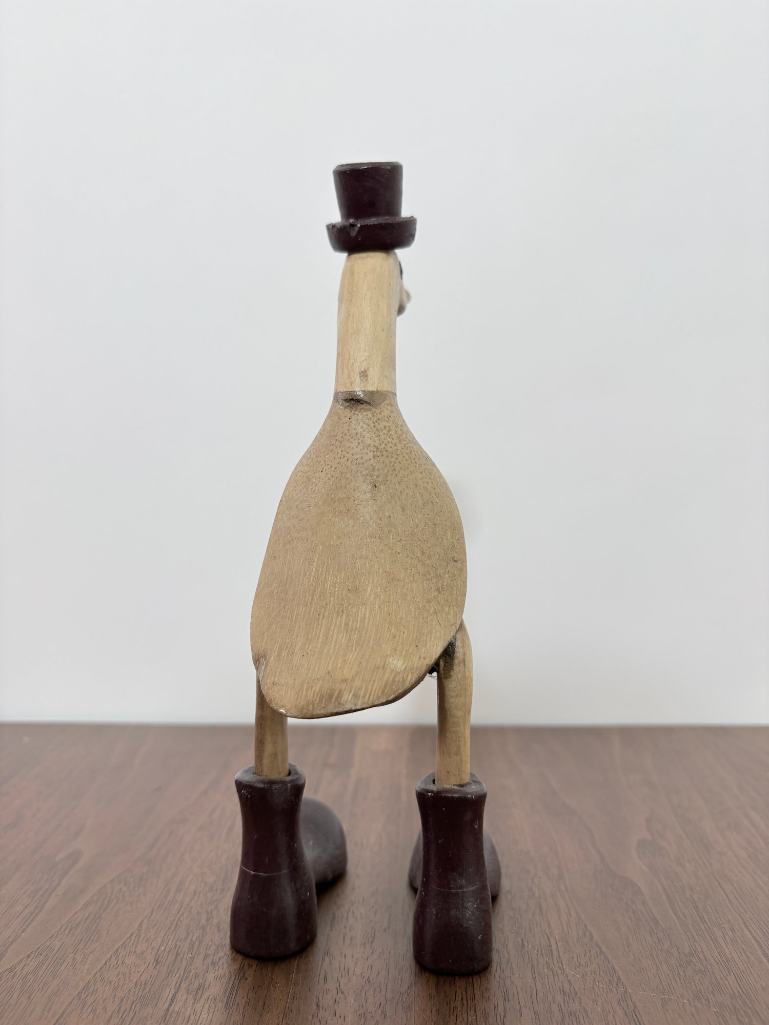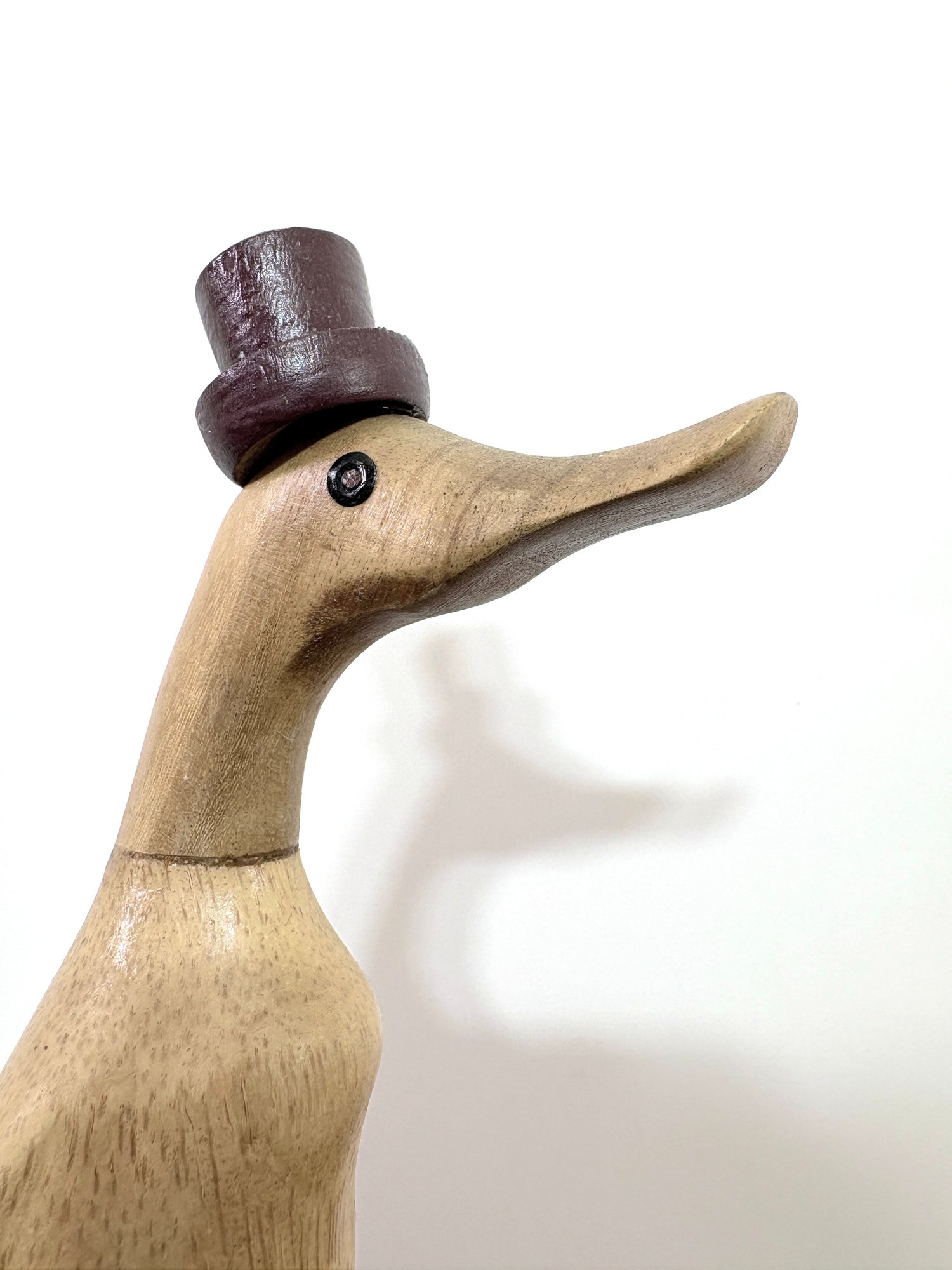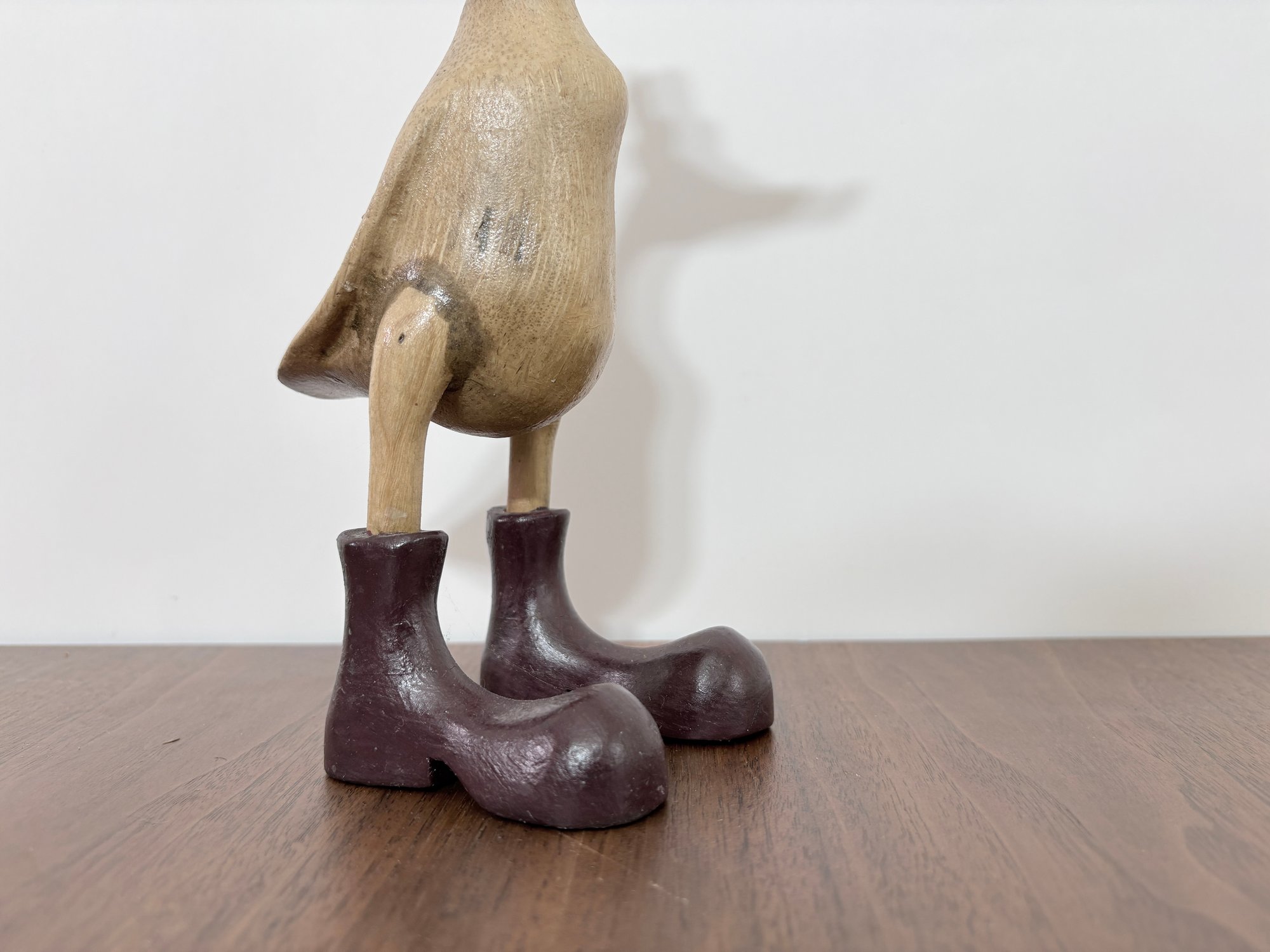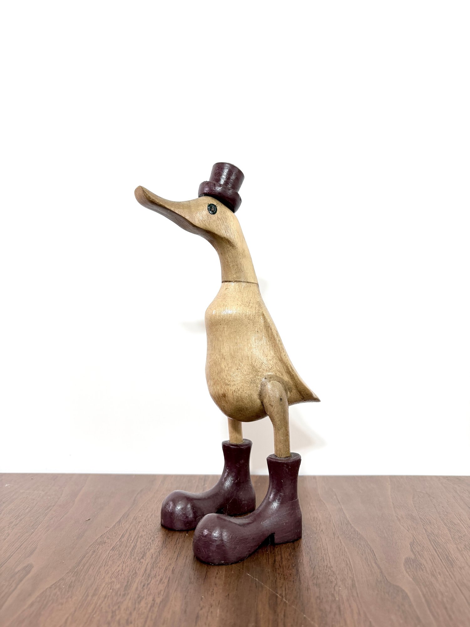 This hand-carved sculpture is a Vie Naturals Duck with Boot & Hat, often crafted in Indonesia from sustainable bamboo root and teak wood.