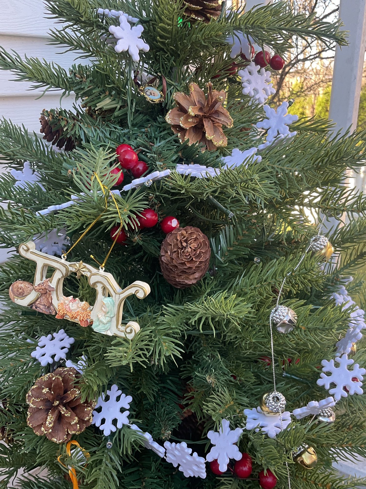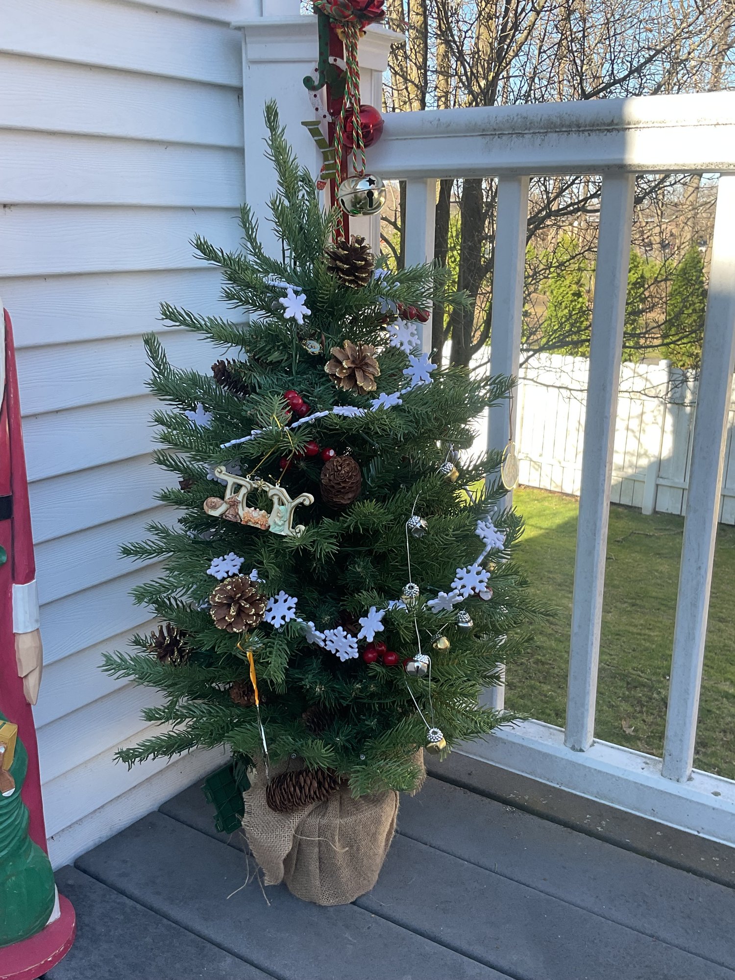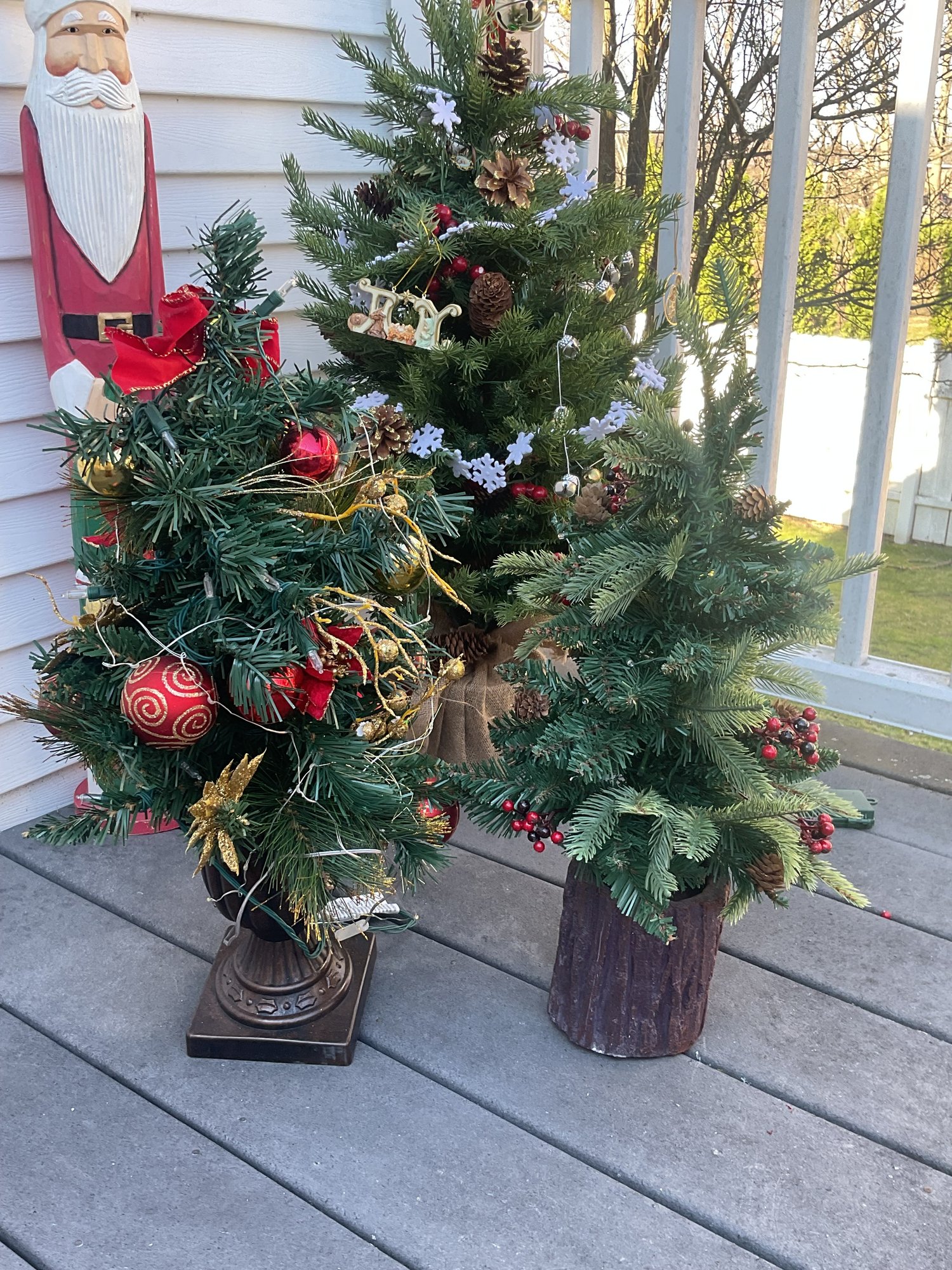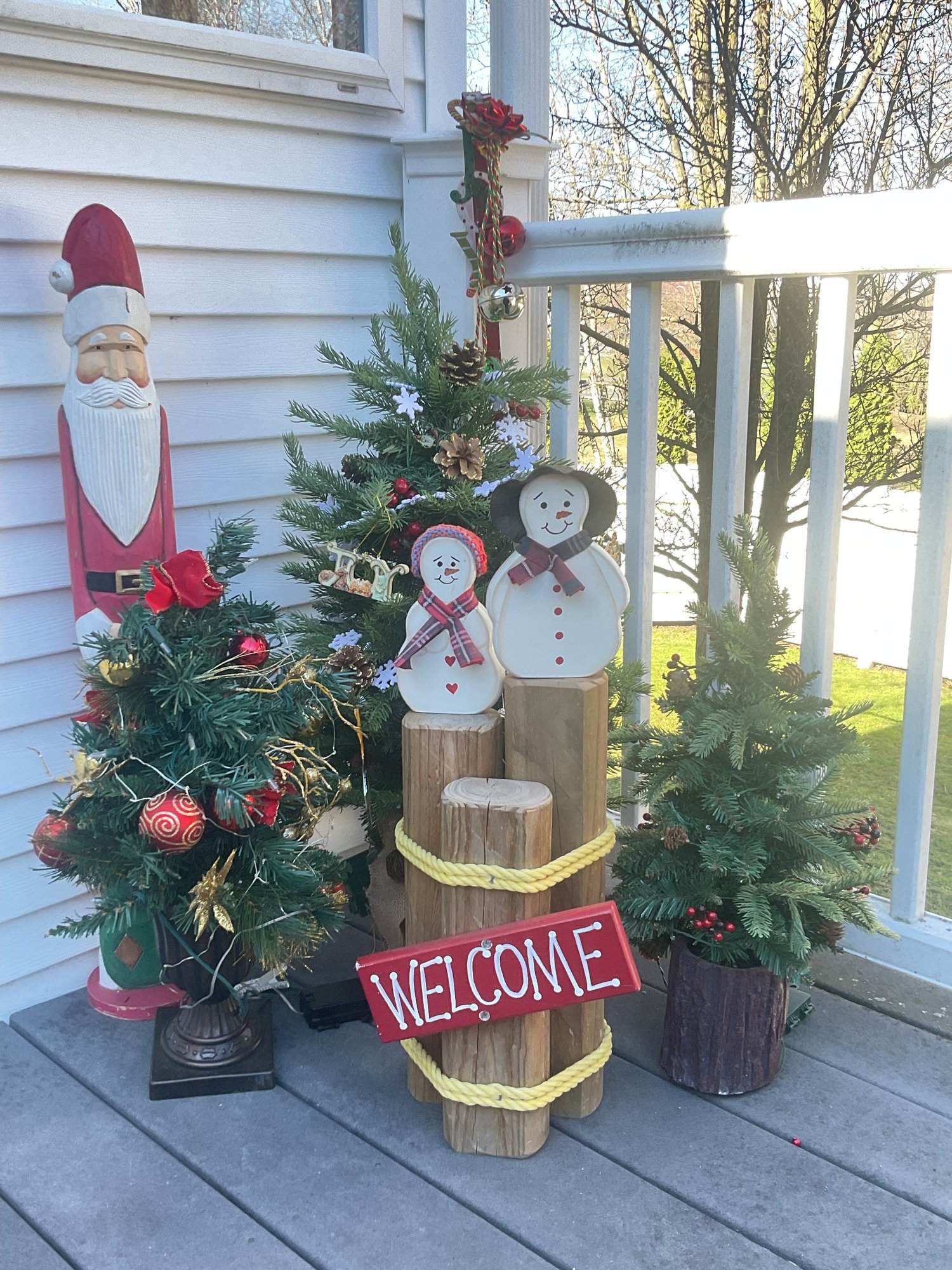 Complementing the Santa is a unique coastal-inspired snowman display, featuring two cheerful snowmen perched atop weathered nautical pilings wrapped in yellow rope, complete with a "Welcome" sign. The set also includes two miniature decorated evergreen trees and a festive metal "JOY" over-the-door hanger. Perfect for a covered porch or entryway, these pieces offer a warm, folk-art aesthetic for the winter season.