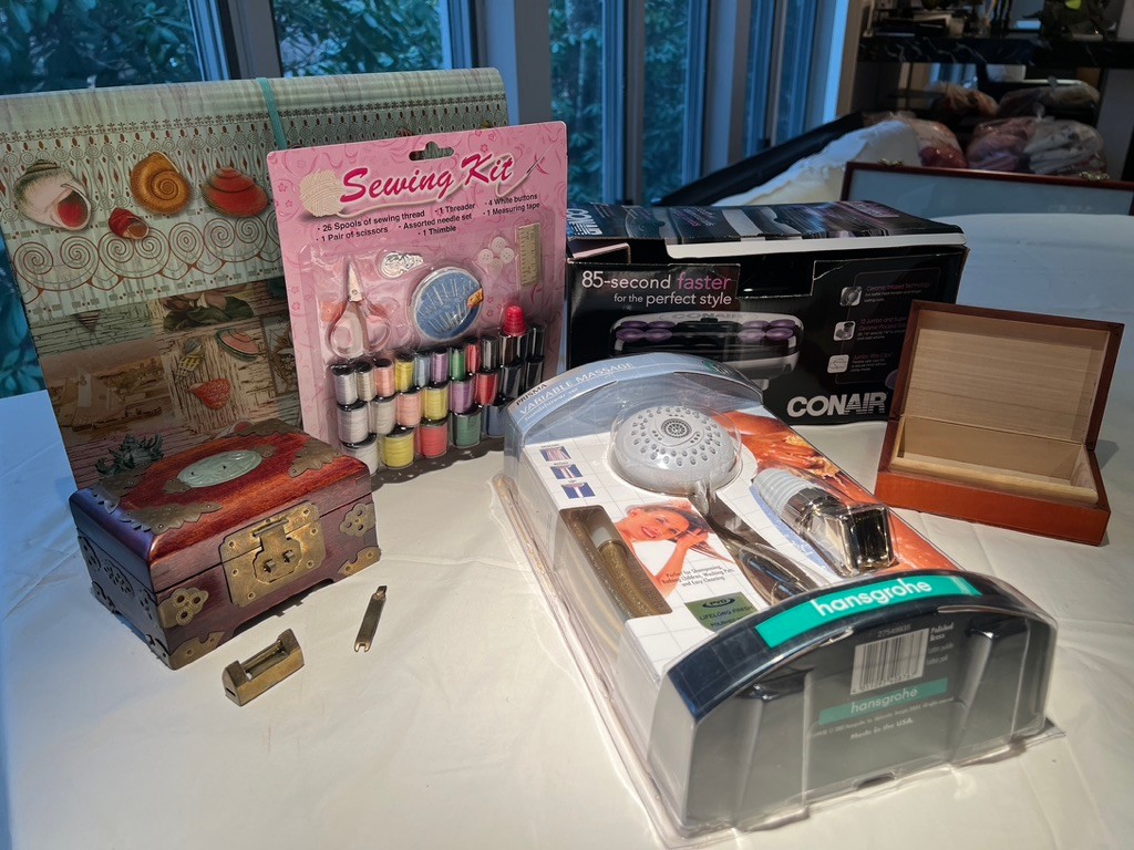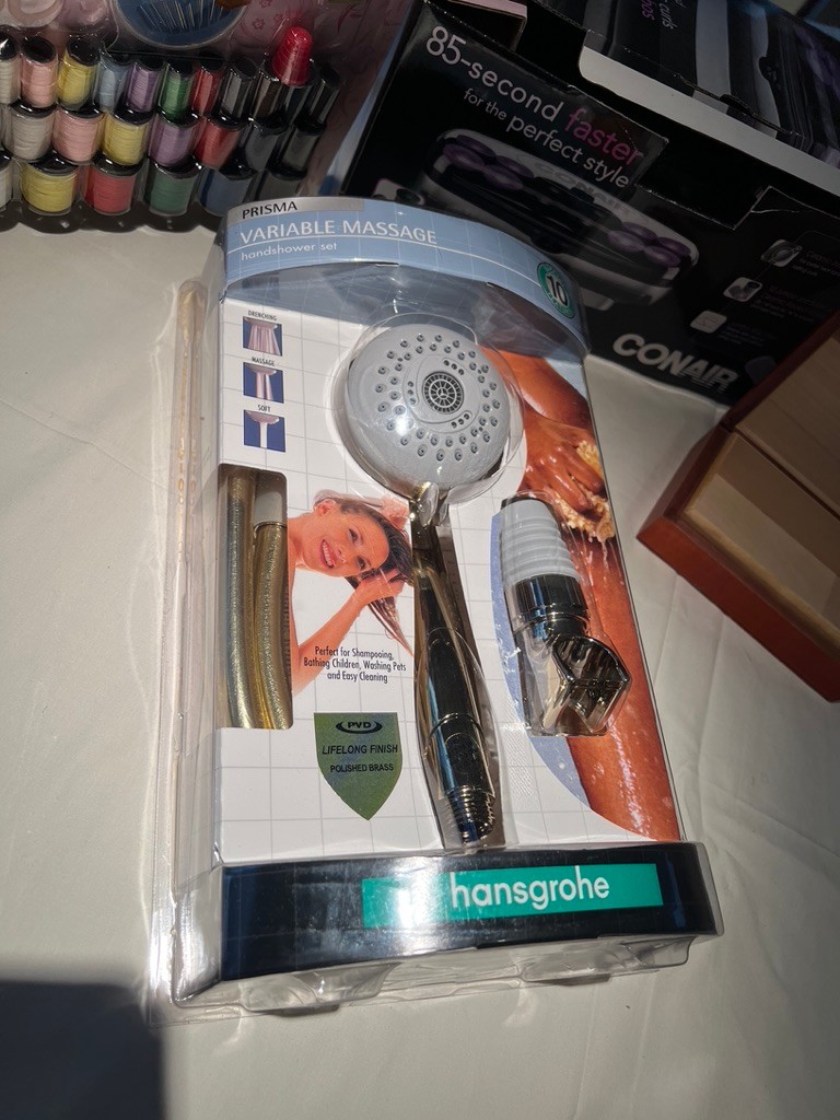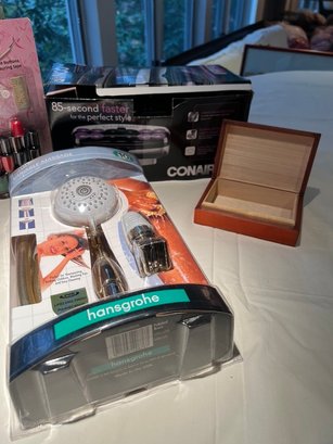 hand held shower from Hansgrohe, electric curlers, jewelry box w/ lock!, file folder,