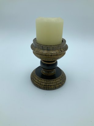 This is a finely hand-painted candle base in gold paint on black background. Appears to be in excellent condition. All over decoration and attention to detail.
