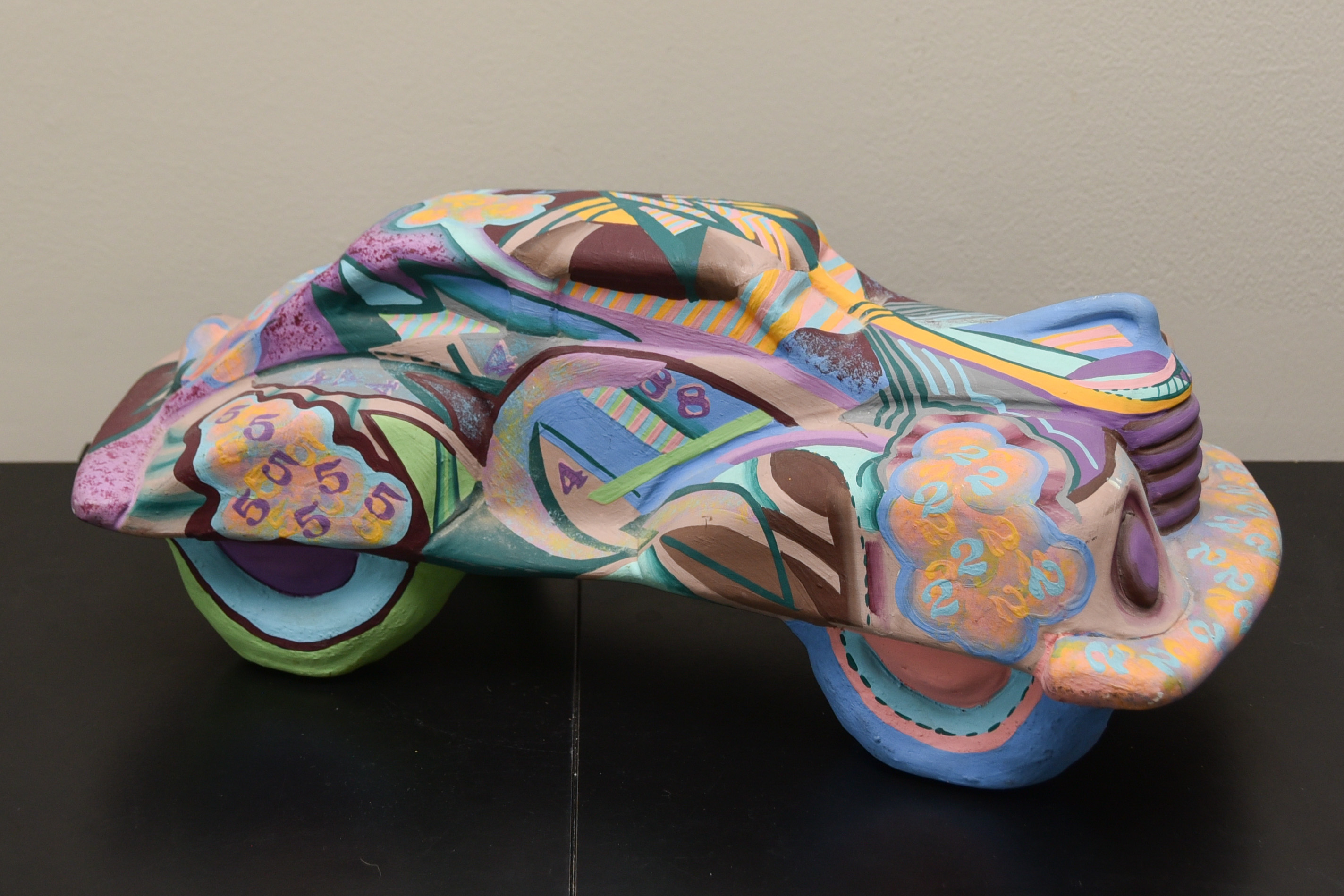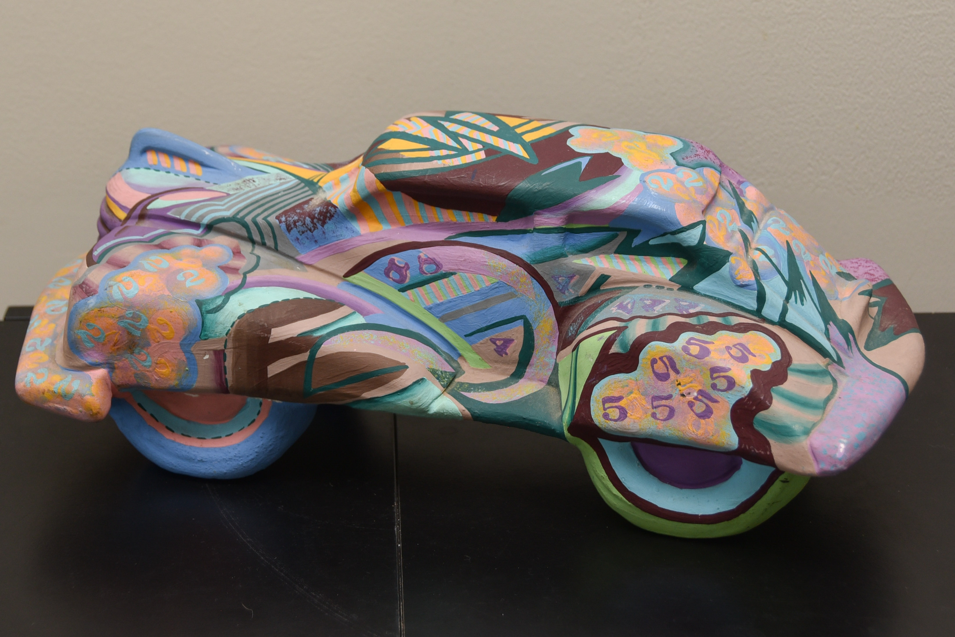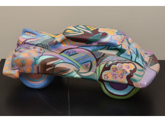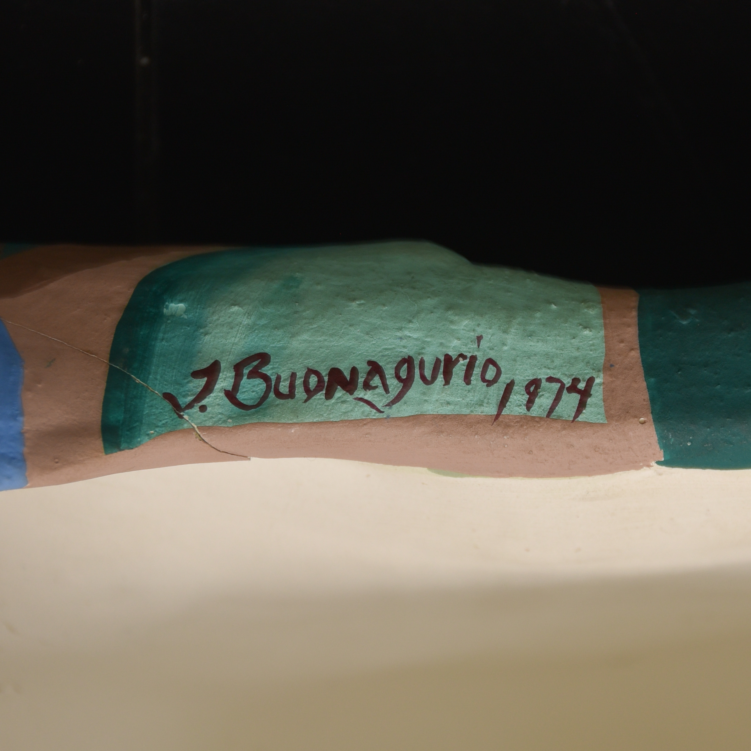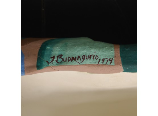 Signed J. Budnagurio 1974 on bottom. There is a crack along top of one of the wheels.