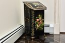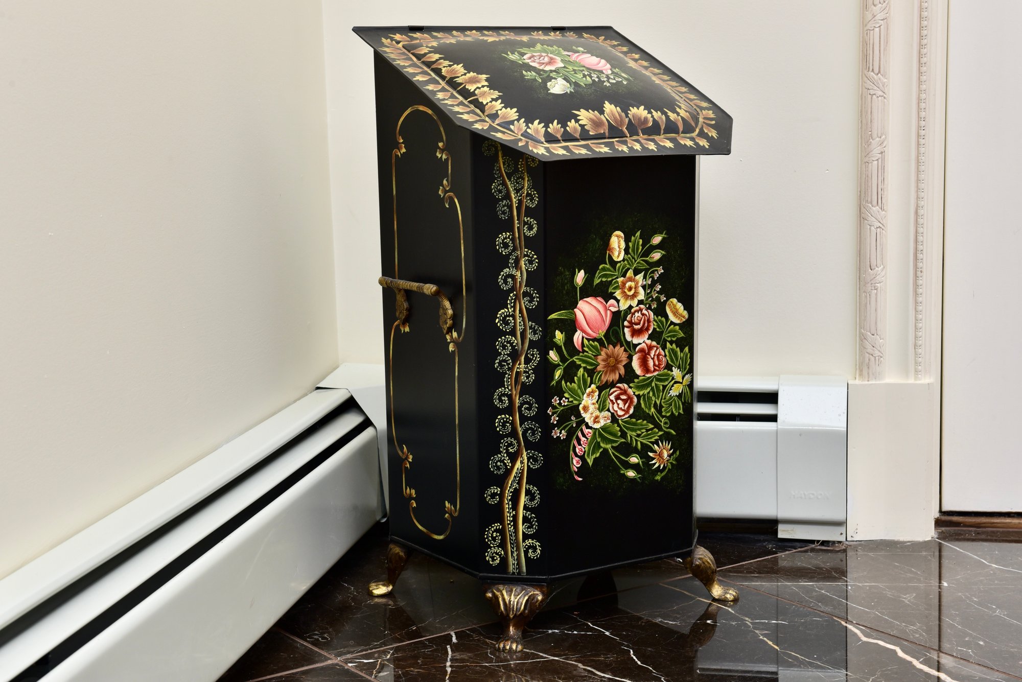 Vintage hand painted toleware Victorian style coal scuttle with floral, leaf, and vine motif, brass claw footed base, hinged lid, and two brass side handles.